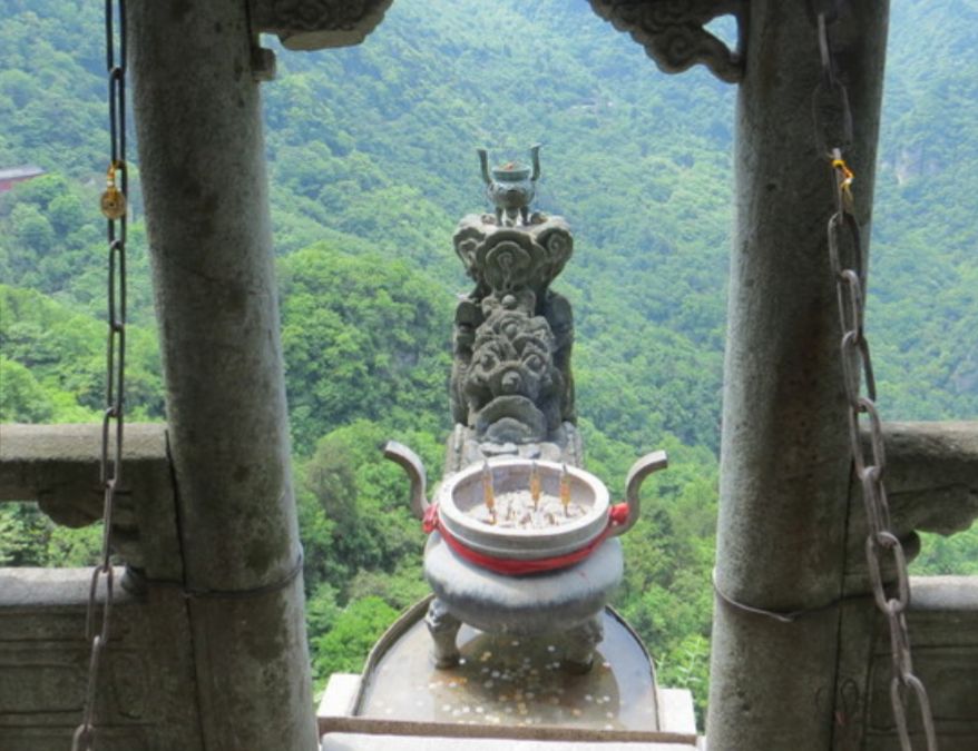 南岩玄帝殿的龙头香是必看的,但没有指示牌,要注意,龙头香所在,要穿过玄帝殿大殿然后左转。 过大殿,门口就是下面这个路牌,往左是龙头香,往右经飞升崖往梅琅祠方向。建议住宿的地方订在七星树(榔梅祠往金顶方向),这样有三个好处:一是可以不走回头路,不用再返回乌鸦岭;二是住在七星树第二天登金顶可以不用起那么早;三是,这一段走得人少,风景不也错,尤其是飞升崖那一段。