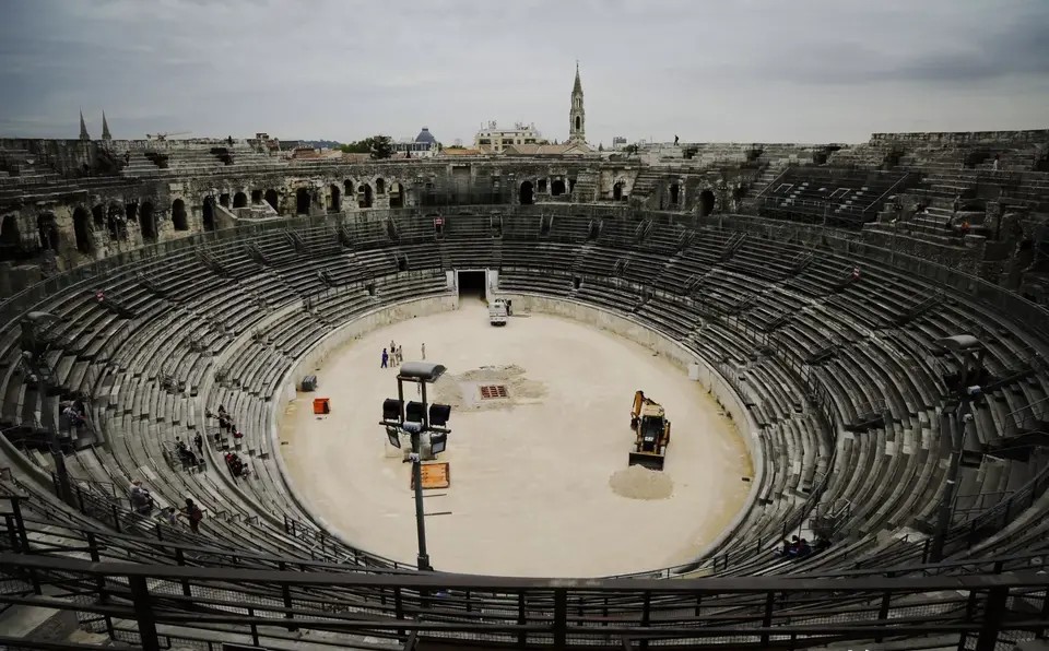 竞技场内的表演场地东西长131米,南北长100米,站在竞技场顶层看台,便可眺望整个尼姆小城的风光