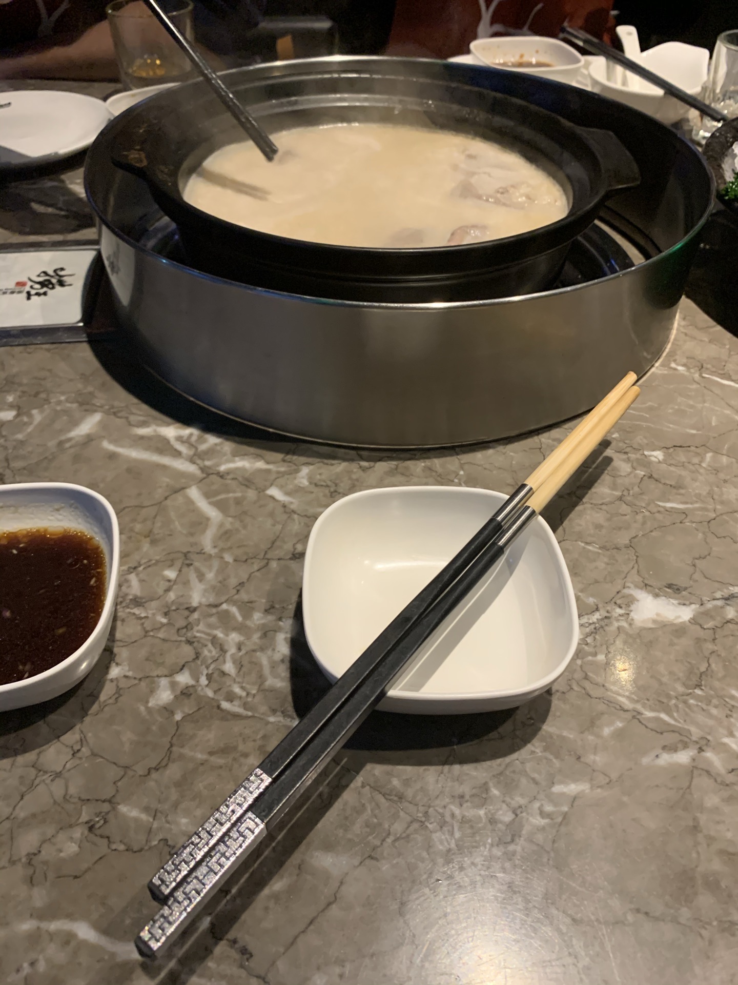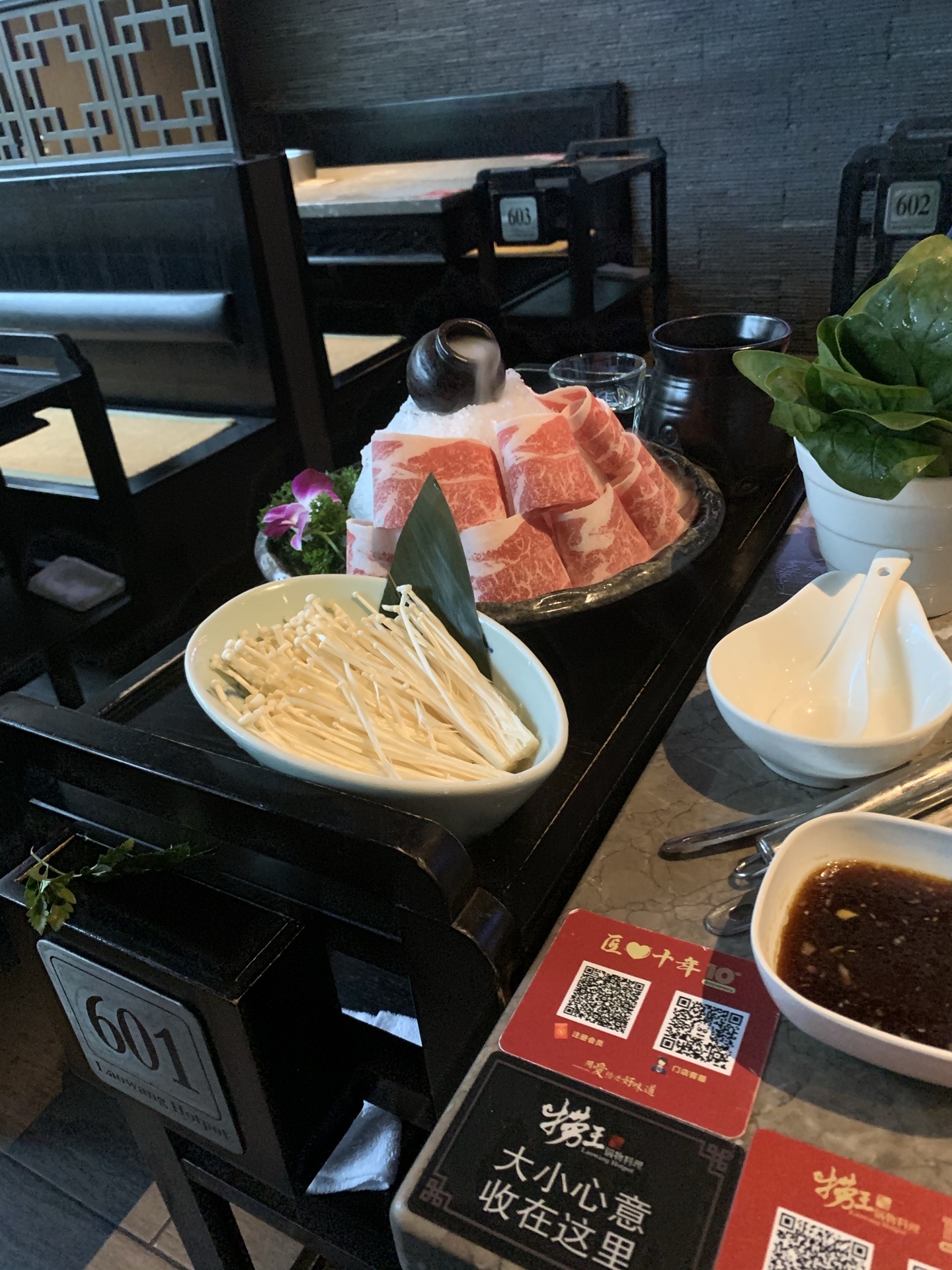 捞王在众多的火锅店中因为猪肚包鸡为主打 表现的一直都很不错 由于已经复工 这里甚至还要等位置 点菜需要用自己手机 没有菜单对老人家来说还是不太方便 不过猪肚包鸡的猪肚味道很棒 汤里的胡椒味正好的把控都看得出很讲究 羊牛肉和虾滑等都算比较新鲜 店面环境也很不错