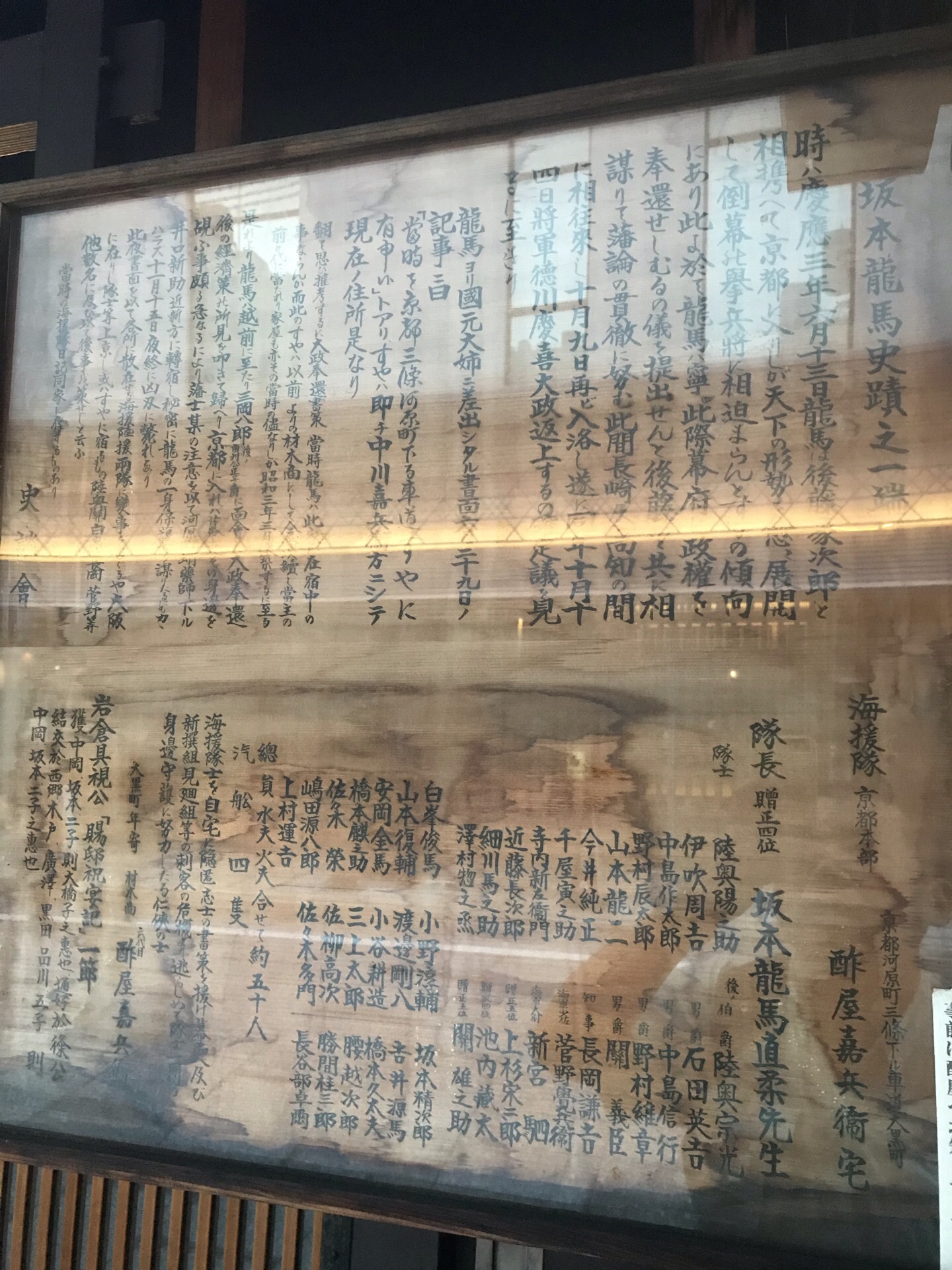 吃完晚饭出来,从小巷走过,看见石碑上刻着:坂本龙马,也是一阵惊喜,无意路过坂本龙马的在京都曾经居住的地方。坂本龙马作为明治维新时期的重要人物,在很多书籍上熟知,现在这里是一个小型展馆,楼下还是一个手作工作室,非常的不错!