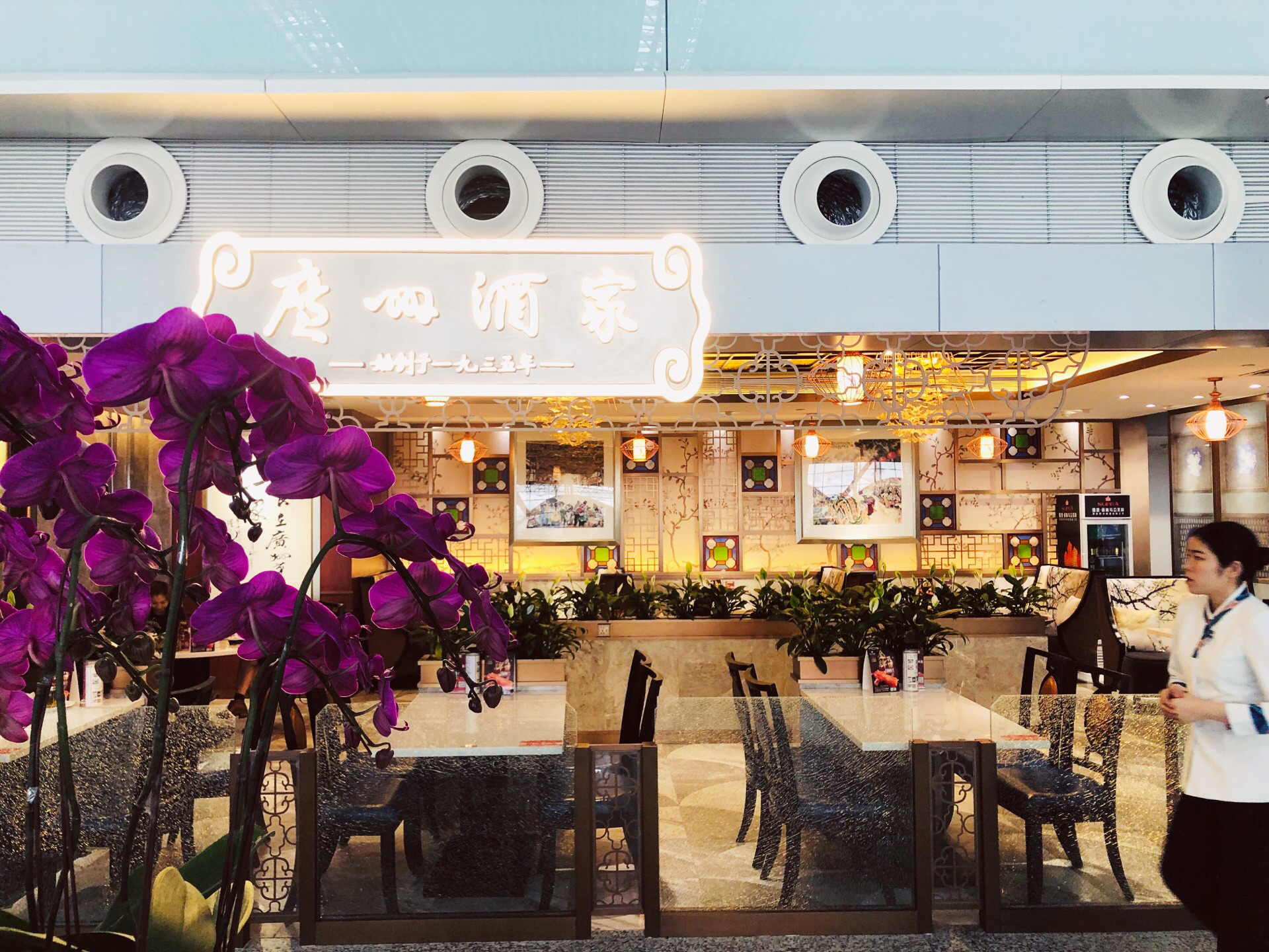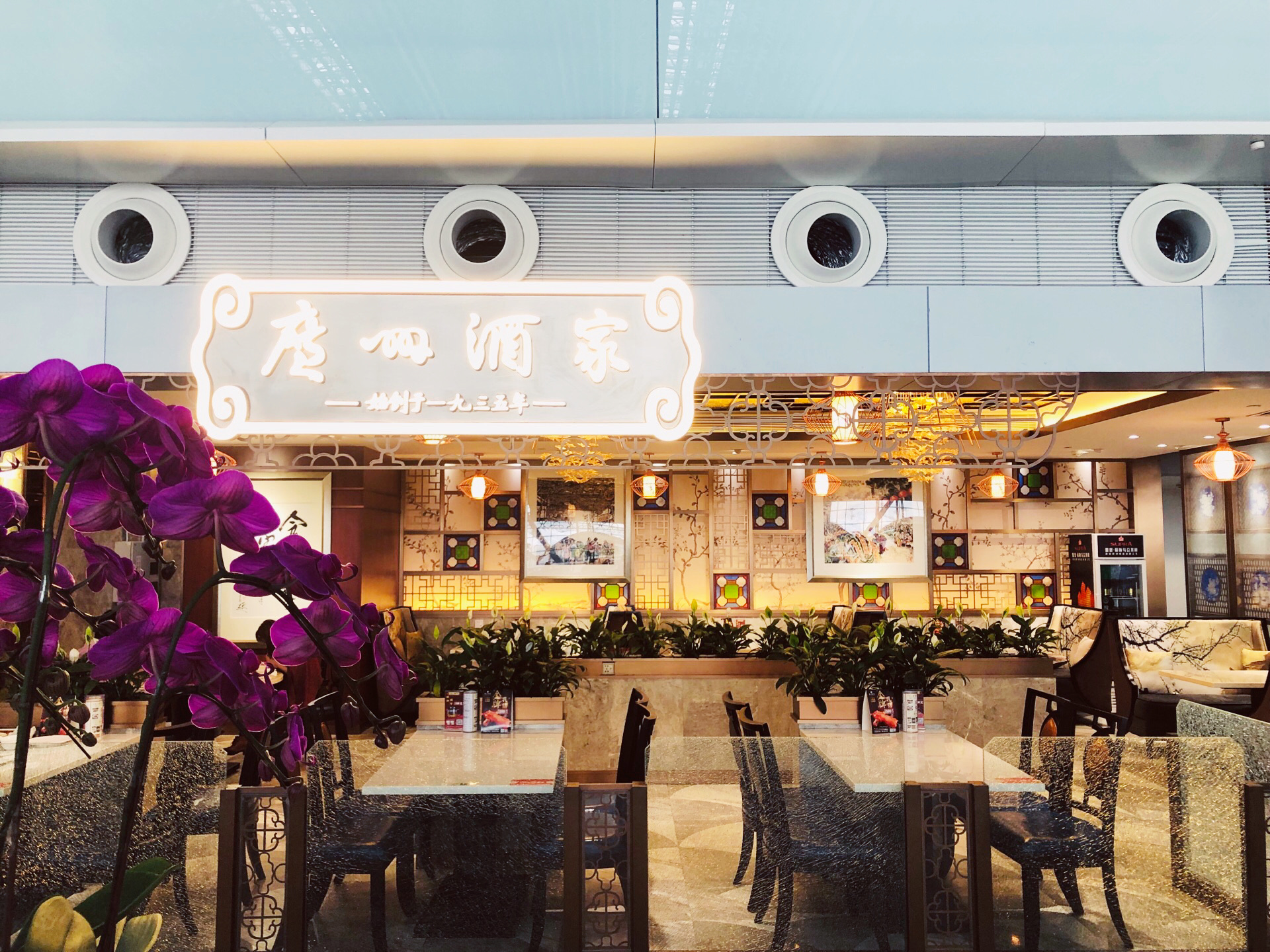 万没想到机场会有广州酒家,岂有不大吃一顿的道理[调皮] [薄荷]环境: 虽然是开放空间,仍是在尽量精致的布置环境--桌椅茶座、鲜花背景,一看都是花了心思。 「乳鸽」 在广州那几天不记得吃过烤乳鸽,要离开了赶紧点一个不留遗憾。 鸽子火候合适,皮酥肉嫩,鲜美多汁,个头虽小,一点儿不干,口感滑润。 「客家红糖核桃包」 这属于吃之前觉得腻,吃起来停不了。红糖和干果配搭的口感醇厚扎实。 「至尊鲍汁叉烧包」 到广东不吃叉烧好像有点儿不太讲究,鲍汁调停,更鲜更有牵扯。 「干炒牛河」 写到这才发现,当时点的这几个很有代表性嘛[得意] 牛河咸鲜顺滑,游刃有余,牛肉软嫩弹牙。 [服务铃]服务: 态度肯定不如独立门店周到,没什么存在感