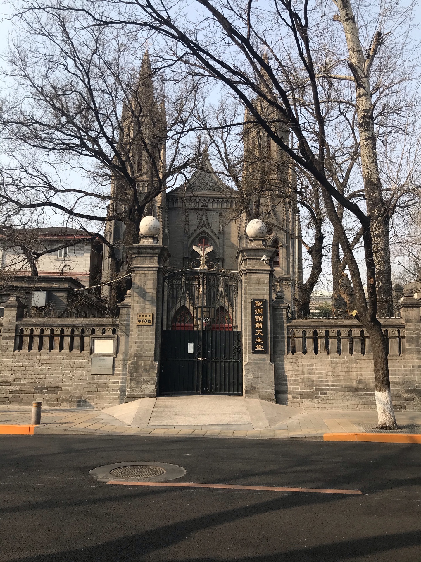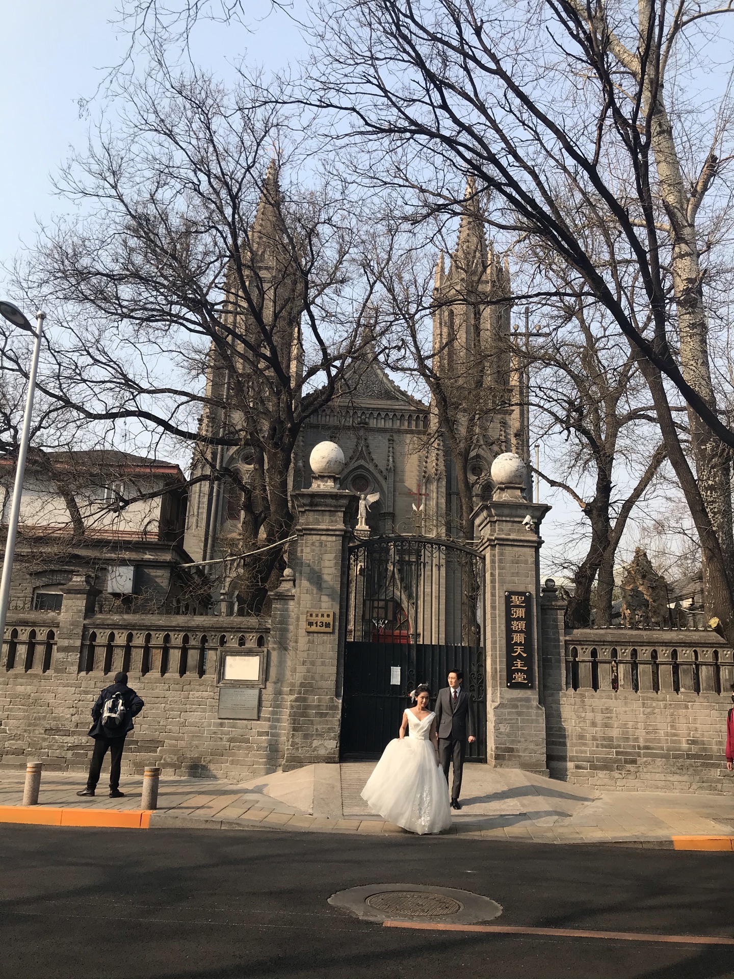 正碰上有人在这拍婚纱照,这里是原来的使馆街,街道很清静。砖木式结构,灰砖墙教堂位于东交民巷与台基厂十字路口的东北角,是一座建于1901年的两层哥特式建筑。砖木式结构,灰砖墙。教堂正中间有个白色的天使塑像。正碰上有人在这拍婚纱照,这里是原来的使馆街,街道很清静。