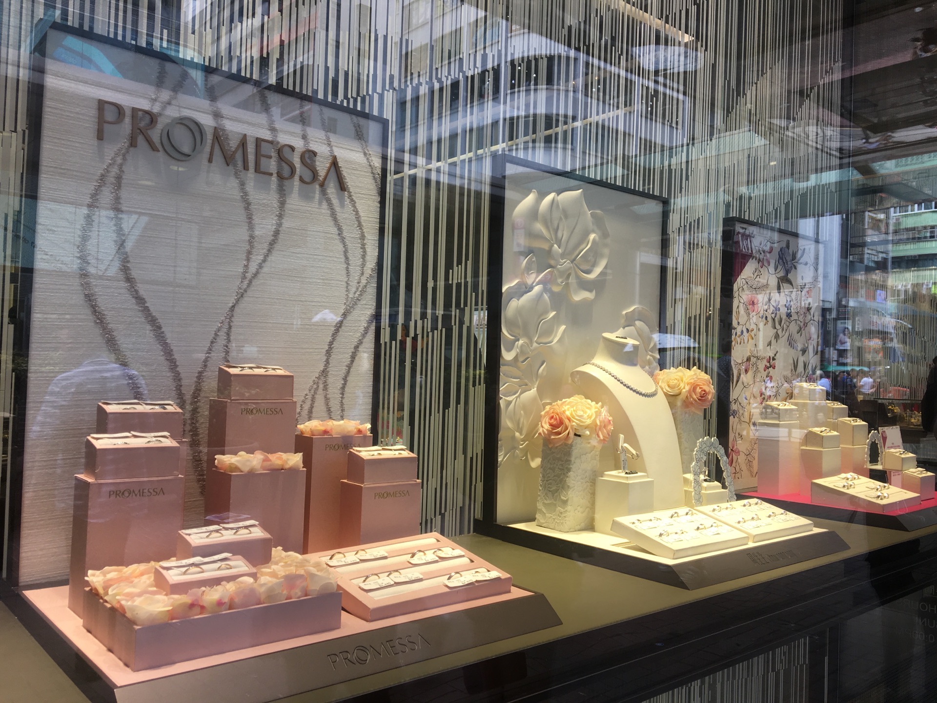 在德福广场二期通向一期的走道处就有周生生、周大福、六福珠宝、金至尊等等,可以说买金的话,真的不用去弥敦道了,在德福广场这边就能够有很好的选择。周生生的婚戒可以自选钻石的品质以及大小、钻托、指环的材质以及刻上名字,制定为新人独特的一对钻戒。