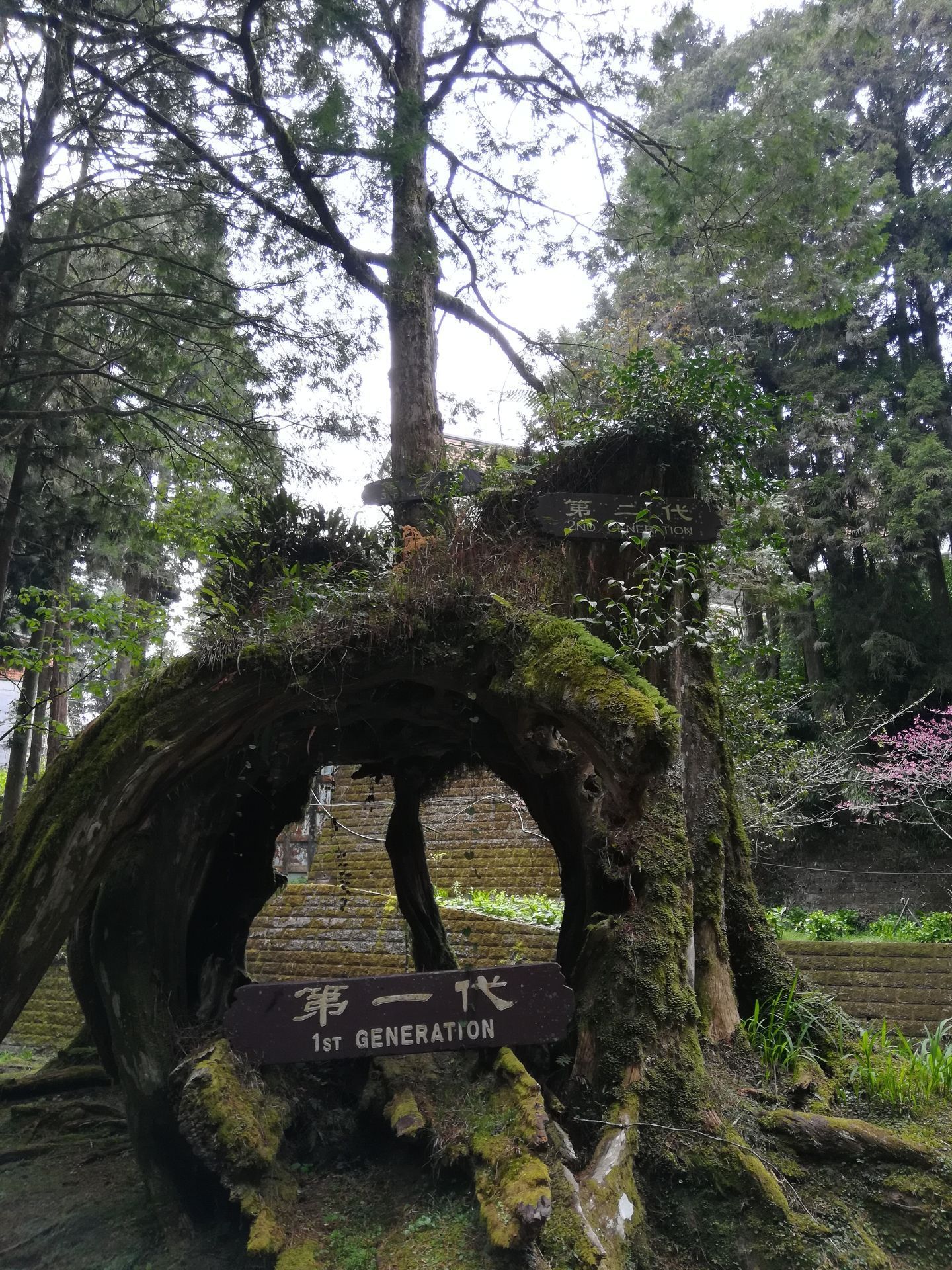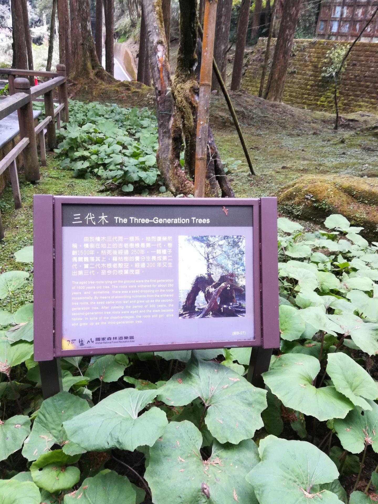 阿里山上主要是桧木林,三代木就是一个名景点,在树龄1500年的枯木(第一代)上,过了250年原来的枯木上有树种子生根发芽,成长为第二代木,第二代枯木上又生长树龄90年左右枯空,经过300年,在二代木上又生出了第三代桧木,直到现在。三代桧木同一根系,生生不息,大自然的力量啊。三代木历经了上千年,相比下人类又是何等渺小,我们有怎么能不善待自然呢。