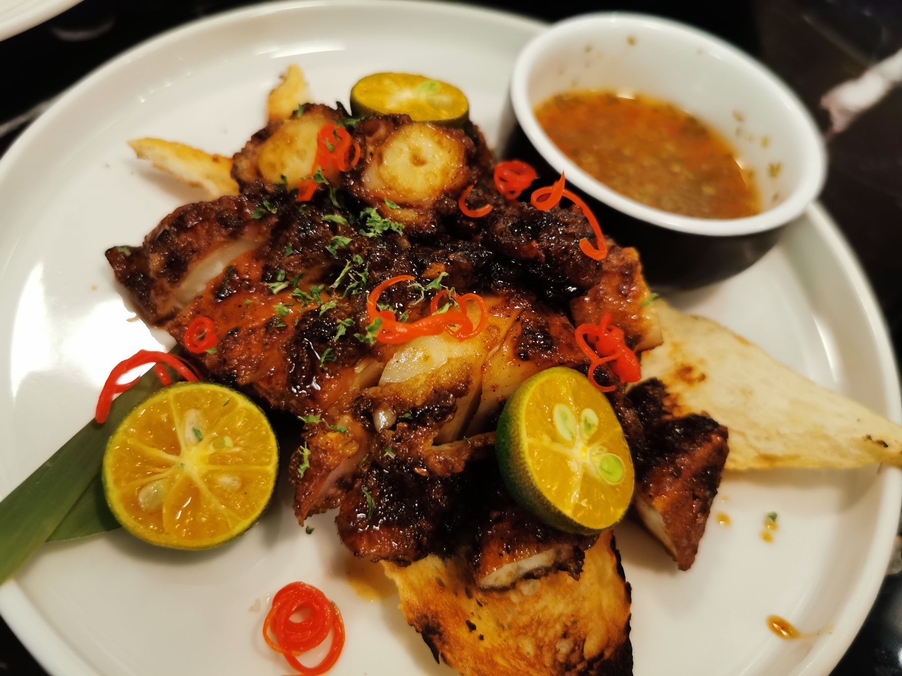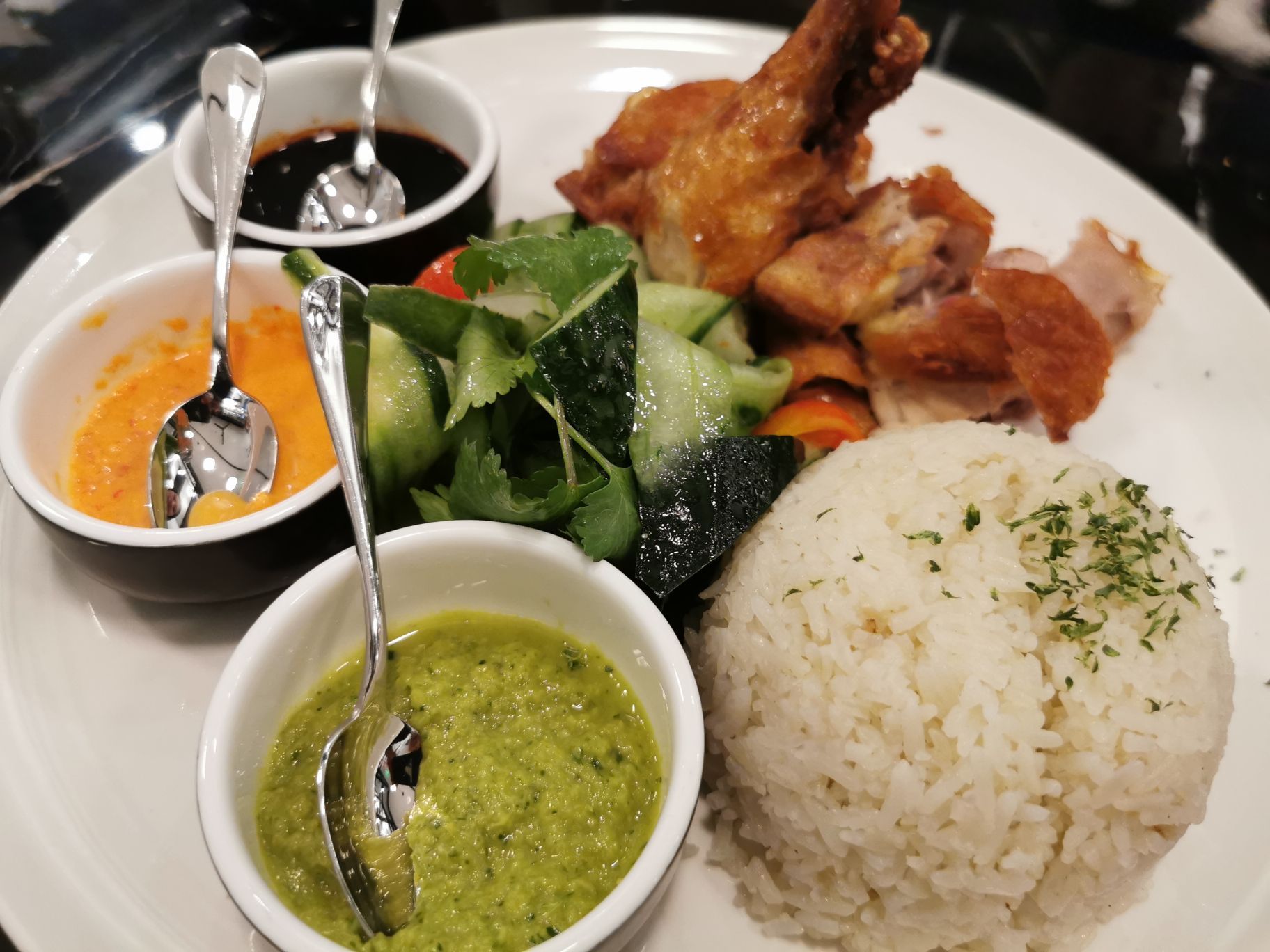 魔都的春天居然又碰到降温和下雨,这个时候来他家,感受一下身处热带雨林中是一份地道新加坡的美味,美食带来好心情拉 推荐坐在他家室外就餐哦,绿意盎然好心情 他家的照烧章鱼超级推荐章鱼章鱼肉的q弹再加上照烧酱的美味,让你吃了以后就停不下来哦。 狮城鸡饭有悖于传统的海南鸡饭,她家的鸡腌制后。过油炸得外脆里嫩非常的别致,而且三种酱料搭配着米饭特别好吃,尤其是青色青的秘制酱料,还让店家特意加了一份呢。 后点了一份招牌的双层巧克力蛋糕哇塞,真是大块头啊,就连喜欢甜品的cc,都表示实在是太厉害了,感觉上三个人分都差不多。 美食带来一个好心情。PS咖啡,你值得拥有。