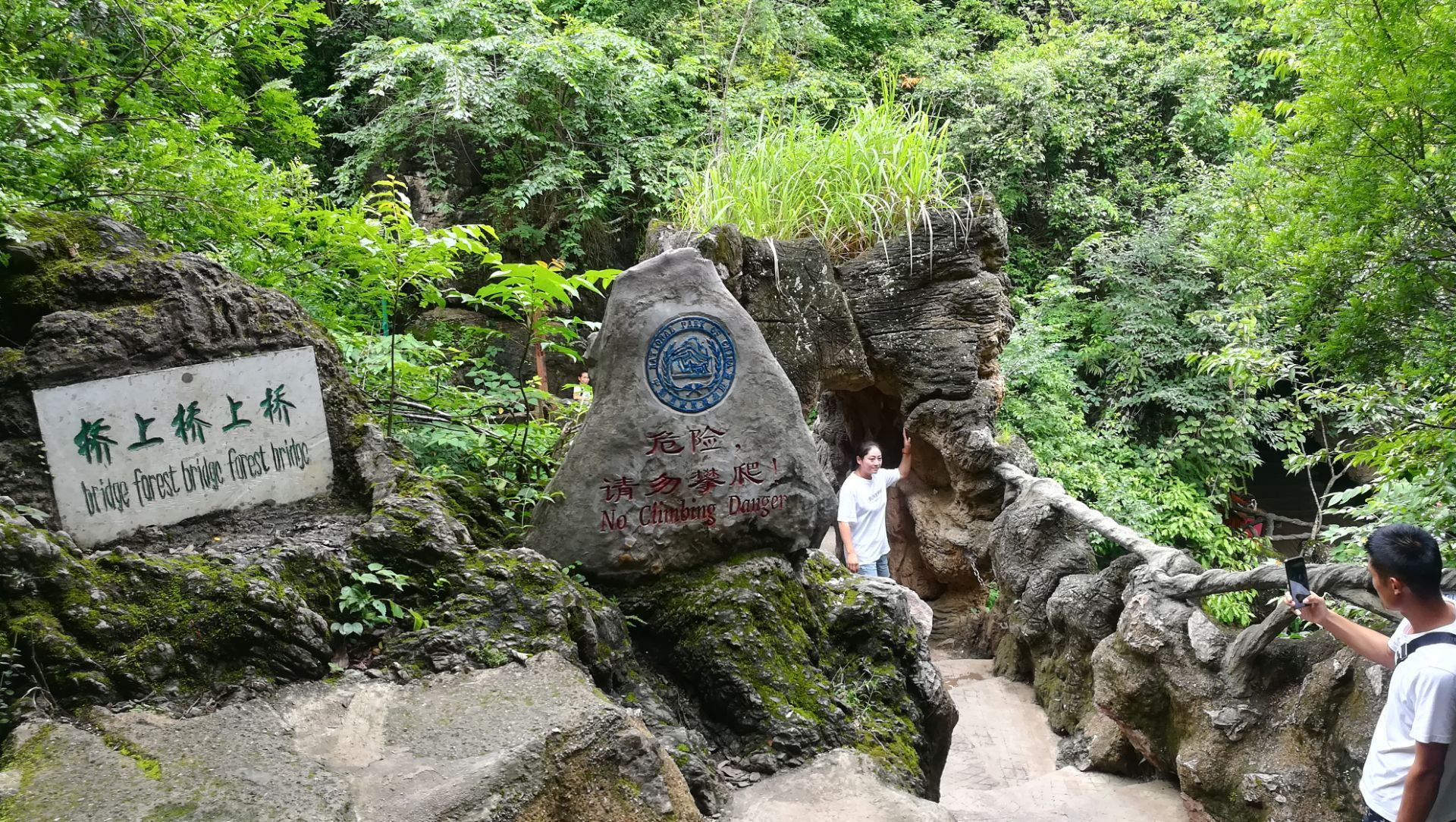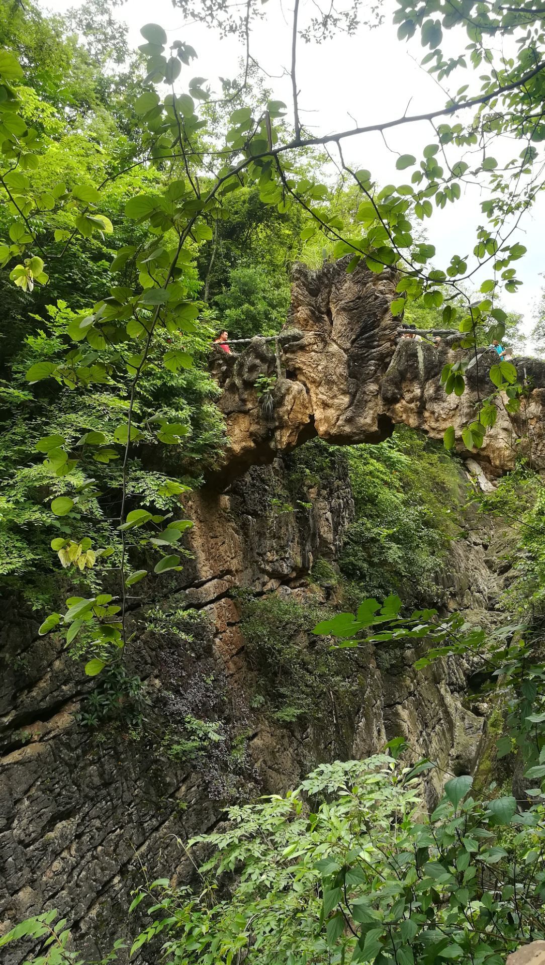 桥上桥上桥的奇特之处,它不是一个完整石头组成的桥,而是由三截构成。左右各一截,是从悬崖伸出的石头,构成桥梁左右部分,中间那块巨石,它仿佛从天而降的的楔子,这个楔子又恰恰是上大下小的形状,而下坠插入的地方,又恰恰是桥梁中间的空档!