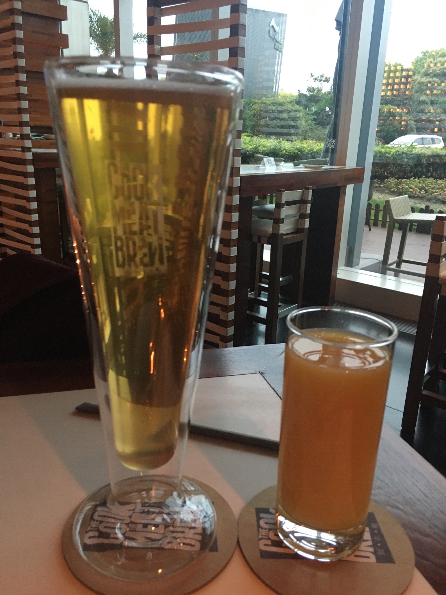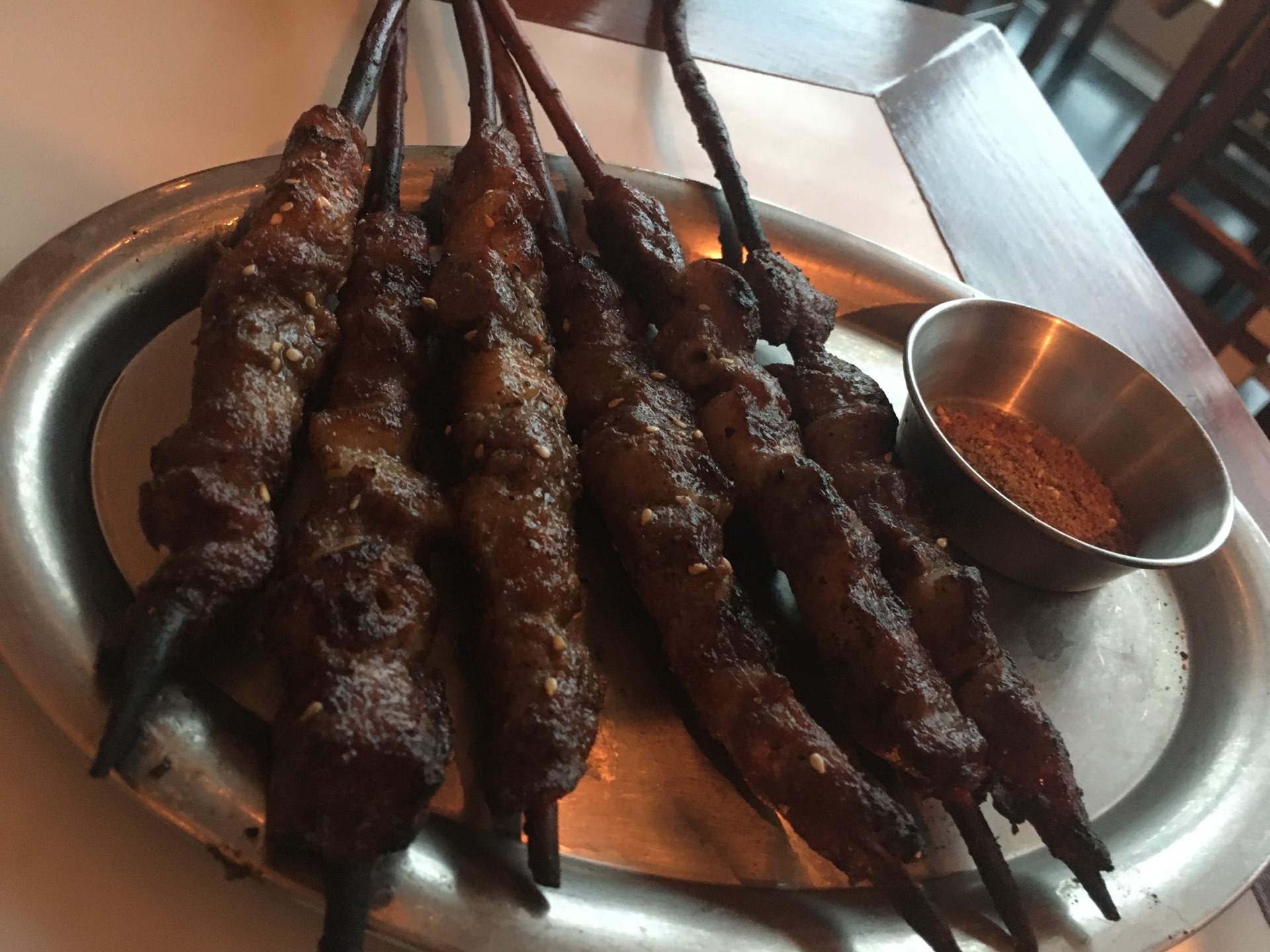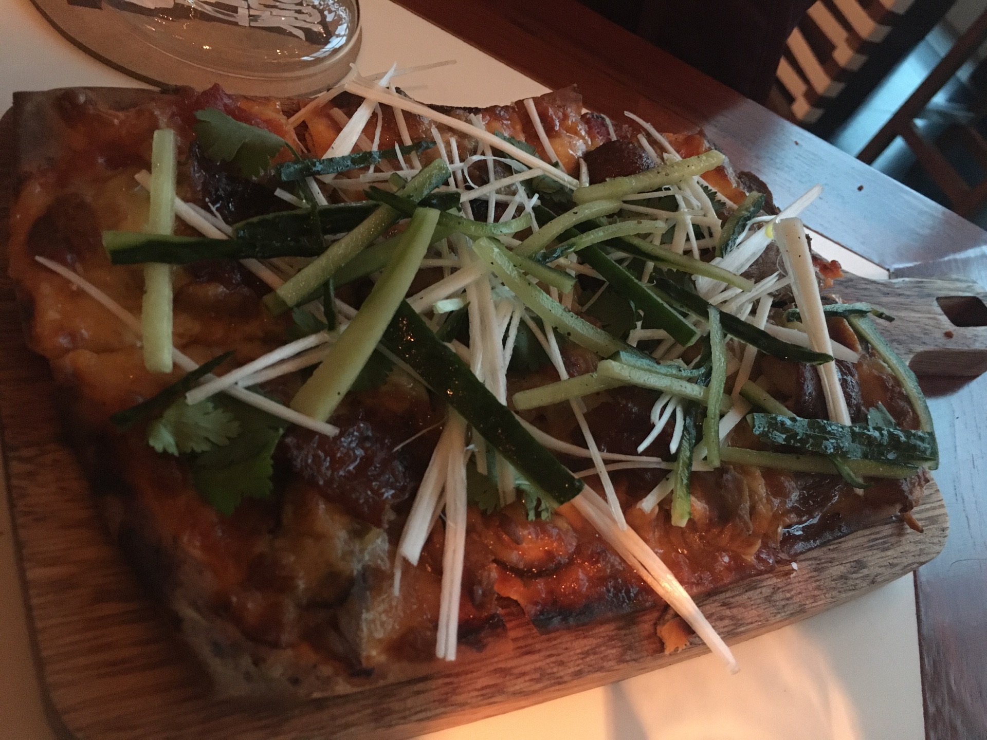 开在浦东嘉里大酒店一楼,原本生意很好,还有驻唱,现在因为特殊时期,驻唱没有了,食客也很少,到的时候总共才3桌。 点了99元套餐,两杯啤酒,一份烤鸭薄底披萨,6串羊肉串,性价比杠杠滴,上菜速度和服务还是一如既往好。烤鸭披萨上面放了香菜,有违和感。