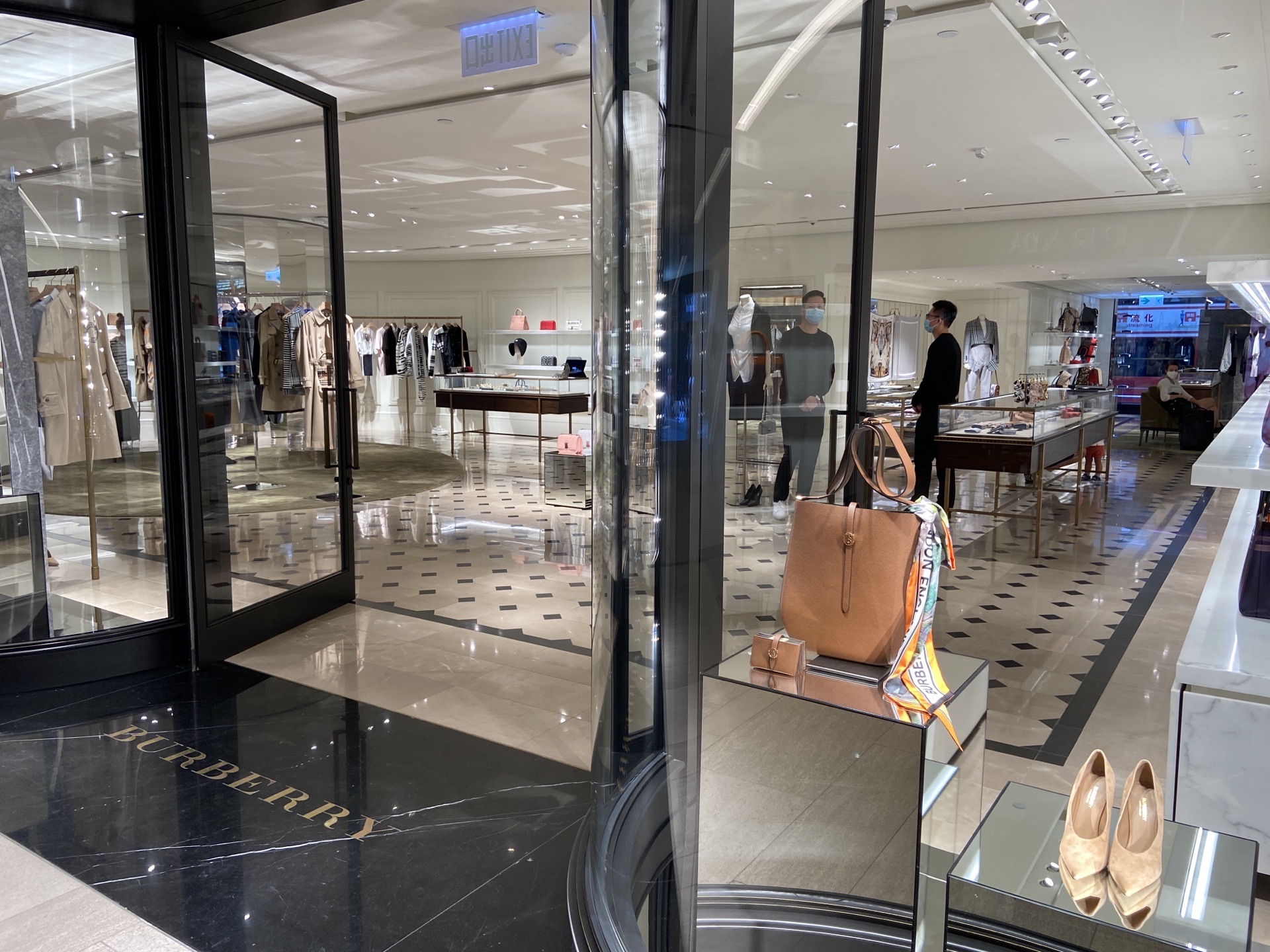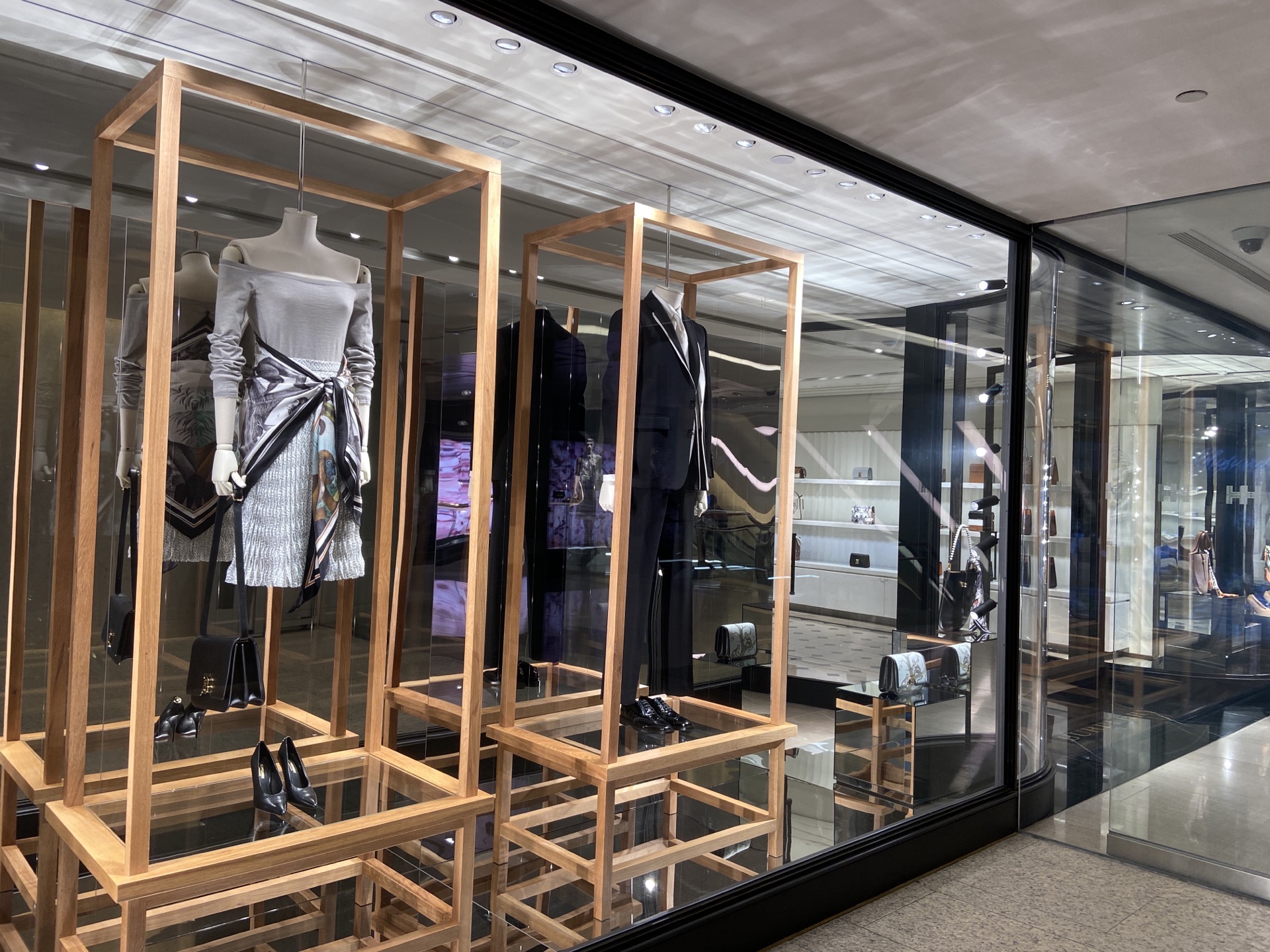 历山大厦的这家Bruberry是2018年开设的新店,装修风格和香港的其他分店都是不同的。当香港其它的bruberry分店的橱窗里都爬满了猴子的时候,历山大厦的这一家却完全看不到任何的动物,也没有回归自然的感觉。由橡木做成的展示架上挂着的是优雅的洋装和礼服。