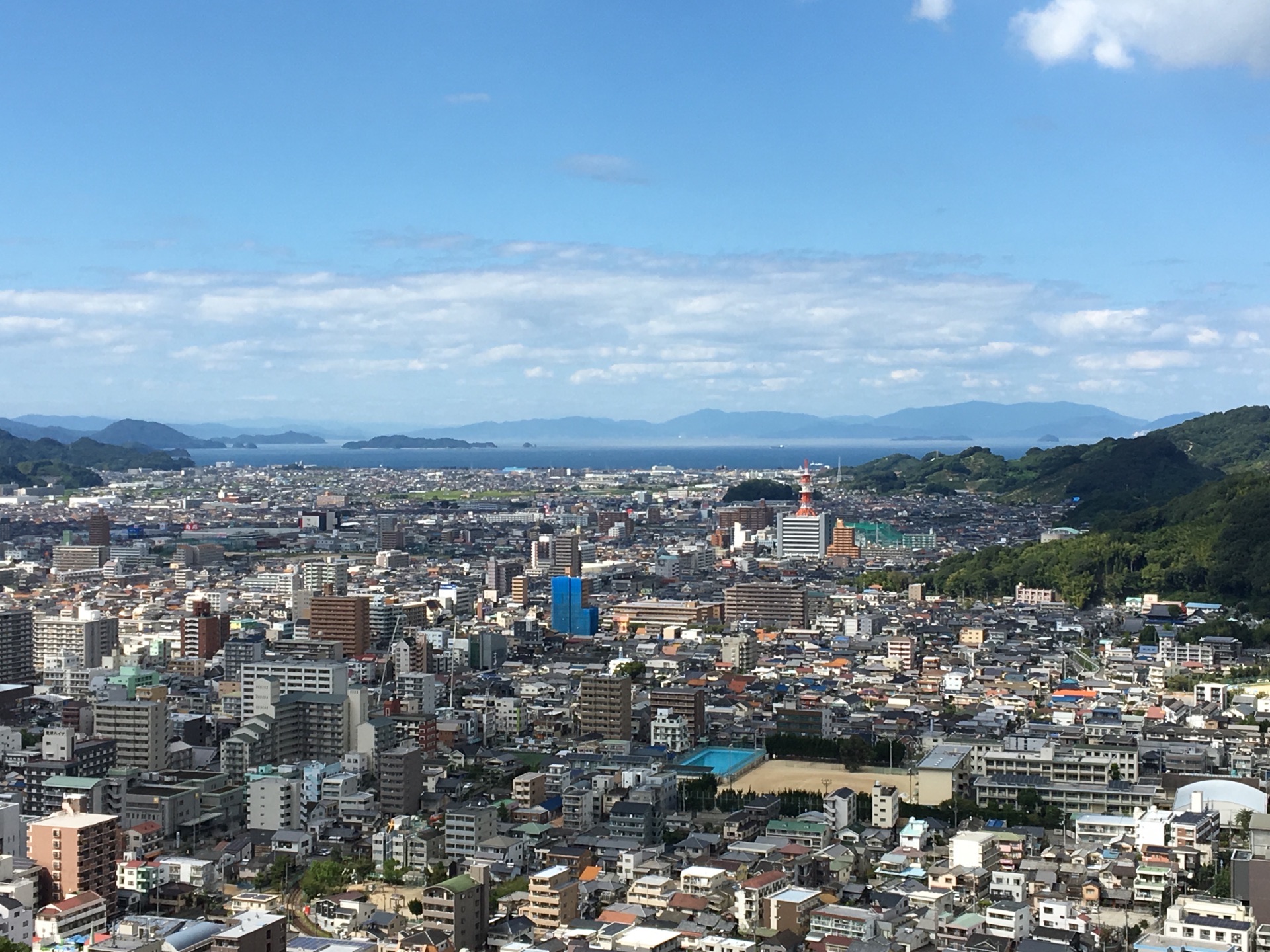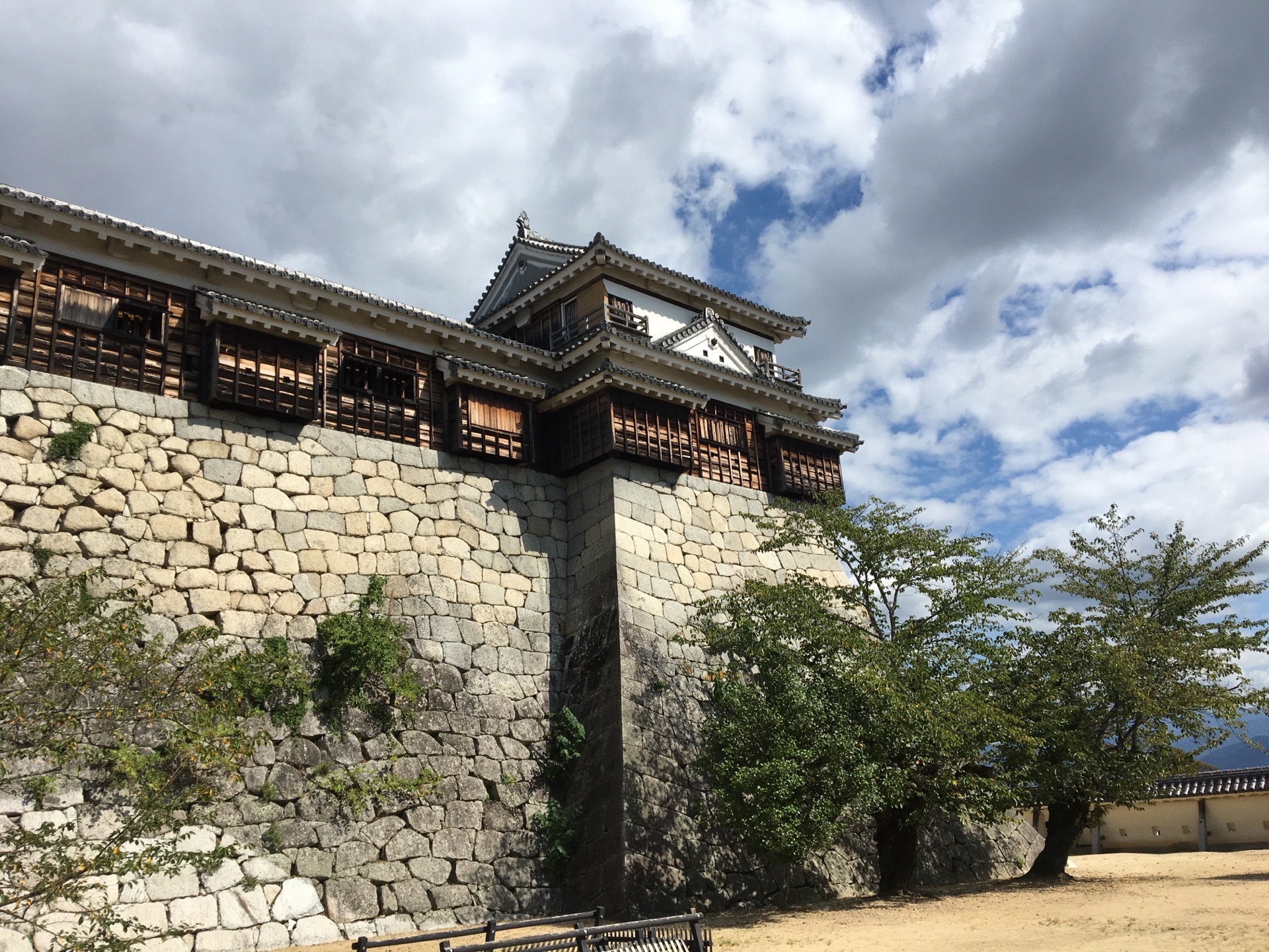 慢慢走上松山城的话,大概要半个小时,当然搭缆就要轻松很多了。松山城天守阁是很有战略位置的,盘踞在132米高的小山包上面,这已经是松山的制高点了。所以在天守阁上面可以极目远眺,一直看到大海,整个松山市都在眼底。在天守阁前面还有一个长长的本丸广场,这里是拍天守阁全貌的好地方。
