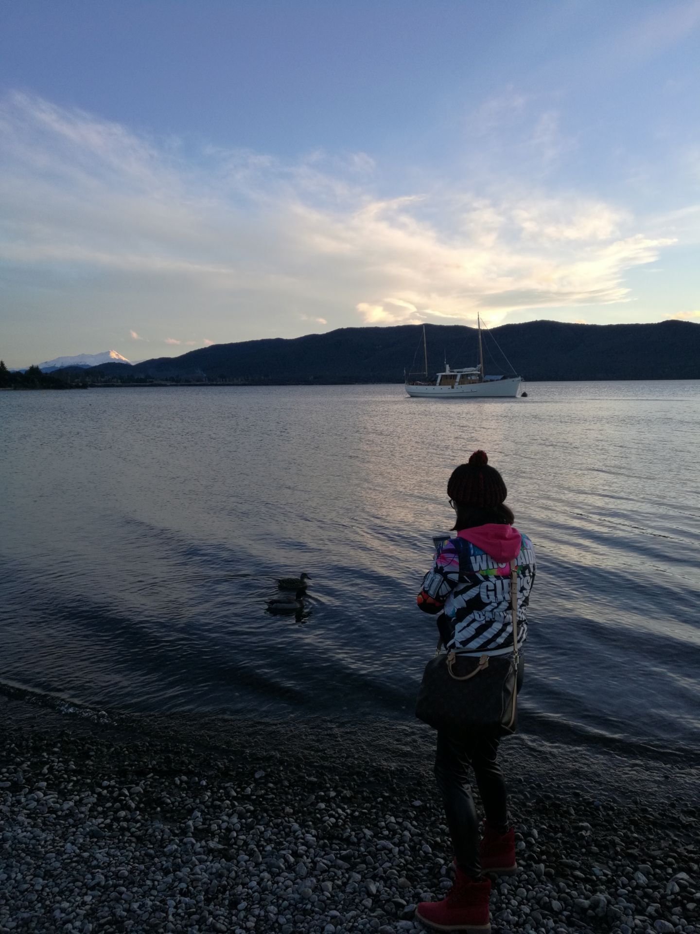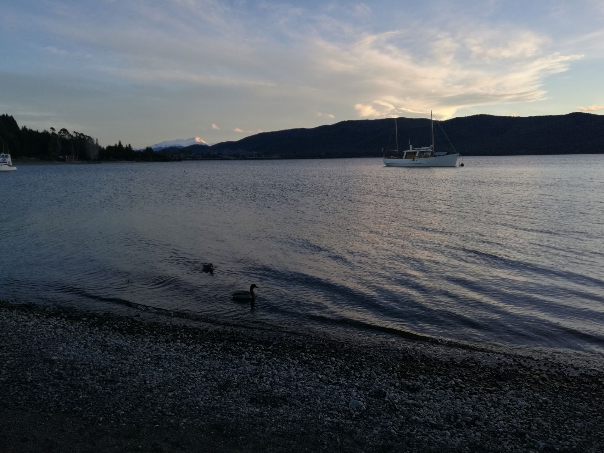 蒂阿瑙湖是全新西兰第二大湖,也是南岛的第一大湖。湖的东面以连绵起伏的丘陵地区为主,西侧则是一片宏伟的森林和旷野。从米佛峡湾游玩归来,夜宿蒂阿瑙,这个小的不能再小的镇子。傍晚,走出旅馆,到湖边静静。湖面异常静谧,有会飞的野鸭子点缀其上,远处还有静止不动的帆船,一切恍如画镜。