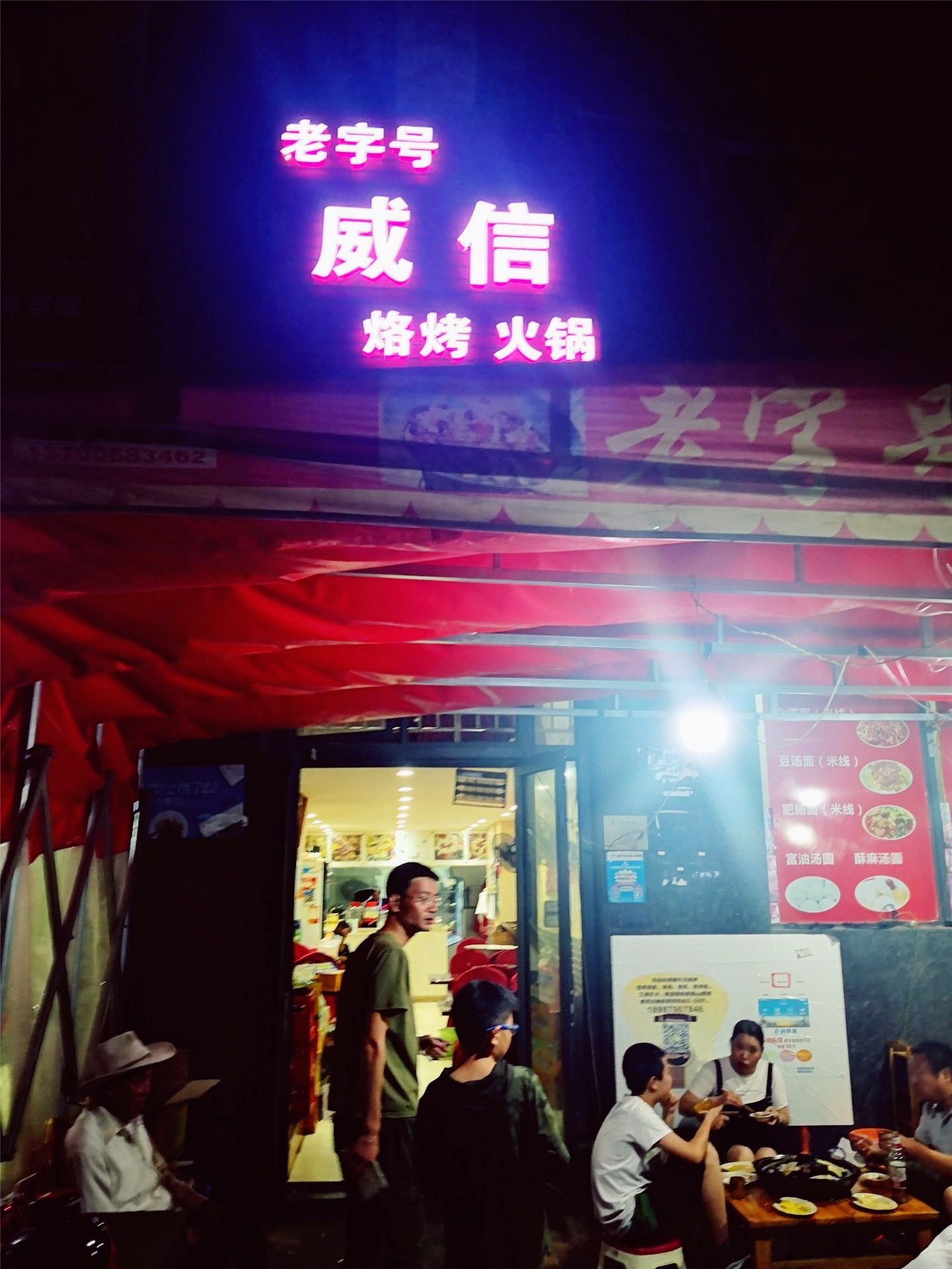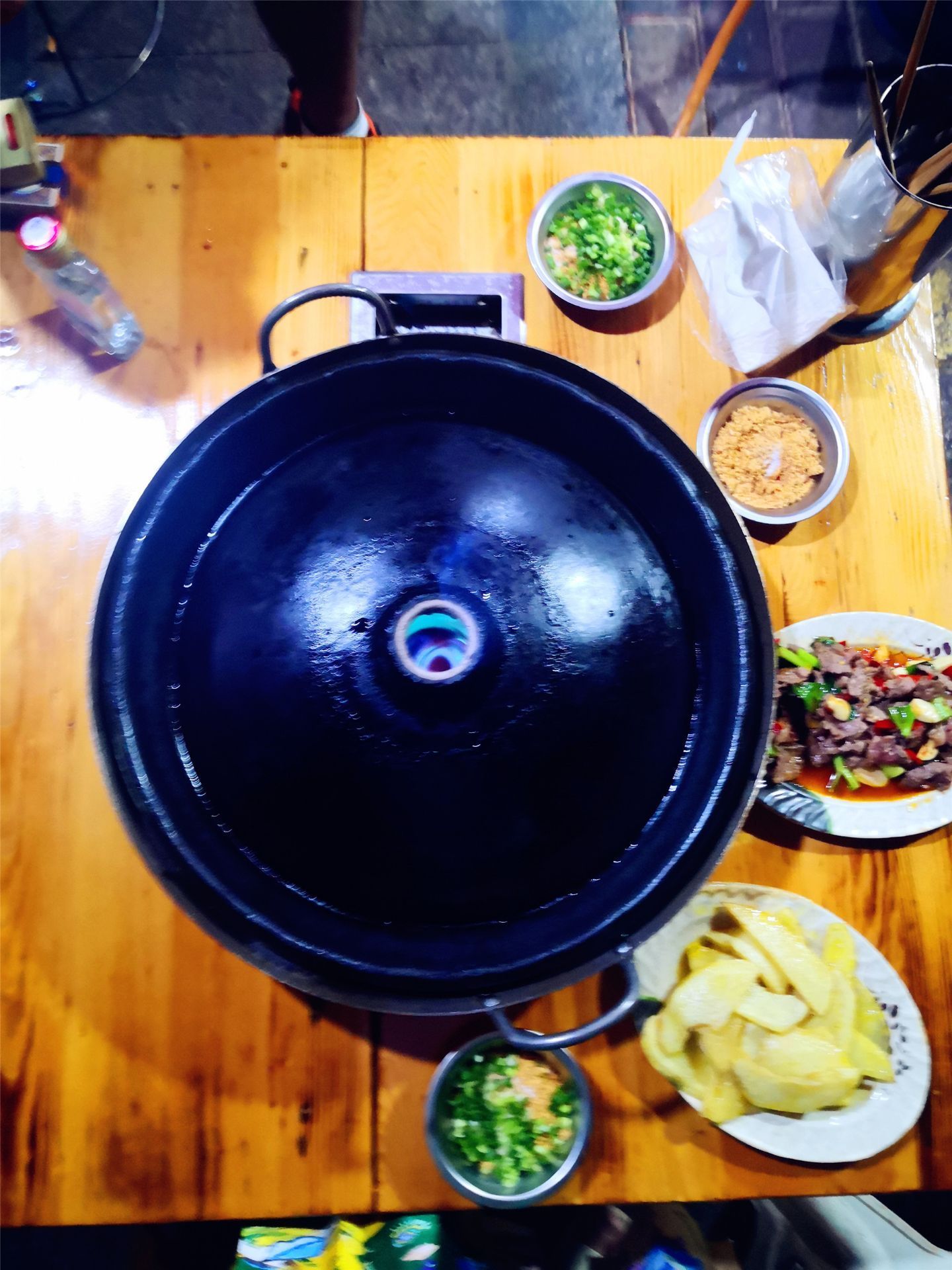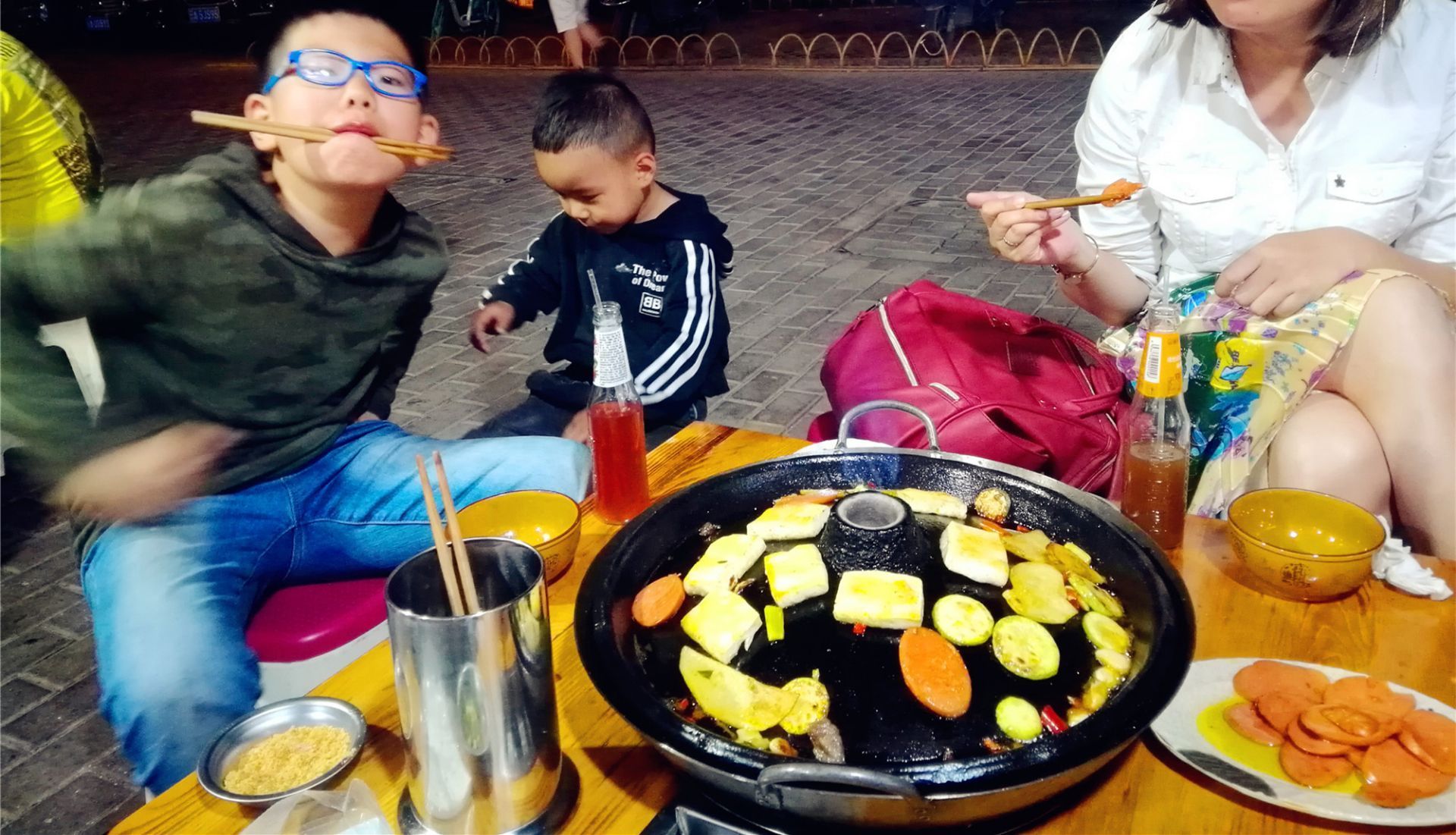 作为一个火锅爱好者,我还是第一次吃这种火锅,真的是不出门不知道世界之大。 到达酒店已经晚上九十点钟了,还没吃晚饭,在网上附近一搜就搜到了这家店。 这家店应该都是本地人吃夜宵的地方小,大家都拿着小板凳拖家带口或是一群朋友围坐在一起,坐在店的门口。 我还是第一次吃这种火锅,火锅里不加水不加汤,锅子是个铁的鼓起来的铁烤盘,点了菜后,老板会先把菜下一下油锅再拿上来,然后客人就自己放在烤盘子上烤,感觉肉放在上面就像古代的罪人在受炮烙的刑罚。 我个人感觉有点太油了,不太吃的惯,不过家里大小两个男人都说很好吃。