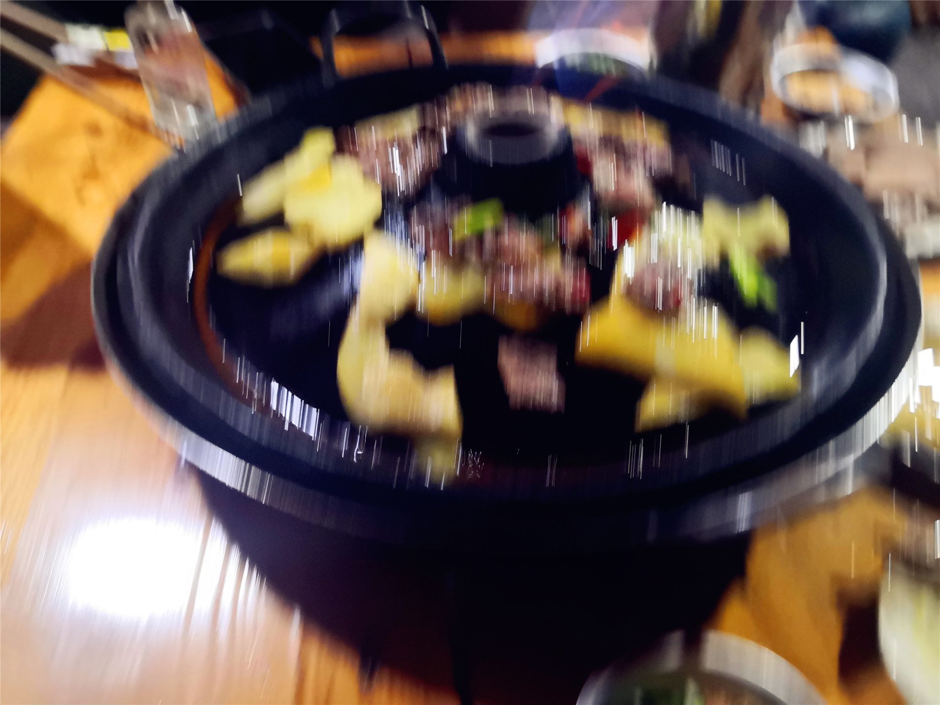 我还是第一次吃这种火锅,火锅里不加水不加汤,锅子是个铁的鼓起来的铁烤盘,点了菜后,老板会先把...