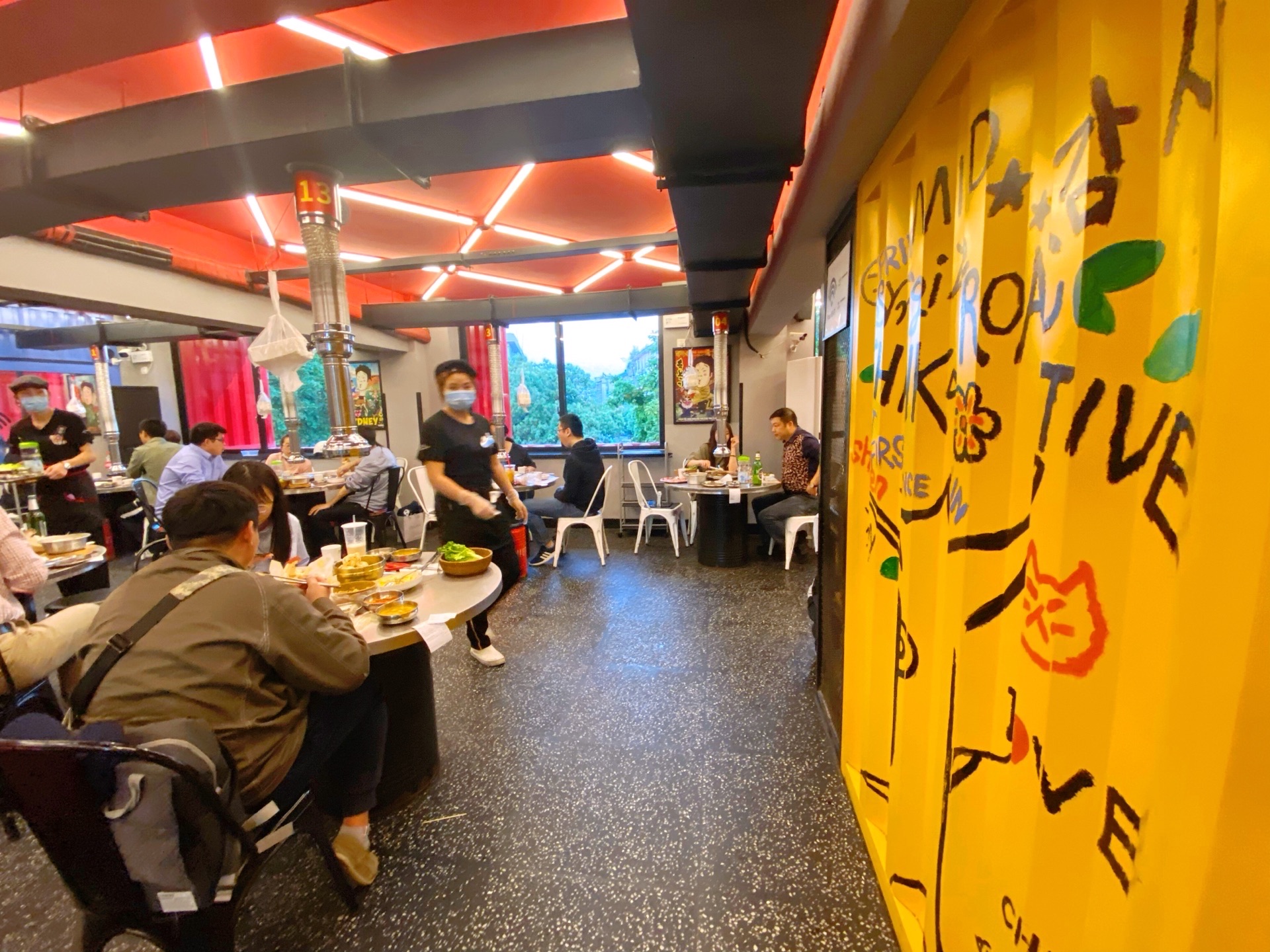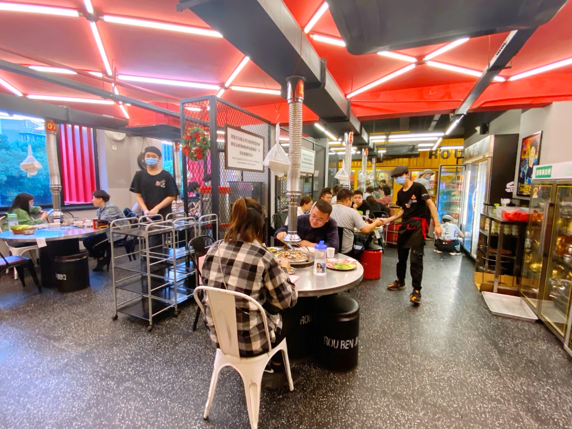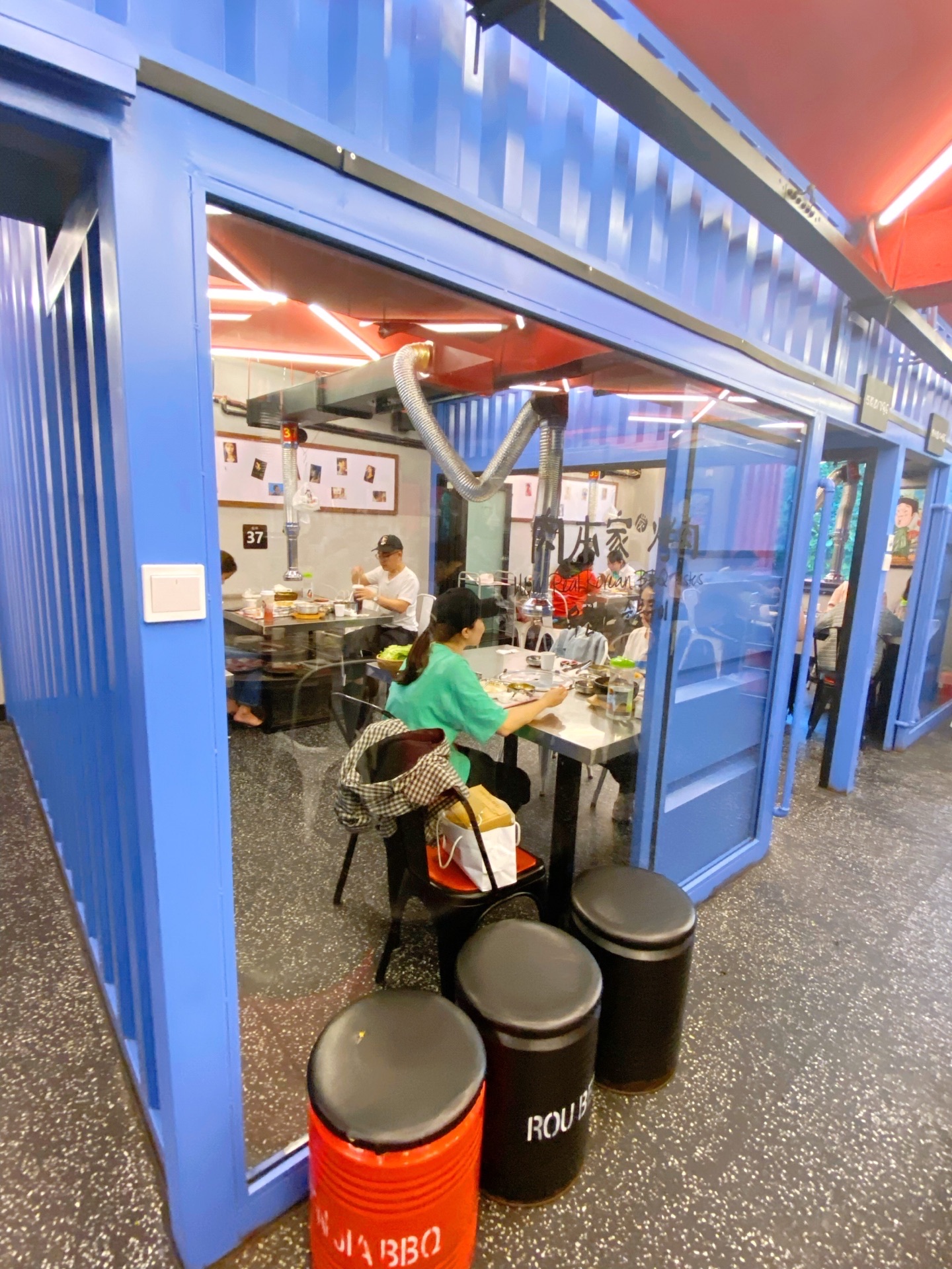 听说过浙大紫金港校区附近的肉本家很火🔥……一下班就冲过去,却发现已是人满为患……店外的人行道上坐了许多等位的人,令人心悸。店铺的装修很有特色,一个像集装箱般的二层小楼,用红色装饰了外墙,很是显眼!一楼有一个功夫熊猫的玩偶,很卡瓦依。二楼才是就餐的餐厅,有三十多张桌子,周围一圈包间分别用黄色和蓝色涂装。这是专门吃韩式烤肉自助的,店主人花了百万租了此房,也是有十分迫力滴!