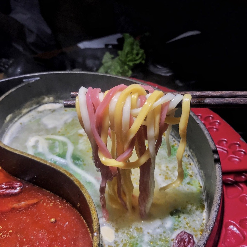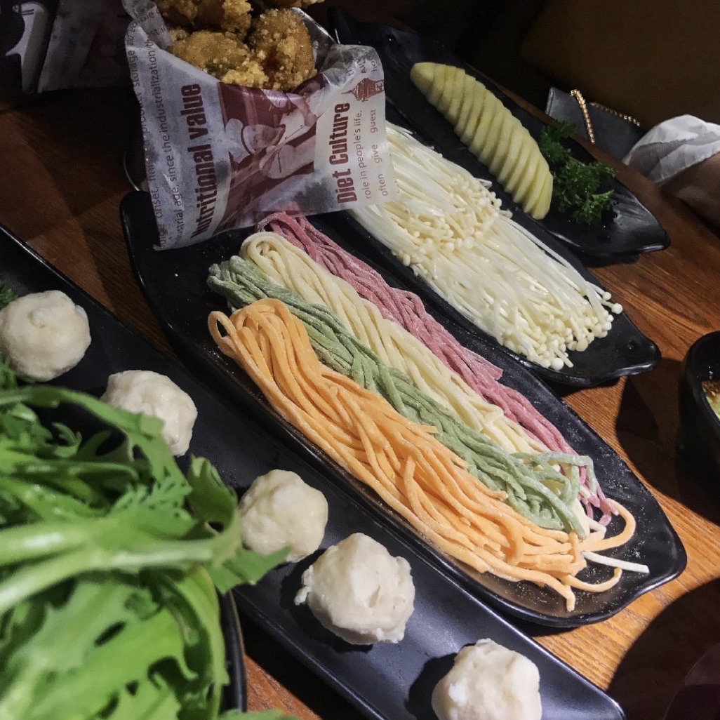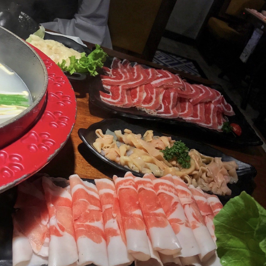 熊喵来了萌火锅 (台湾风味) 台湾麻辣锅辣度适中 没有很呛 自带鸭血豆腐 很入味 白汤是日式柴鱼锅 尝了一下比较淡 但聊都偏咸 所以涮品蘸蘸料 还是没毛病的 三个人调了五碗料 因为看店里有推荐的组合碟就试了一下 秘制辣酱有点咸 但是!日式酱汁+白萝卜泥 还是很好吃的 一开始闻上去觉得臭臭的萝卜味 但是吃起来很好吃的 大家可以试试 具体几勺怎么组合 调料区有牌子提示的 有几个招牌菜品可以推荐一下: 一米羊肉(真的是羊肉卷堆在一米长的板上)(但是有半份 如果大家觉得一米的吃不掉可以点半米哈) 环肥燕瘦(是猪五花 细看肉卷真的外圈肥内圈肉 名字起的很到位了) 鲜嫩滑羊肉(里面有颗蛋 把蛋打散裹在肉外 如果不会弄的话可以喊服务员帮忙啦) 花团锦簇(蔬菜拼盘 还包含菌菇 很实惠) 四色火锅面(我实名推荐!而且我觉得要清汤下 不要配料 因为绿色的菠菜面也太好吃了吧 吃饱了也要再塞两根进胃的那种) 水果罐头和蚕豆是小零食随便拿 但是水果罐头总是补充不及时 如果遇到 都是缘分了 怪味蚕豆的酥脆我很喜欢 就是略油腻 菜品摆盘都还蛮精致 而且上菜速度神速 非常开心了 就是哗啦啦一股脑就堆满了桌子 幸福感爆棚 而且我个人觉得 菜品还是比较实惠的 尤其蔬菜都很便宜的感觉 点菜看到有羊排 还是蛮惊喜的 但是实在自己掌握不好火候不敢点 饮料很多都是礼炮桶装 甜点也是颜值在线