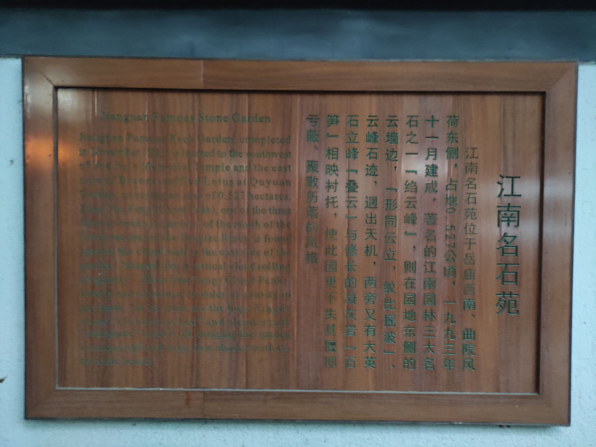 网友2020-05-01江南名石苑位于岳王庙西南、曲院风荷东侧,著名的江南园林三大名石之一的绉云峰就在园地东侧的云墙边...江南名石苑位于岳王庙西南、曲院风荷东侧,著名的江南园林三大名石之一的绉云峰就在园地东侧的云墙边,此园具有偃仰云蔽、聚散历落的风格。