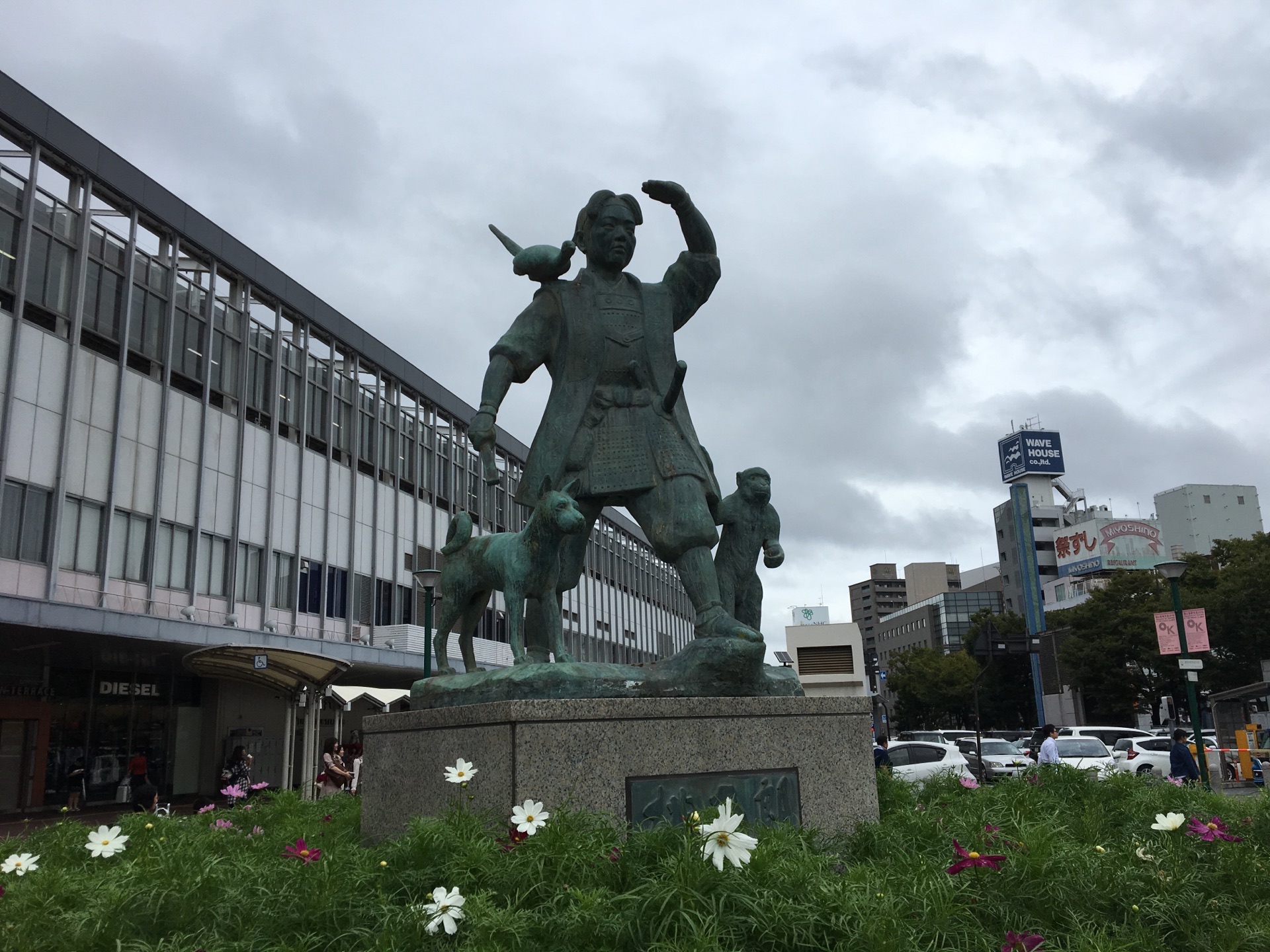 冈山站的前面广场就矗立了一尊桃太郎的铜像,有他的小伙伴猴子和狗,肩膀上还有一只鸟