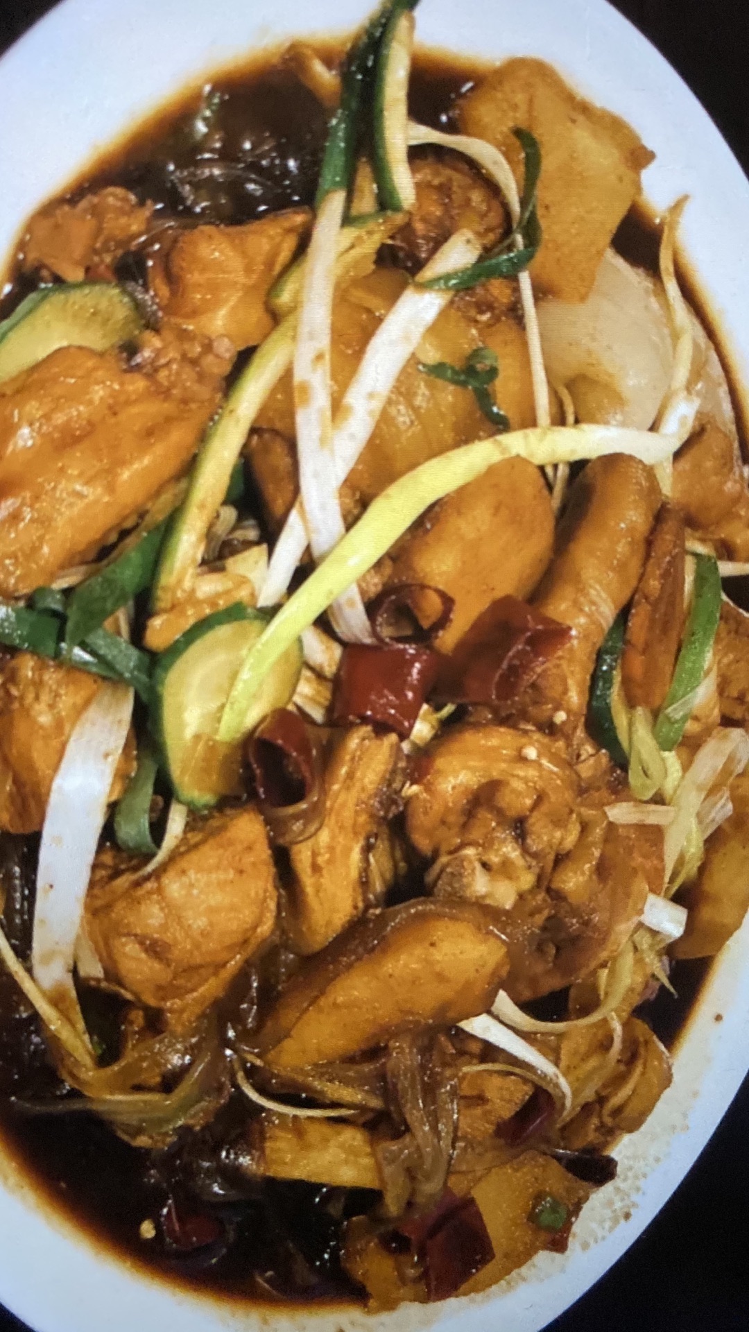 凤雏酱鸡就是炖鸡,当地人很爱的一道菜,酱料十分香浓,口味有一点偏辣,可以选择无骨的,吃起来啖啖肉的,菜量根据客人的人数自己选择的,配有辣白菜,一和水泡菜,鸡肉满满一大盘,里面有粉条,有宽有细的选择,粉条很长很滑,服务员会版忙剪开,分量很足,色香味俱全,浓郁的酱汁看起来就很诱人,把酱汁和米饭混合,是非常地道的吃法。