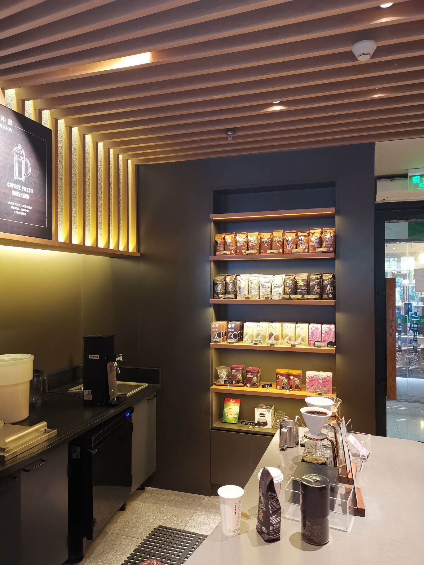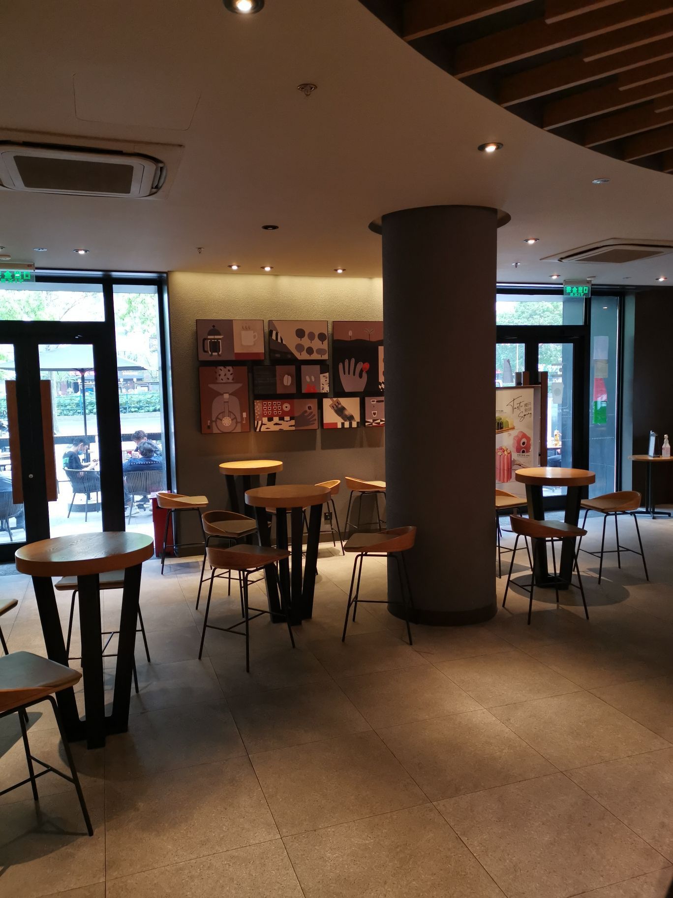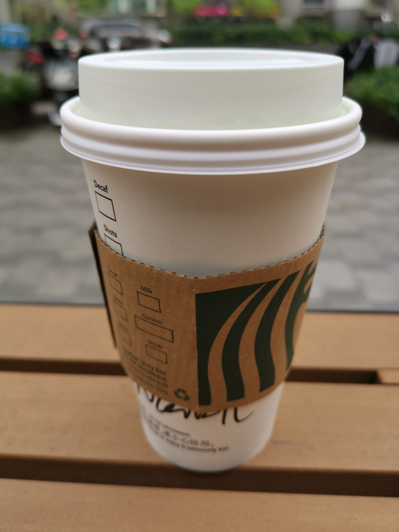 【环境】 室内比较宽敞,客人也不是很多,环境除了有点老旧基本无缺点。 室外座位比较抢手,基本坐满,不过收拾桌子上残羹总是不及时。 【口味】 点了杯|原味热拿铁^,味道还可以吧。 星巴克咖啡味道总是保持的挺统一的,当然非常专业人士吃得出差别的。