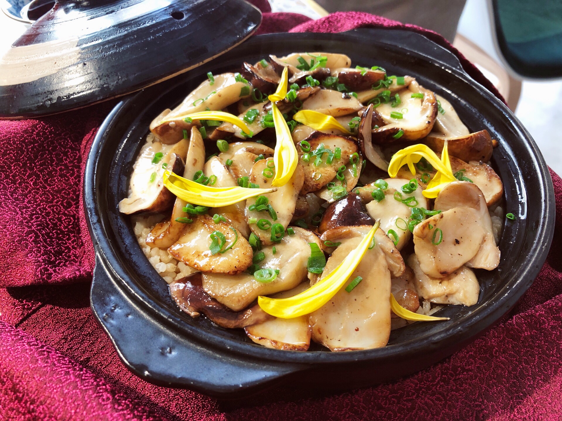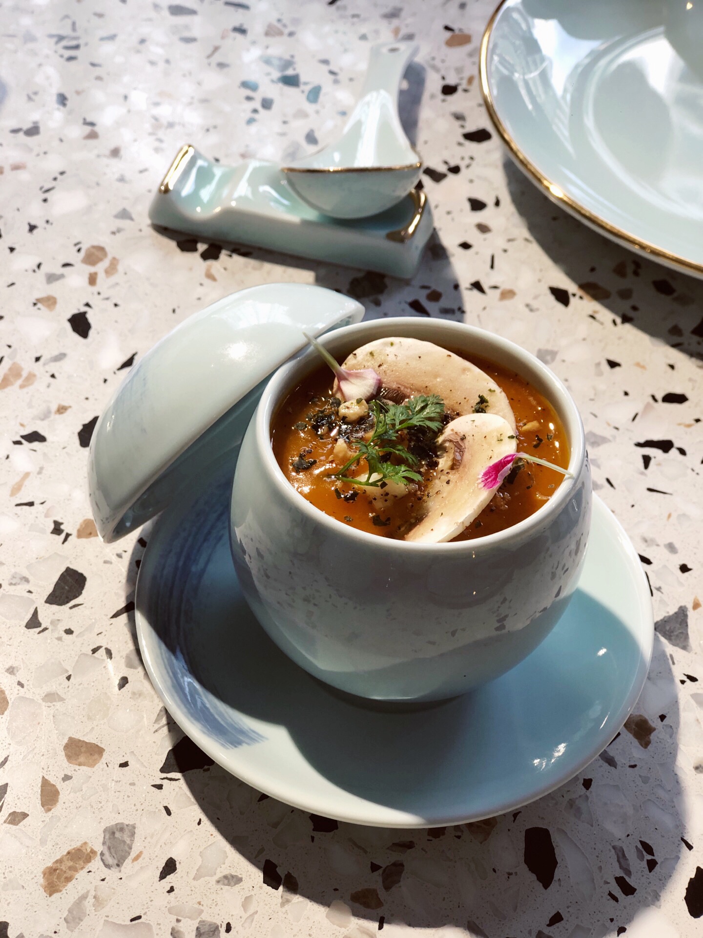 笕箪不简单,位于安远路上的素食餐馆,现今人们都以健康饮食为推崇,素食就是很好的选择,吸引不少年轻白领客人。 郁郁葱葱松茸饭,推荐度很高的一道主食,松茸是营养价值很高的食材,现煲的松茸饭上桌用红绒布包裹颇有仪式感,打开看到铺满的松茸撒上小葱,浇上酱油拌匀就可以吃了,香气扑鼻,松茸很鲜美,就是米饭感觉烂了点。 蛋羹南瓜泥,炖蛋上面铺了南瓜泥,口感也是蛮搭的,小小一盅佐饭或者小食都还不错。