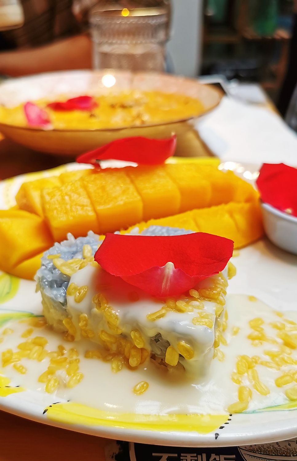 花花世界,我又来啦! 一样的位置,一样的菜品,还是“泰”香啦! 交通:🚗T3C用券券,0元直达皇后公园。 下单很快,上菜也快。 |麦片虾^的虾埋在麦片中,但是稍稍一翻,就是一大只饱满的虾肉,再翻还有,像是一个无尽的宝洞。 虾子因为大,吃起来很有饱腹感,啥都没吃,就半饱了。😂 最爱|香蕉馕饼^配 |女皇咖喱^。这次要了香蕉🍌馕饼,烤得微干,蘸上一口带着芒果香的女皇咖喱汁,再来上一口鸡肉,满口都是悠长的回味。 |鲍汁西兰花^很好吃,西兰花煮到有点软软的,虽然没了鲜艳的翠绿色,但很有家里的味道。 最后吃完|芒果糯米饭^,真的是顿牢不会动了。 我的饭搭子特别挑,环境挑、菜品挑,服务还是挑,只有花泰我一提,她就说要再去。😄