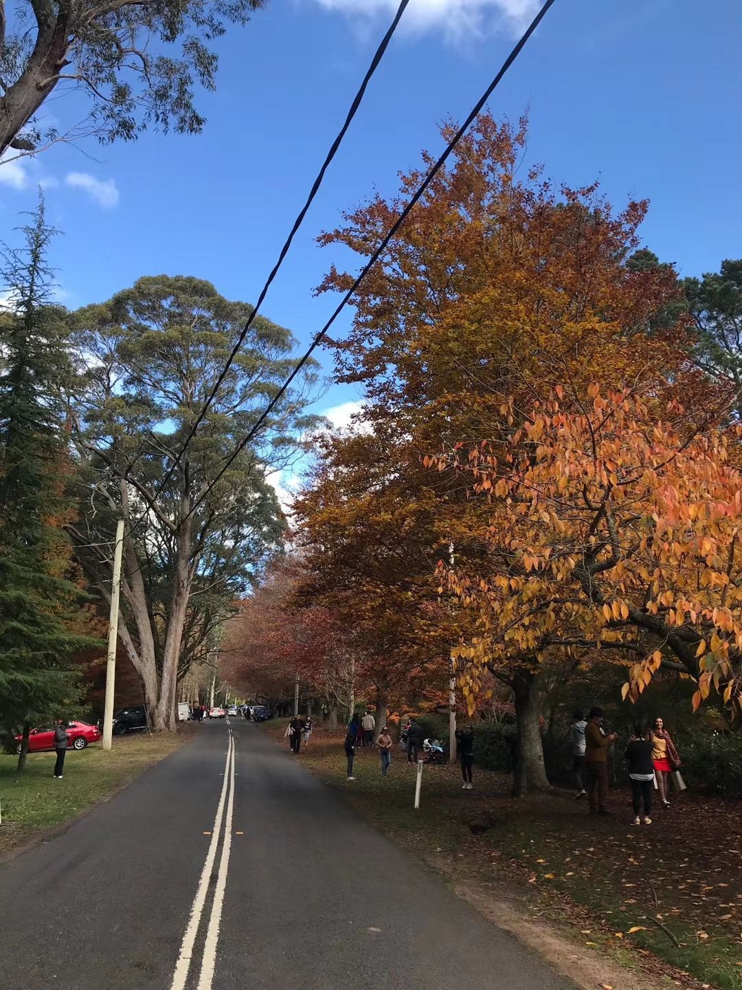 蓝山很大 这是蓝山植物公园 解禁后的第一个周末人非常非常多。现在是澳洲的秋天,无疑 蓝山的秋天是很美的。这里有枫叶有梧桐树,各种各样的色彩层层叠加。这里的气候也要比悉尼市区冷一点。落叶加上五彩缤纷的色彩,蔚蓝的天空乍是好看。