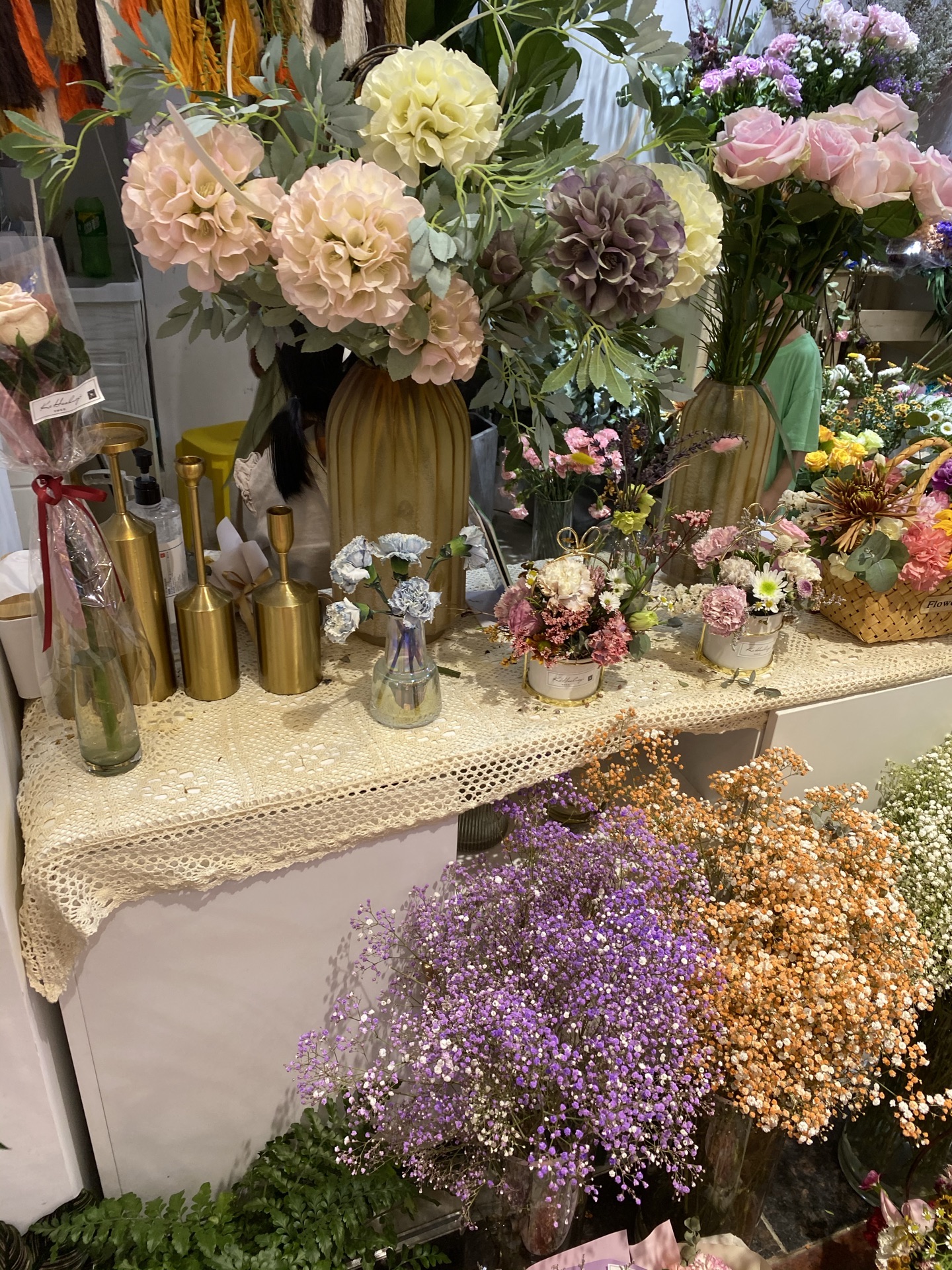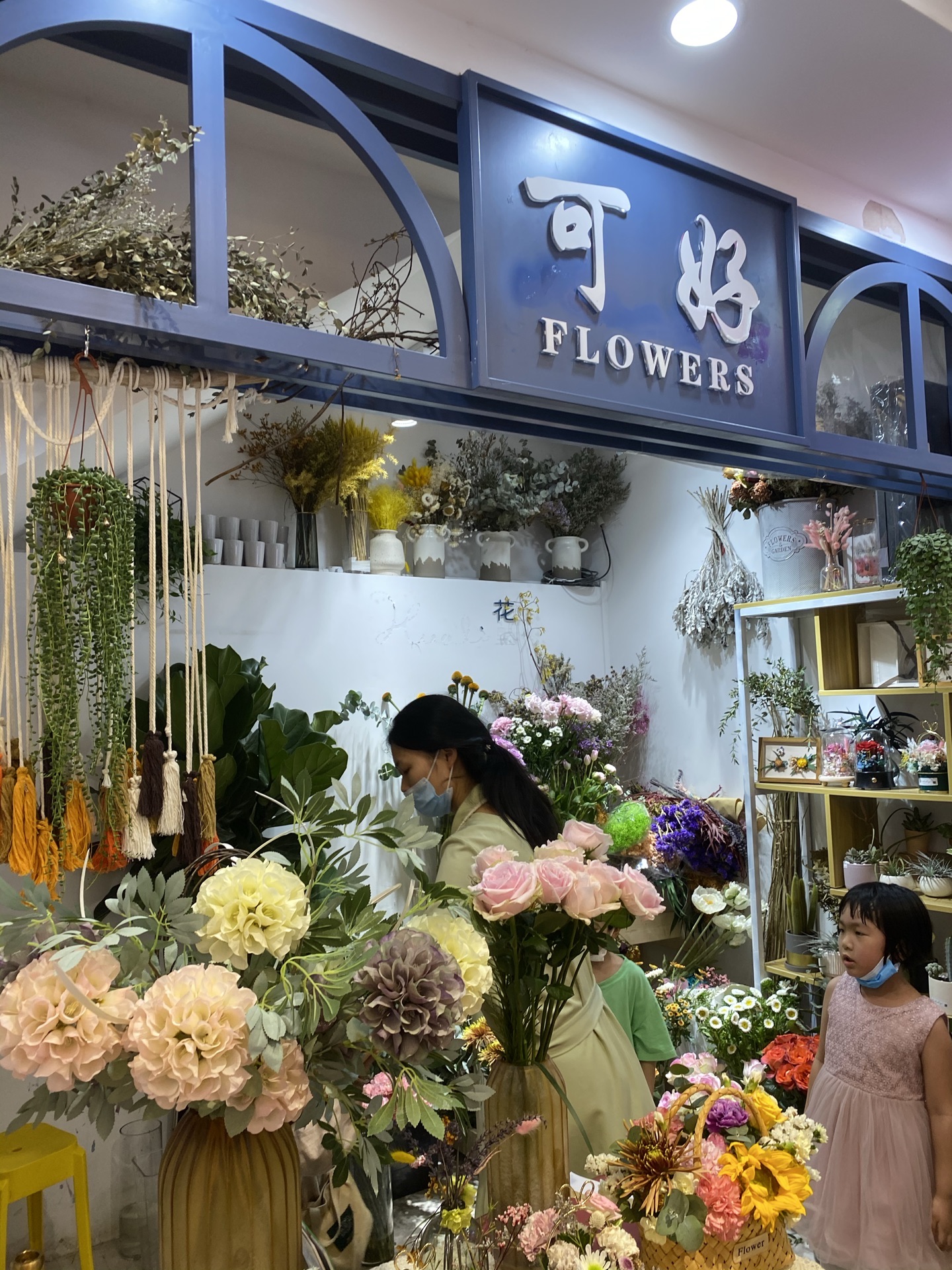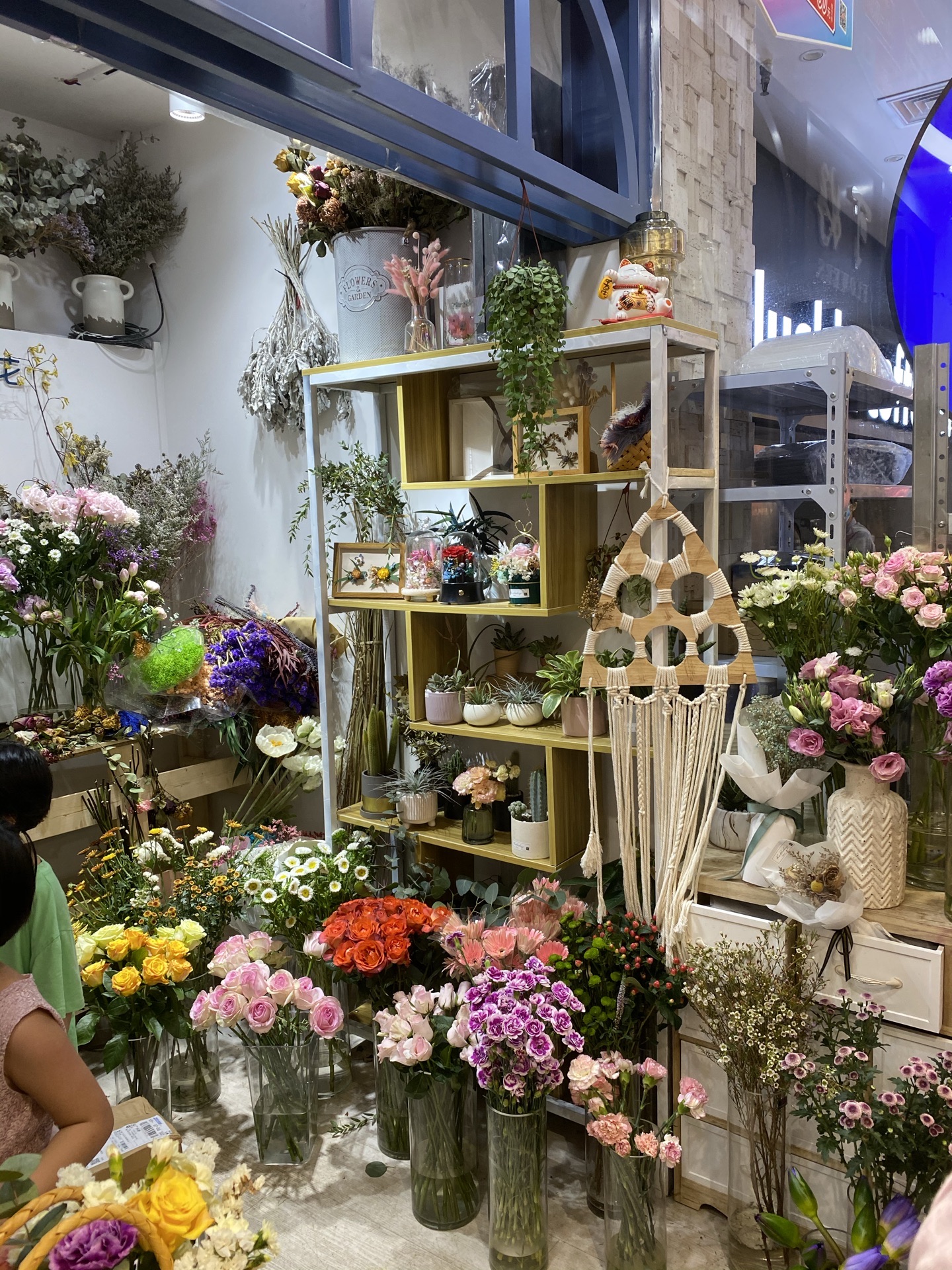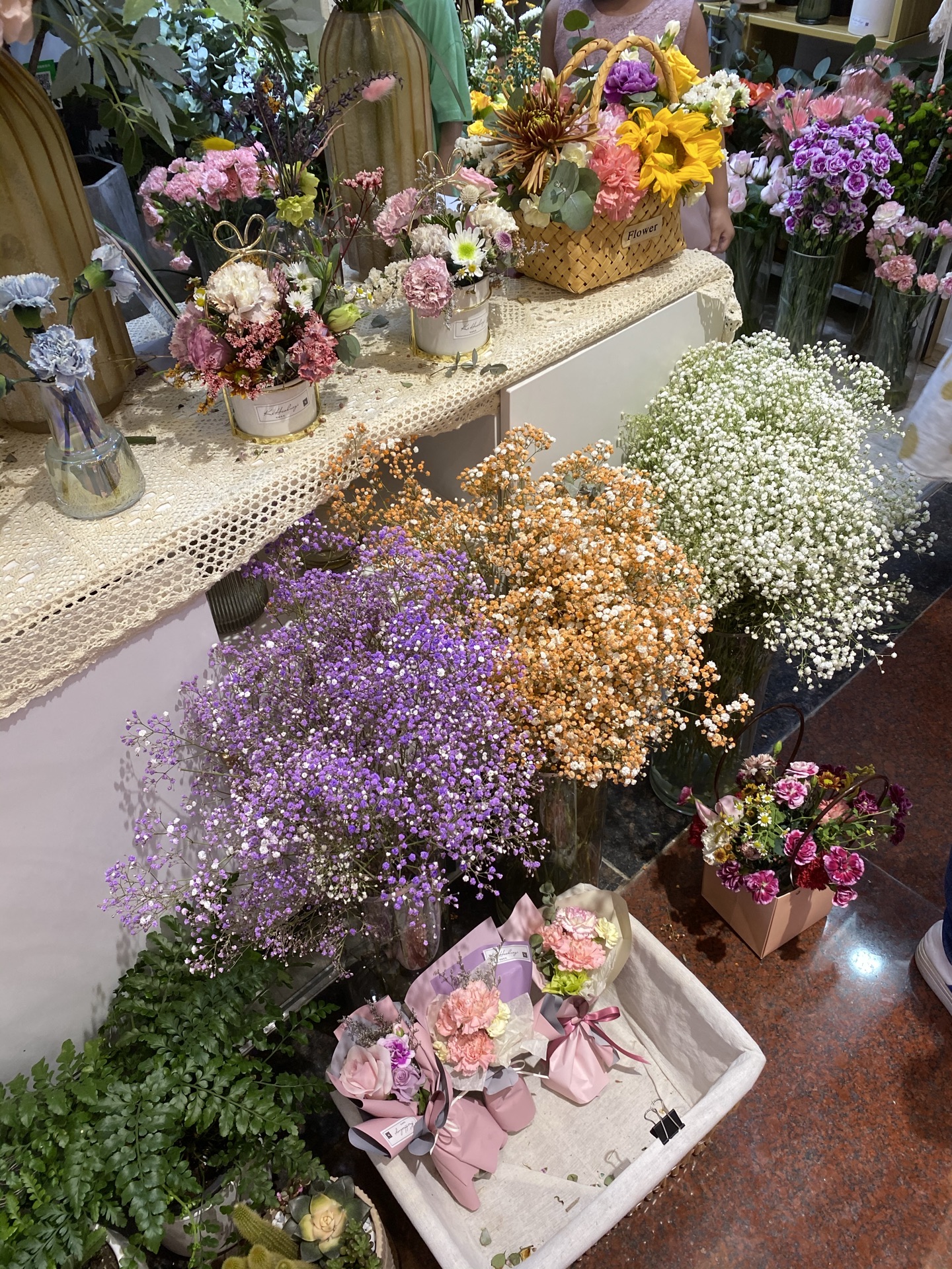 这一家花店位于江南西路的江南西名店城负一楼,地铁2号线江南西站A出口,一出来进入江南西名店城,左手边第一家店就是了。最近商场在做活动,所以我来到这里,一进门就见到好漂亮的花朵,这里的花朵颜色很鲜艳,有大花也有小花,有的用篮子插好,可以整一篮子花买走,也有一小束的花朵,或者也可以现场叫老板帮你打包好。
