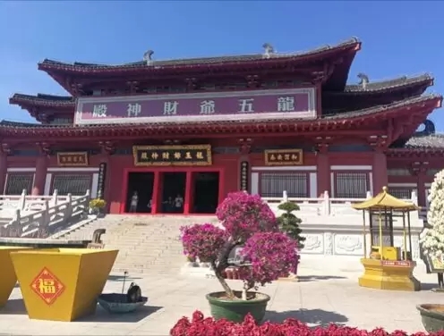 龙五爷财神殿供奉着南海龙王第五子——圣衍,龙五爷财神法像坐北朝南,庄严神圣龙五爷财神殿供奉着南海龙王第五子——圣衍,龙五爷财神法像坐北朝南,庄严神圣;慈悲威仪,广济天下,财神殿规模宏大,气势恢宏,主体建筑为上下两层殿堂,建筑风格独特、装饰精美,自外而内,层次分明,布局严谨。