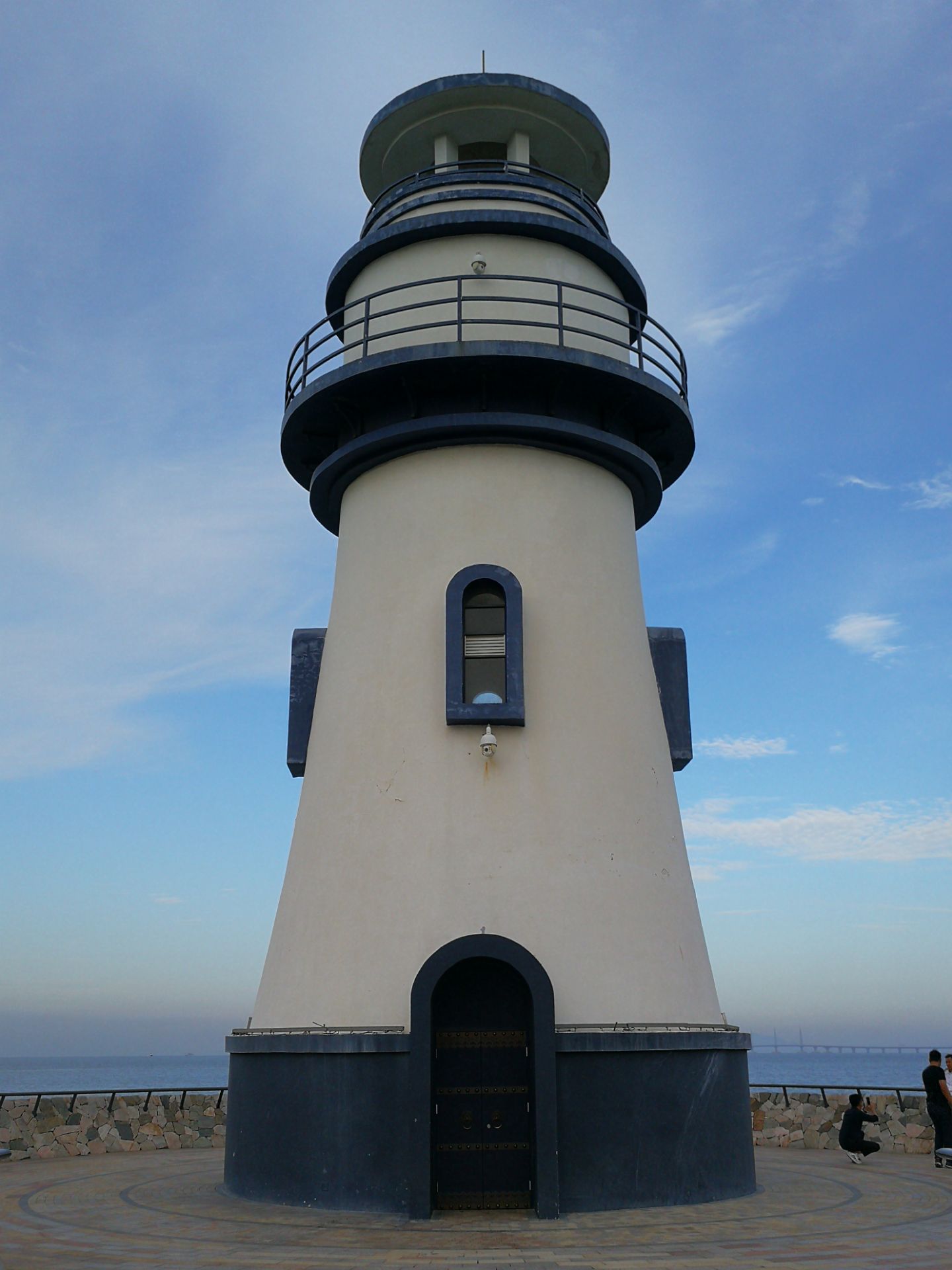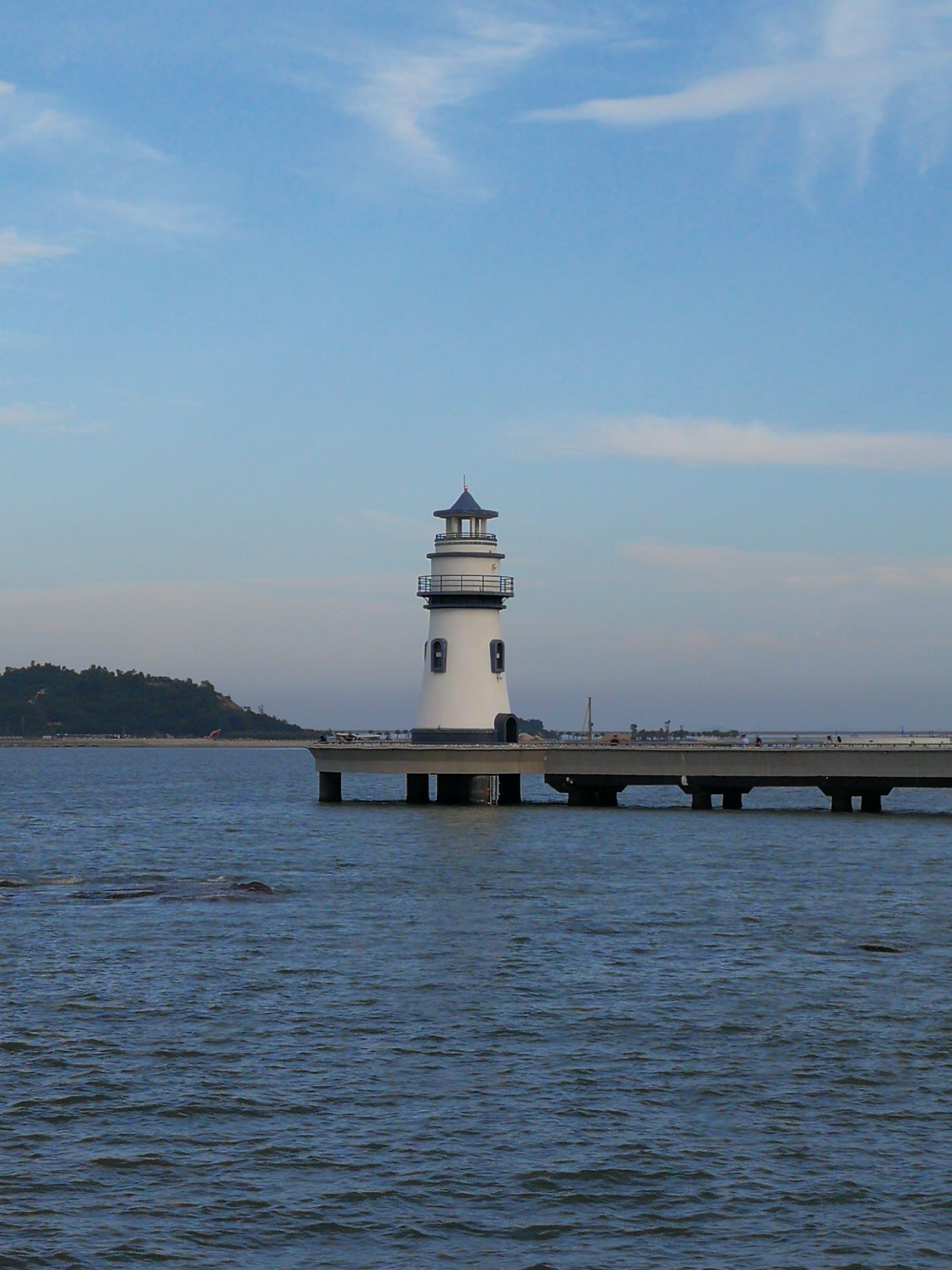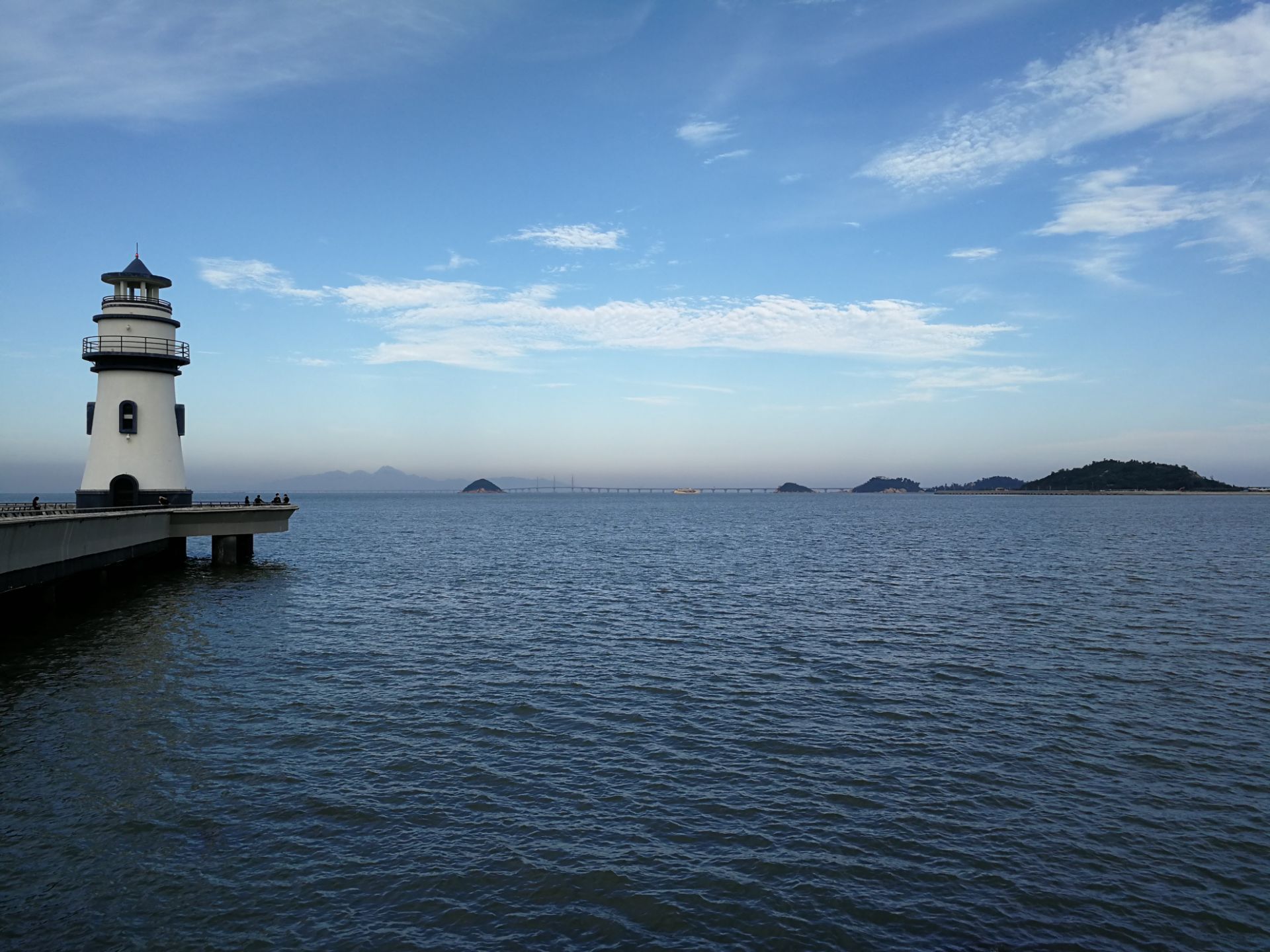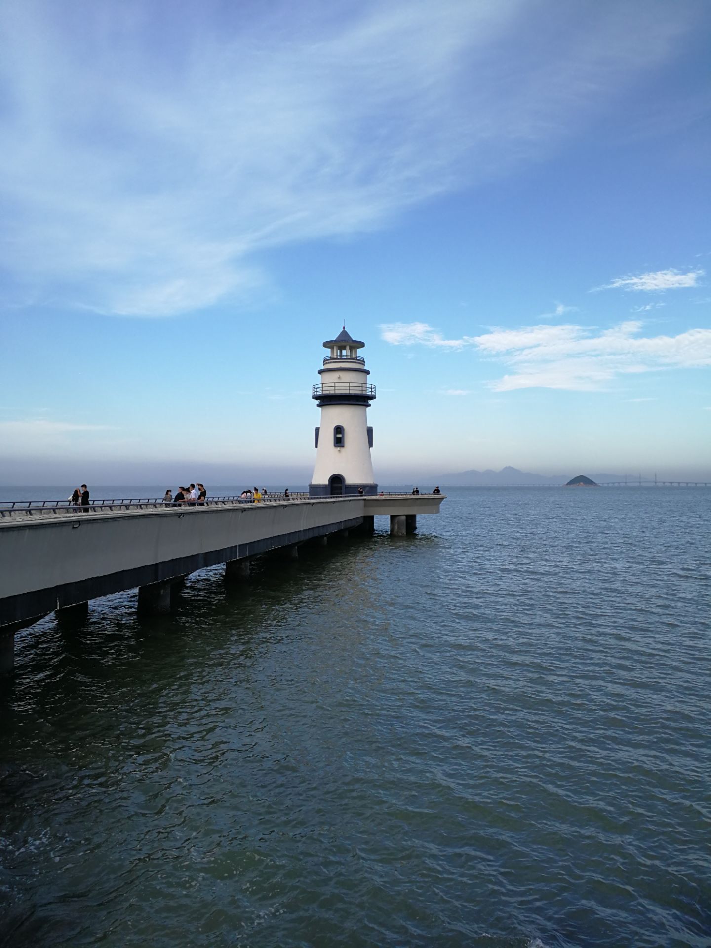 漫步在情侣中路南段,在靠近海滨泳场北岸时可以远远望见一座灯塔矗立近岸处,有海堤长廊通向它。 太阳☀️西落,海风习习,走向灯塔,漫步海堤长廊,气候宜人。站在灯塔下可以看见整个海湾和港珠澳大桥,堤上还设有专业放大摄影器材,可以将珠江口和大桥尽收眼底。