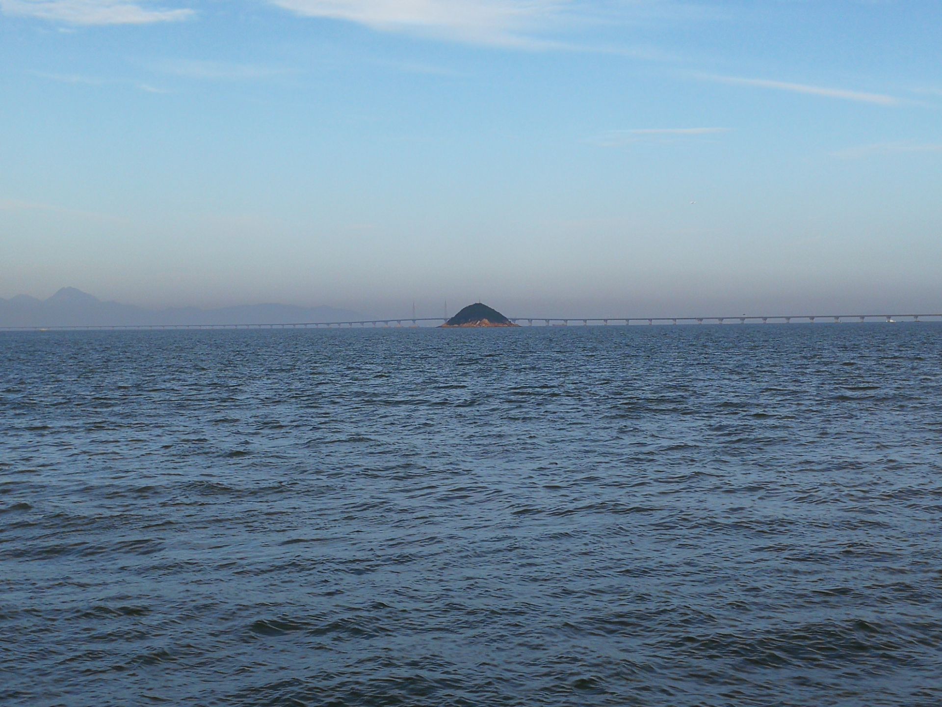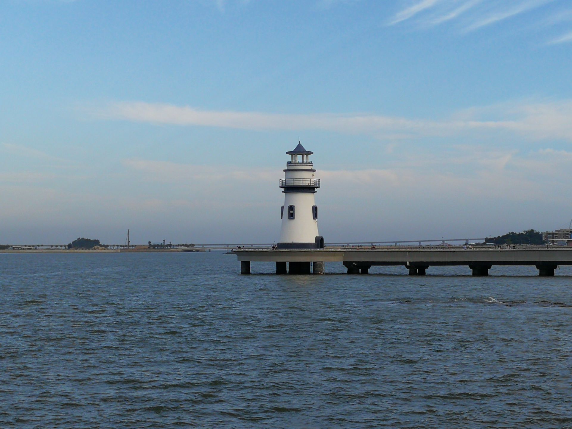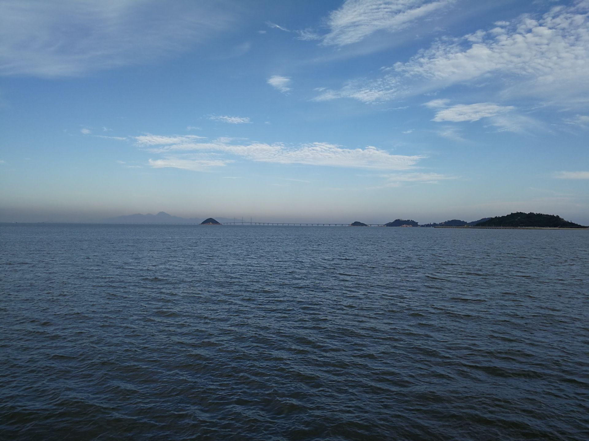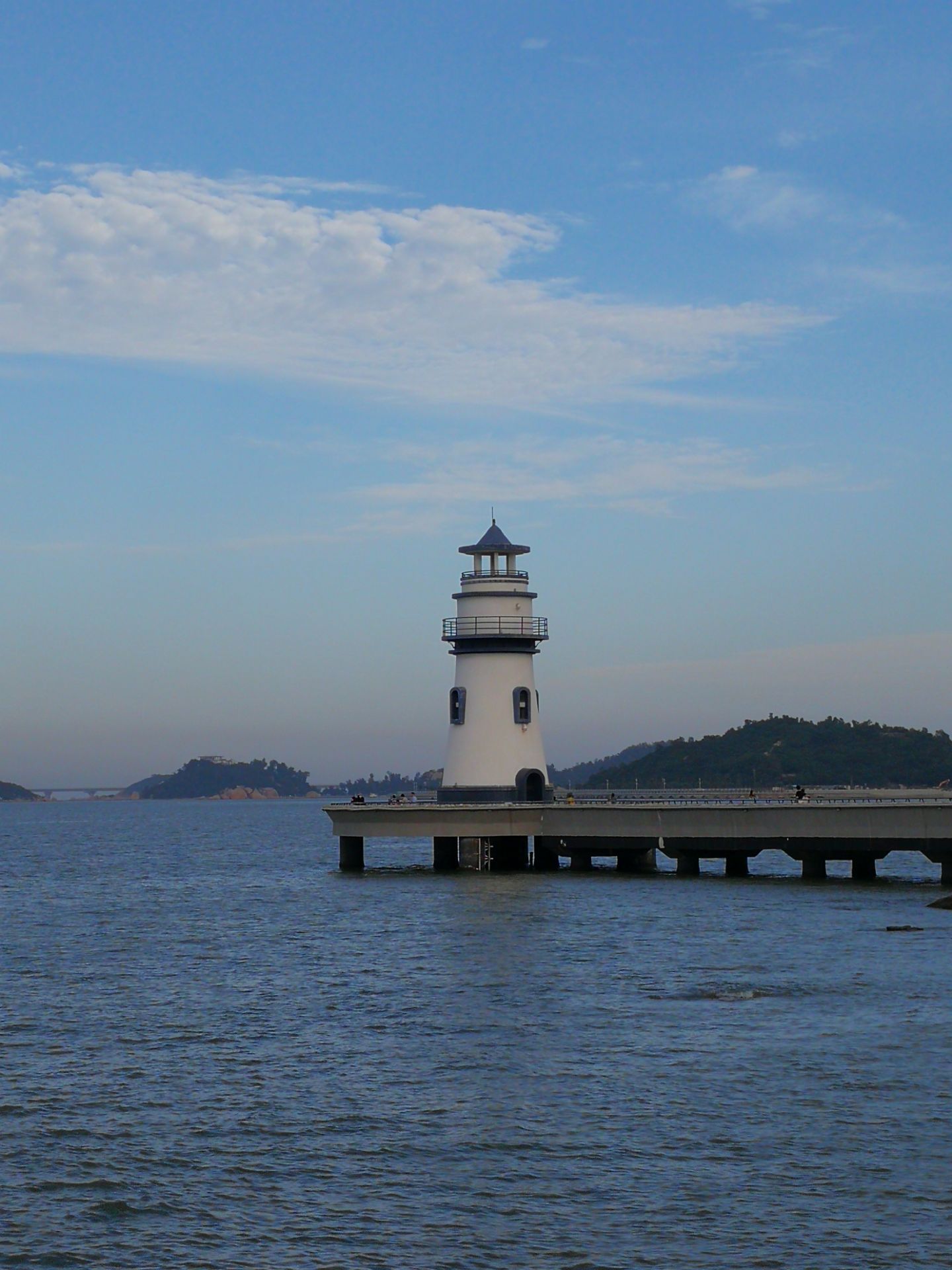 漫步在情侣中路南段,在靠近海滨泳场北岸时可以远远望见一座灯塔矗立近岸处,有海堤长廊通向它。 太阳☀️西落,海风习习,走向灯塔,漫步海堤长廊,气候宜人。站在灯塔下可以看见整个海湾和港珠澳大桥,堤上还设有专业放大摄影器材,可以将珠江口和大桥尽收眼底。