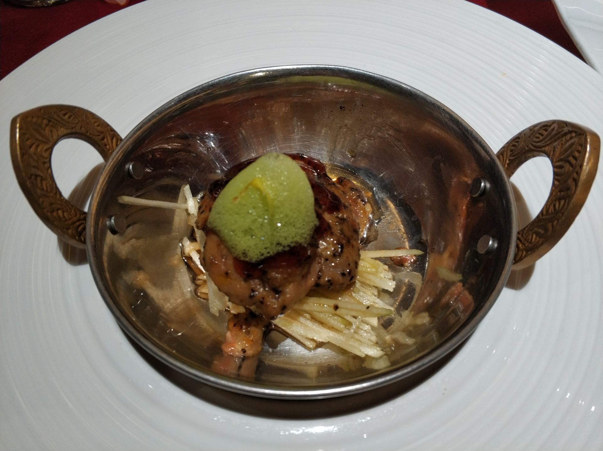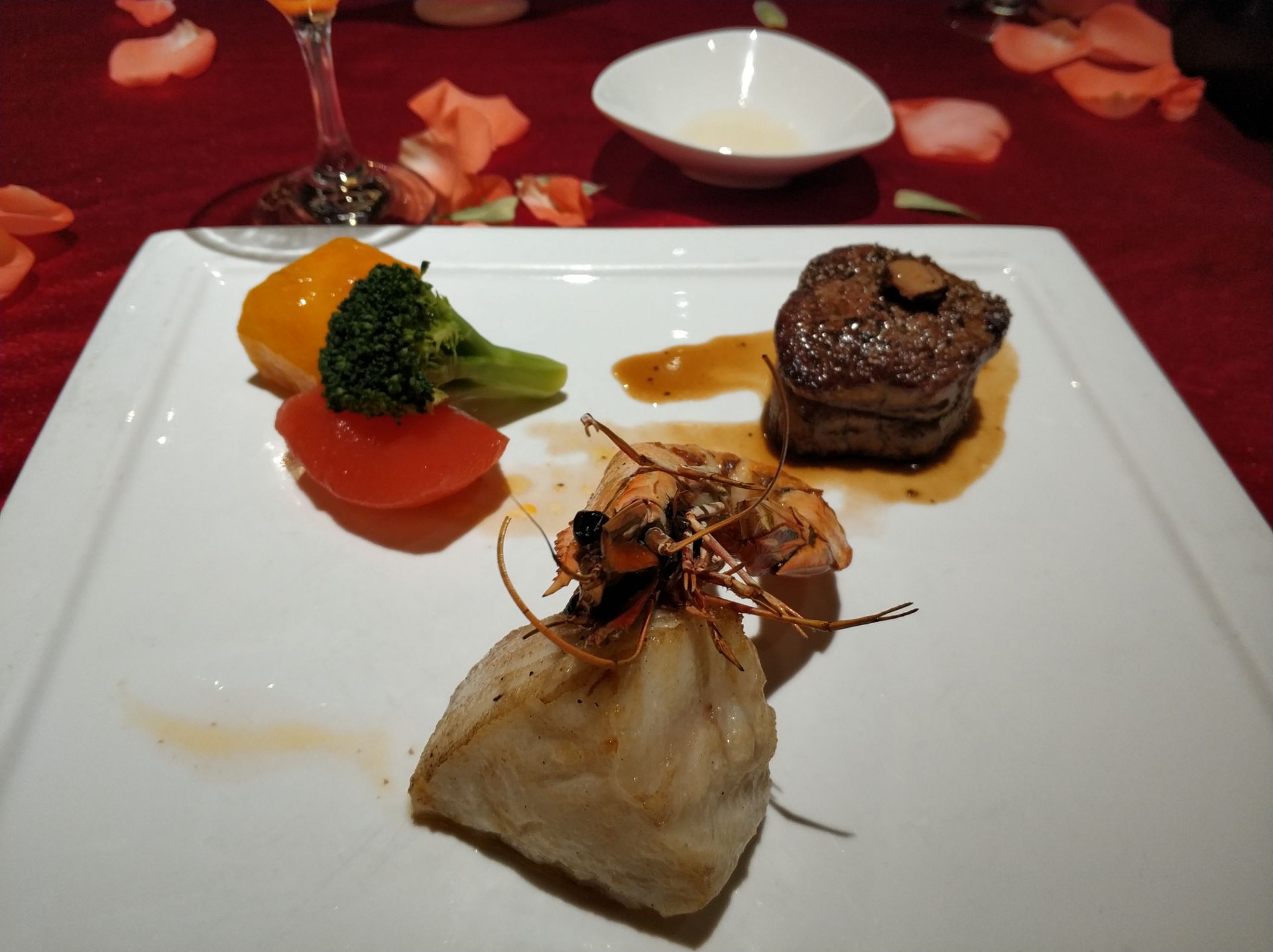 特地选了王品牛排庆祝度过痒痒之年,餐前面包很香,配了两种不同酱料;法式香煎鹅肝沙拉,鹅肝入口即化,唇齿留香;主食要了海陆双拼和招牌台塑,前者里面的鳕鱼很好吃,肉质嫩滑入味,后者是他家的主打了,只能选全熟的,略显老;甜品的玫瑰乳酪荔枝雪葩和香颂玫瑰露都属于颜值超高的那种,口感倒一般,他家很有氛围的布置了红桌布和花瓣,还有结婚纪念日礼物相赠,棒棒哒。