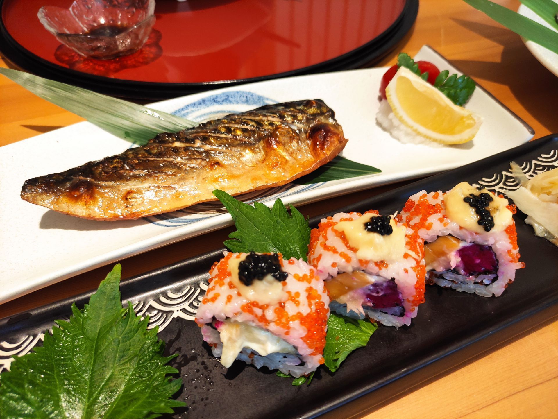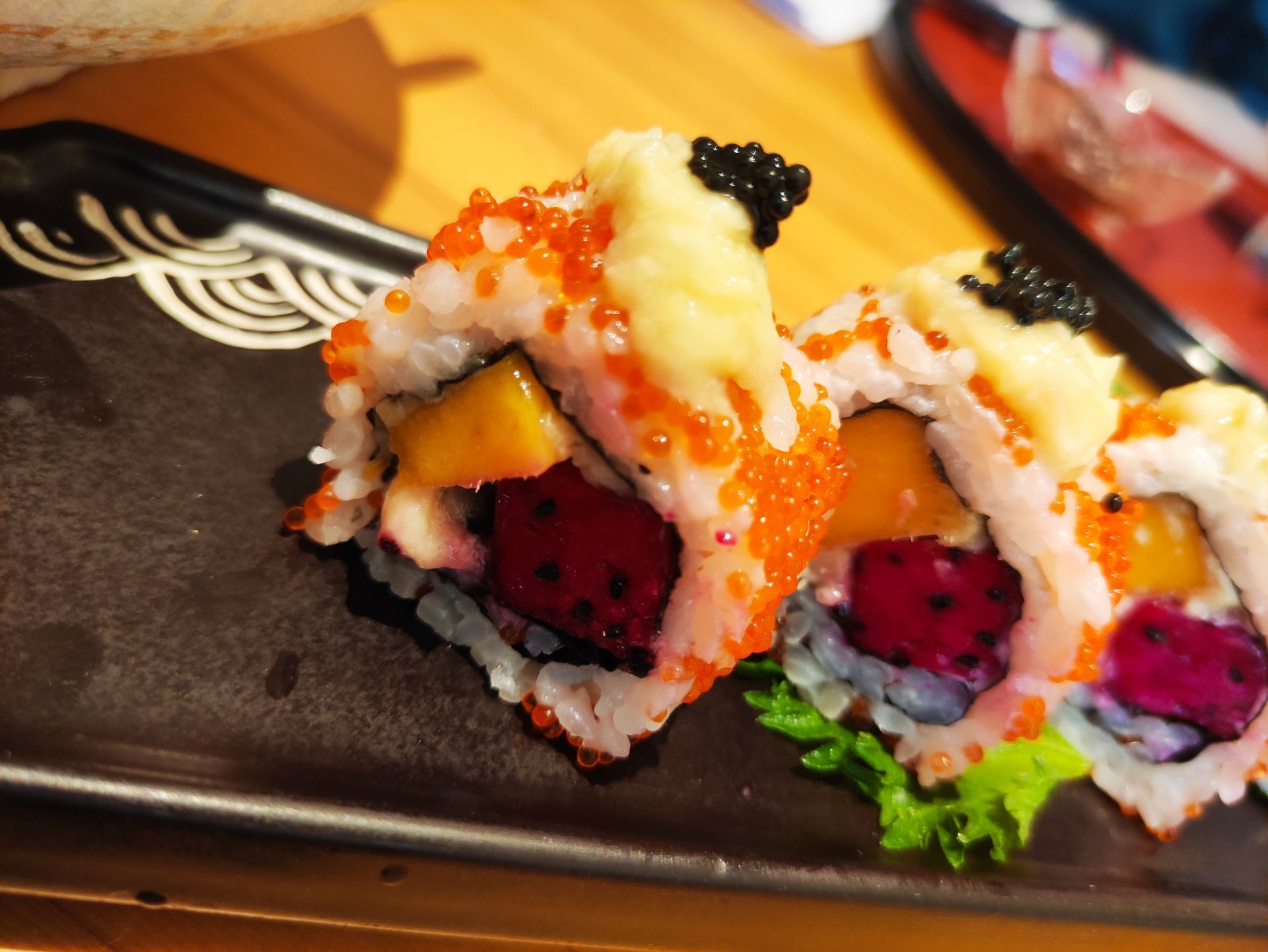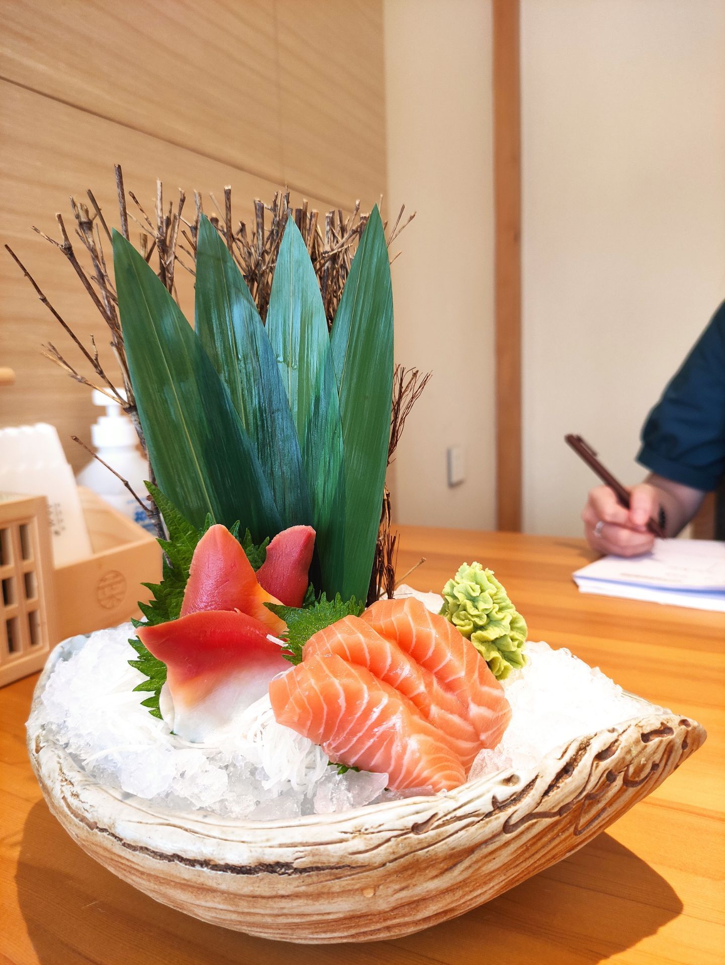 第几次来吃,照例是工作日午间套餐来一份,搭配均衡,还便宜不少钱。 来这吃饭记得提前预定小包厢,大厅环境虽好,但是人来人往的还是喜好包厢。 |三文鱼北极贝刺身双拼^刺身虽然长得都一样,但是品质好坏也是差距非常大的,不然也不会出现100多元日料自助和100多元一份刺身这种情况。 |榴莲水果卷^浓郁真榴莲,上桌味浓郁。 |烤青花鱼^老婆最爱,就是她吃完跟狗啃的一样。 |海鲜茶壶汤^每次来茶壶都不一样,我还是比较喜欢底下能加热的那种。 那些自助日料餐厅是吃不到这种|朴叶牛肉^的。 环境好,服务好,按了服务铃10秒就有人来,唯一不太好的就是牛肉炒饭不怎么好吃,味道有点寡淡,于是我自己加了辣椒拌一拌,还不错。