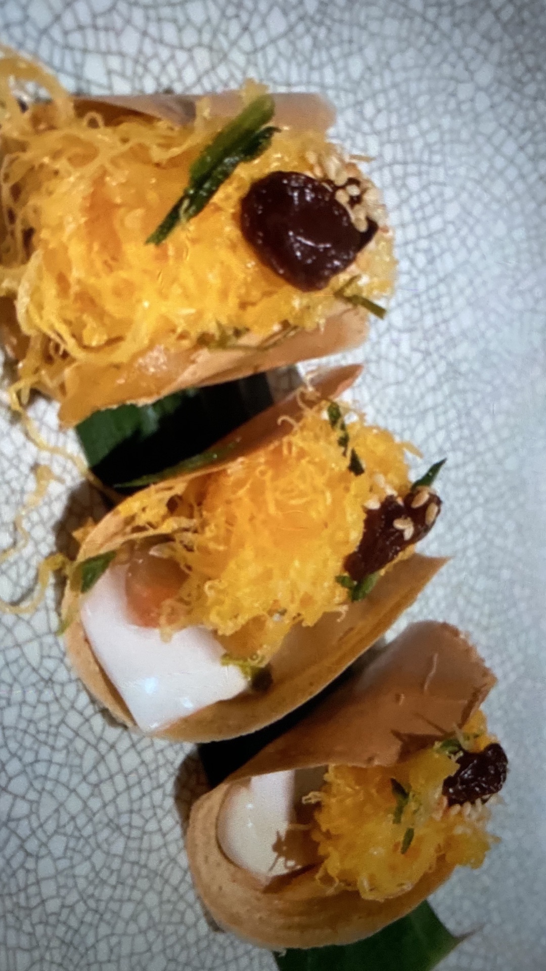 泰式的宫廷料理,必须提前预约,而且对于着装有要求的,服务很好,很专业地为你介绍菜色,小菜好吃,为你打开了味蕾,咖喱牛尾炖得很软烂,烤鱼好吃,味道很鲜,口感一点都不干,榴莲糯米饭味道很的很重,烦我我是不喜欢,菜色都用各种叶子包着吃,不算很难吃,上菜都的事都会在一旁教怎么吃,服务非常到位,菜色精致,下次有机会可以尝尝那里的鸡尾酒。