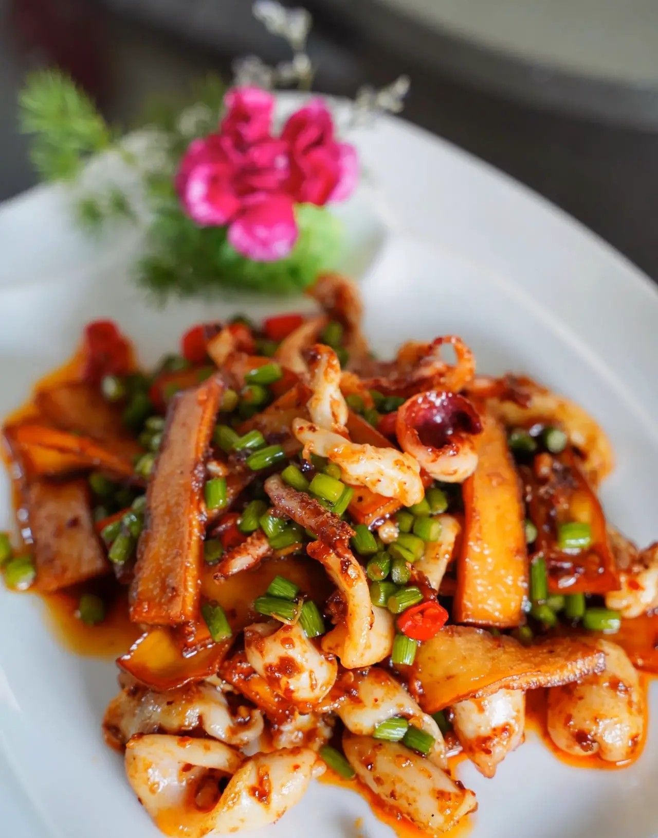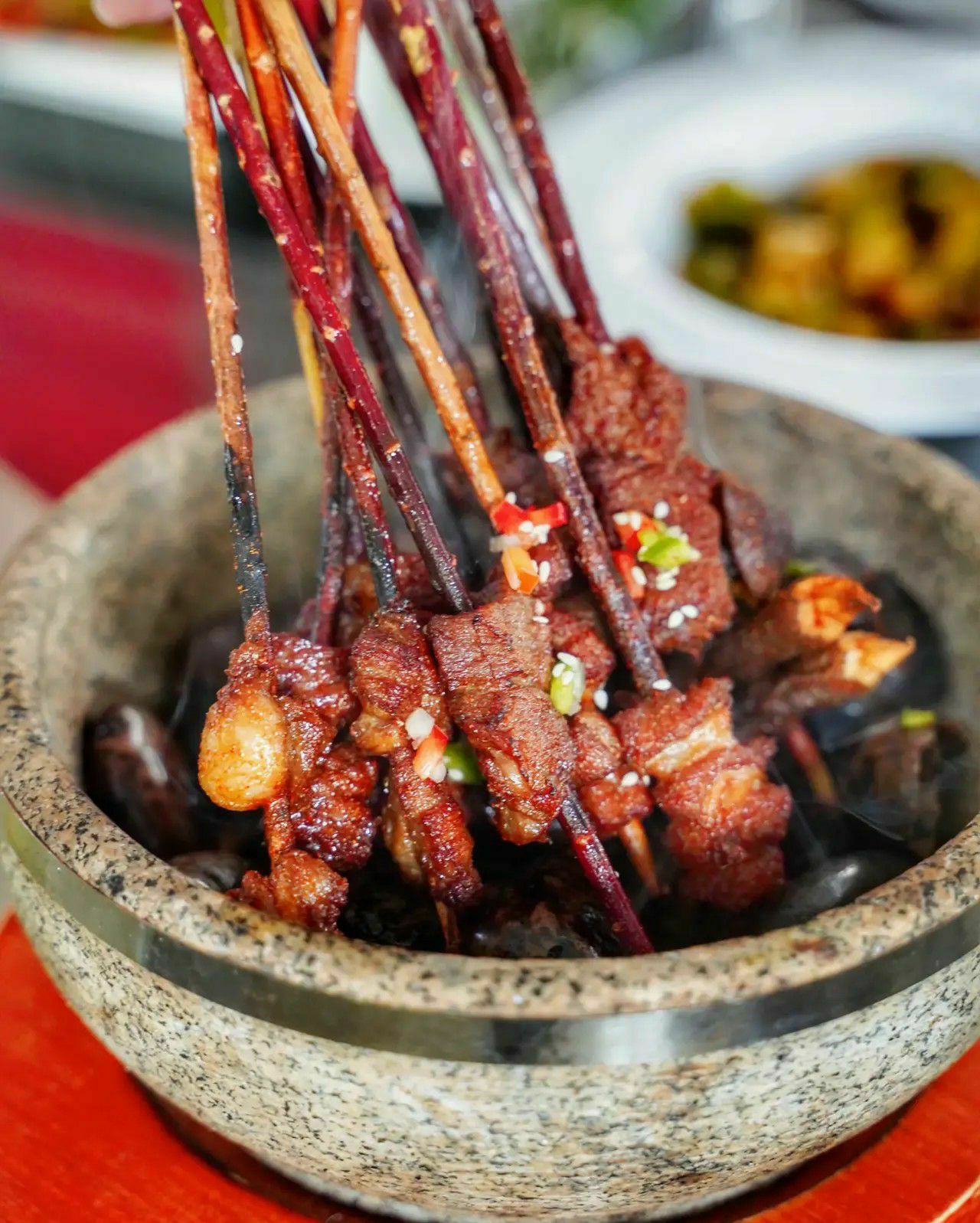 烤榴莲 用来当餐前水果也是够特别!选用金枕榴莲慢慢烤制而成,烧烤过的榴莲和你生吃榴莲不一样,即便是不喜欢的人也可能会爱上哦~对于我来说只要是榴莲都是我的爱,交给我我会把它全部消灭掉哦! 鳗鱼煲仔饭 煲仔饭一直都是我最爱的主食之一,粒粒分明的五常大米,肥美厚实的鳗鱼,可口的火腿粒和菜心碎汇聚一锅加入秘制酱汁,热气腾腾的吃起来真是超级满足。 一顿乱炒 名字虽叫乱炒但口味可不含糊,三层肉、猪肝和肥肠加泡椒爆炒,味道很家常口味很地道。 仔姜烧椒炒脆鳝 柔嫩又富有油脂的鳝鱼处理的完全无刺,嫩口的仔姜给味蕾带来一丝辣感,和豆豉的咸鲜交织在一起吃到停不下来。 石锅南瓜焖鲜鲍 Q弹爽口的鲍鱼仔和绵密香甜的日本金瓜,咸香交织滑爽入味,超级下饭。 酱爆小管鱿鱼 小管(鱿鱼)是闽南人很喜欢吃的一种海鲜,肉质脆弹鲜甜嫩口,搭配鸡腿菇和蒜薹一同炒制,入口香脆可口酱香气十足。 串烧安格斯牛肉 红柳枝上串着肥美的安格斯牛肉,烤的外焦里嫩的,配肉质细嫩肥厚鲜香的鸡枞菌不仅口感脆嫩也很有营养。 仔姜小管烧菜蟹 除了川菜还有海鲜类,脆爽的小管配细嫩的菜蟹,粉丝入味Q弹,爱海鲜的不要错过。 蒜泥白肉 店内长盛不衰的经典菜,多年来无论猪肉怎么涨这道菜都没涨过哦,肥美多汁的五花肉,蘸着蒜泥酱汁送入口,蒜香浓郁,咸辣鲜香,底下铺着一层青瓜清爽解腻。