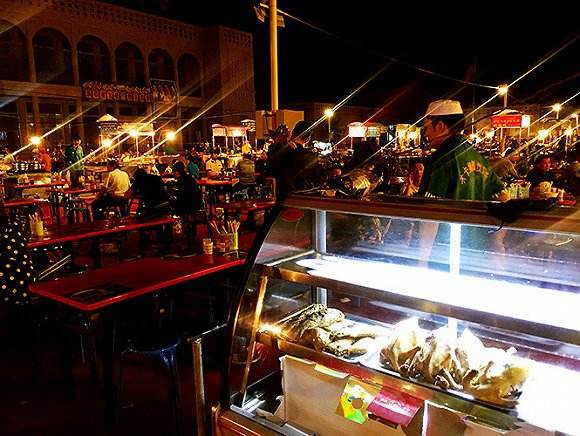 长沙·葡萄主题公园夜市最大的亮点是它的就餐区位于葡萄架下,这里还根据不同的主题配置各式桌椅和花灯,比如绚丽时尚主题会设置黑白色调的几何图案灯饰以及时尚现代的桌椅;民族特色主题则以艾德莱丝花纹元素的桌椅为主,在古朴灯饰的掩映下更具民族风情。
