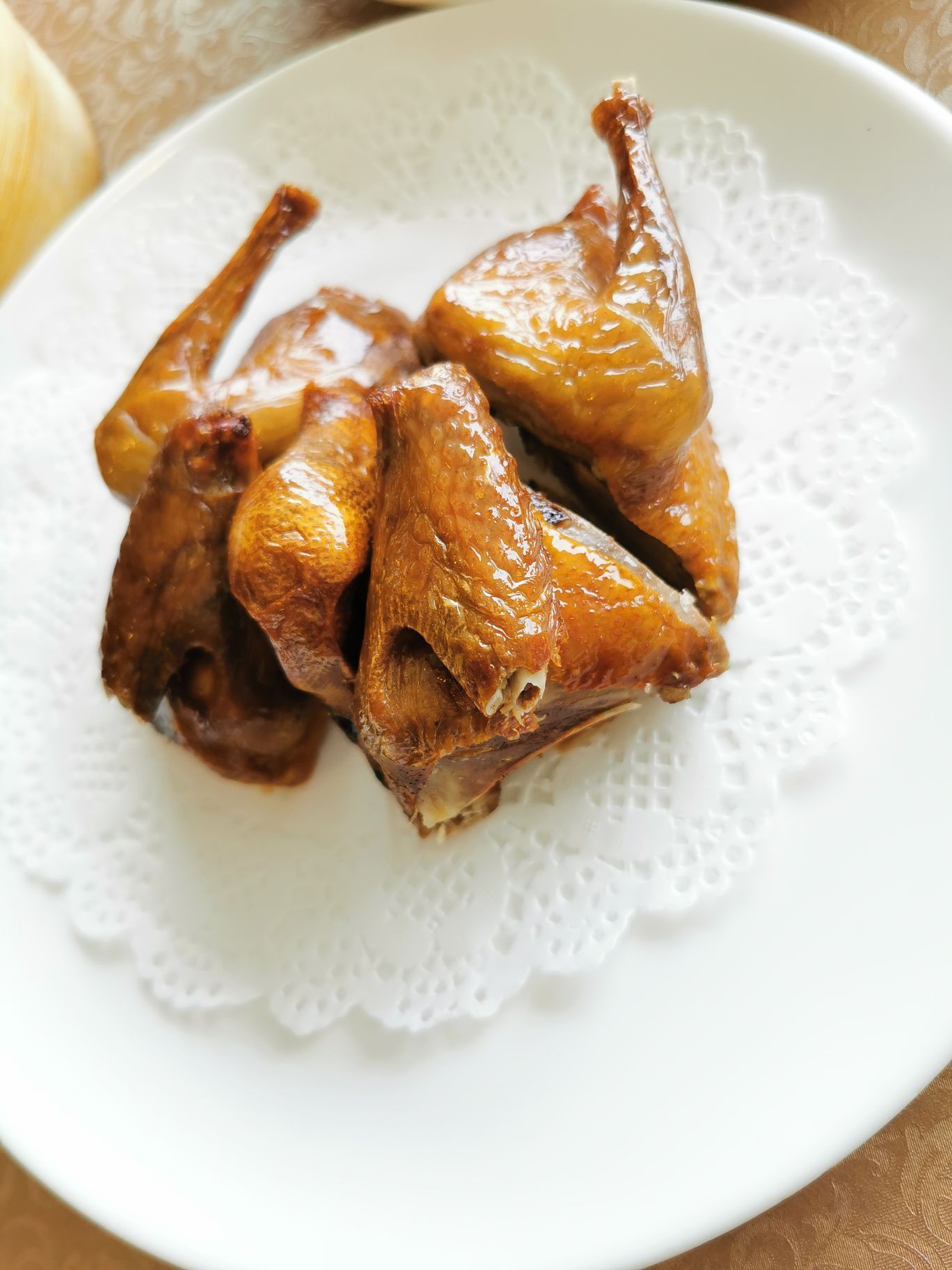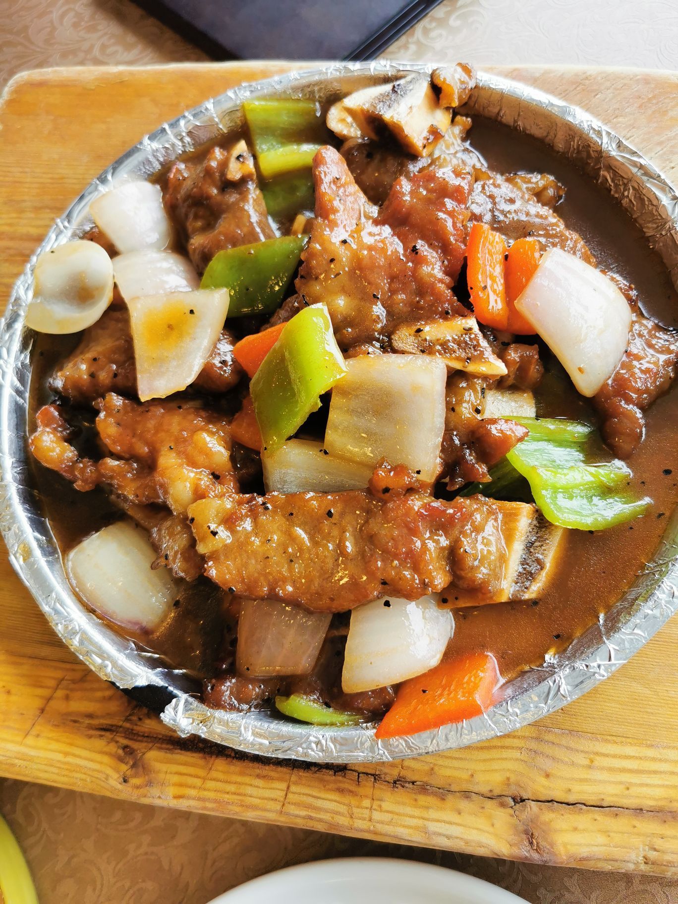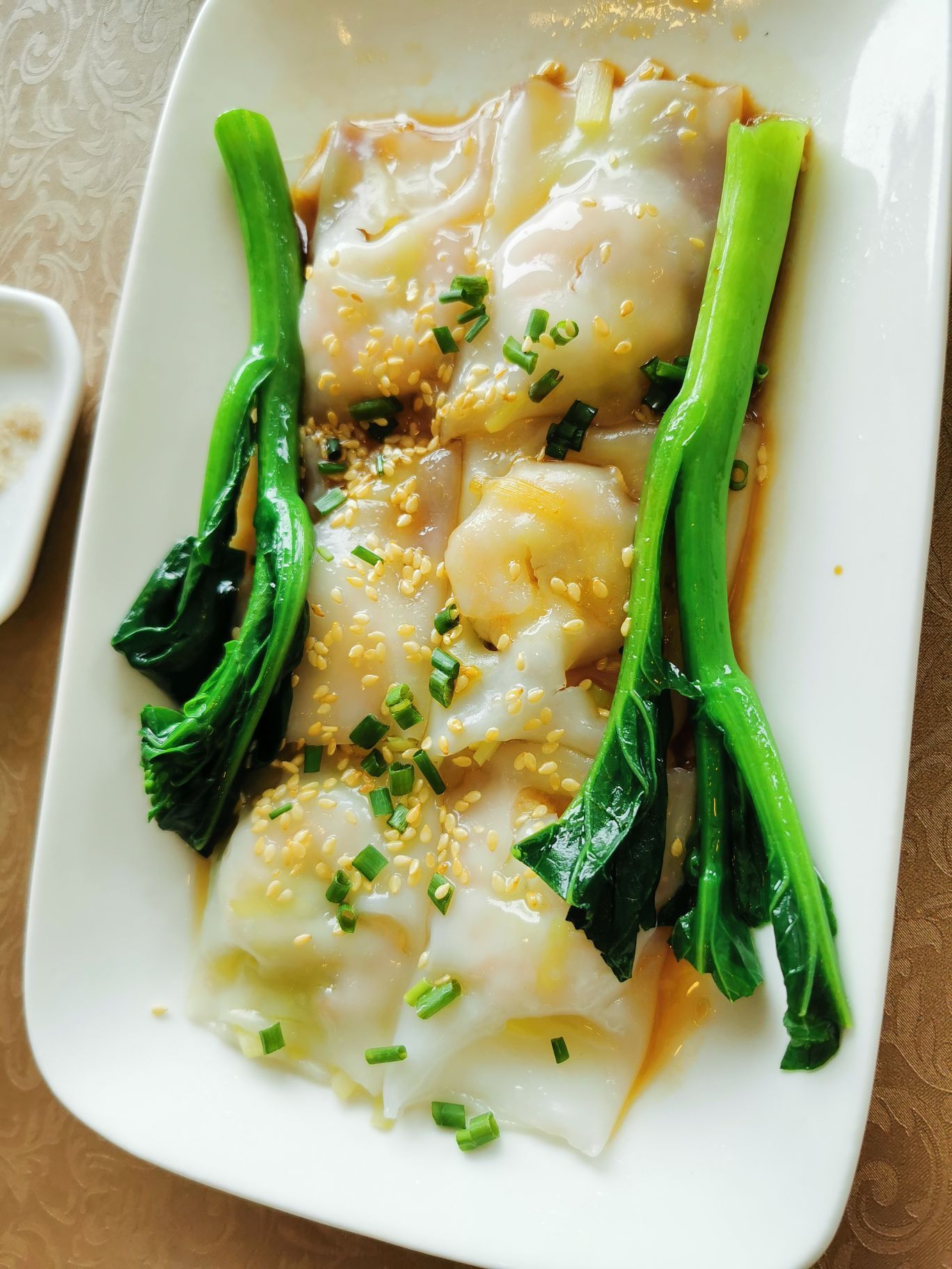 一品粤珍轩,餐厅开了好久了,在吴中路万源路口,周边有公交,自驾比较方便,用餐可以免费停3小时。 【环境】 餐厅的环境一般,是比较老旧的装潢,一个用餐大厅,周边有几个包房。地毯和装饰都非常陈旧,好在现在每桌之间间距很大,显得很宽敞和明亮。 【口味】 铁板牛肋骨,牛肉嫩嫩的,量也挺大的,很多牛肋骨,肉肉多,和洋葱彩椒一起铁板烧,吃起来很香,好吃哒。 虾饺皇,是他家推荐的招牌点心,每个里面一个大虾,口感Q弹,推荐。 脆皮乳鸽,很好吃,乳鸽外脆里嫩,带着鲜美的汁水,推荐。 一品肠粉,粉皮比较筋道,肠粉里面有虾,口味清淡鲜美,喜欢的。 另外,煎藕饼和麻球,也都很好吃,就是有点油,(这个不油也没办法做),😅 粤珍轩的菜品和味道,都挺好,是性价比比较高的一家餐厅。