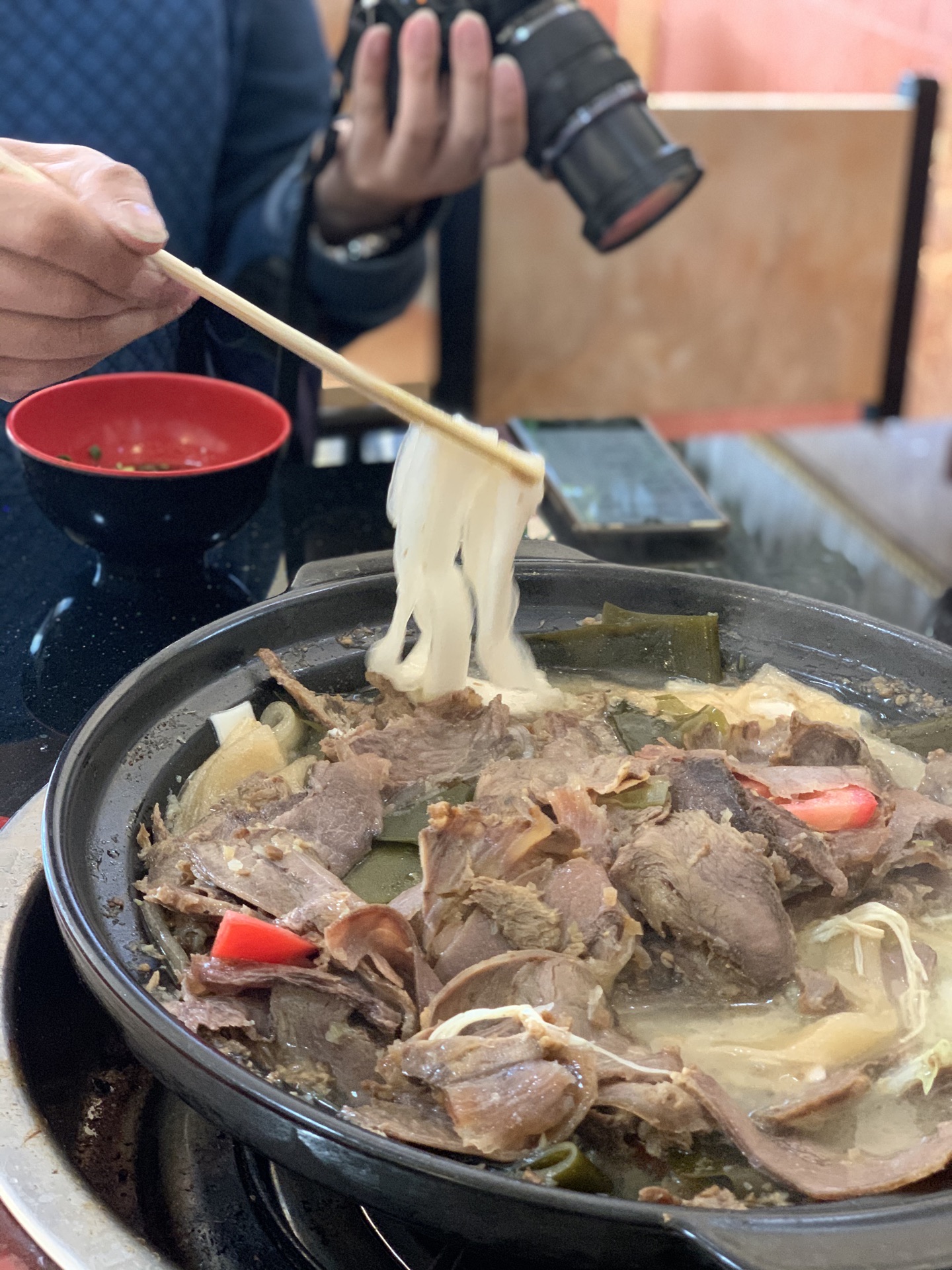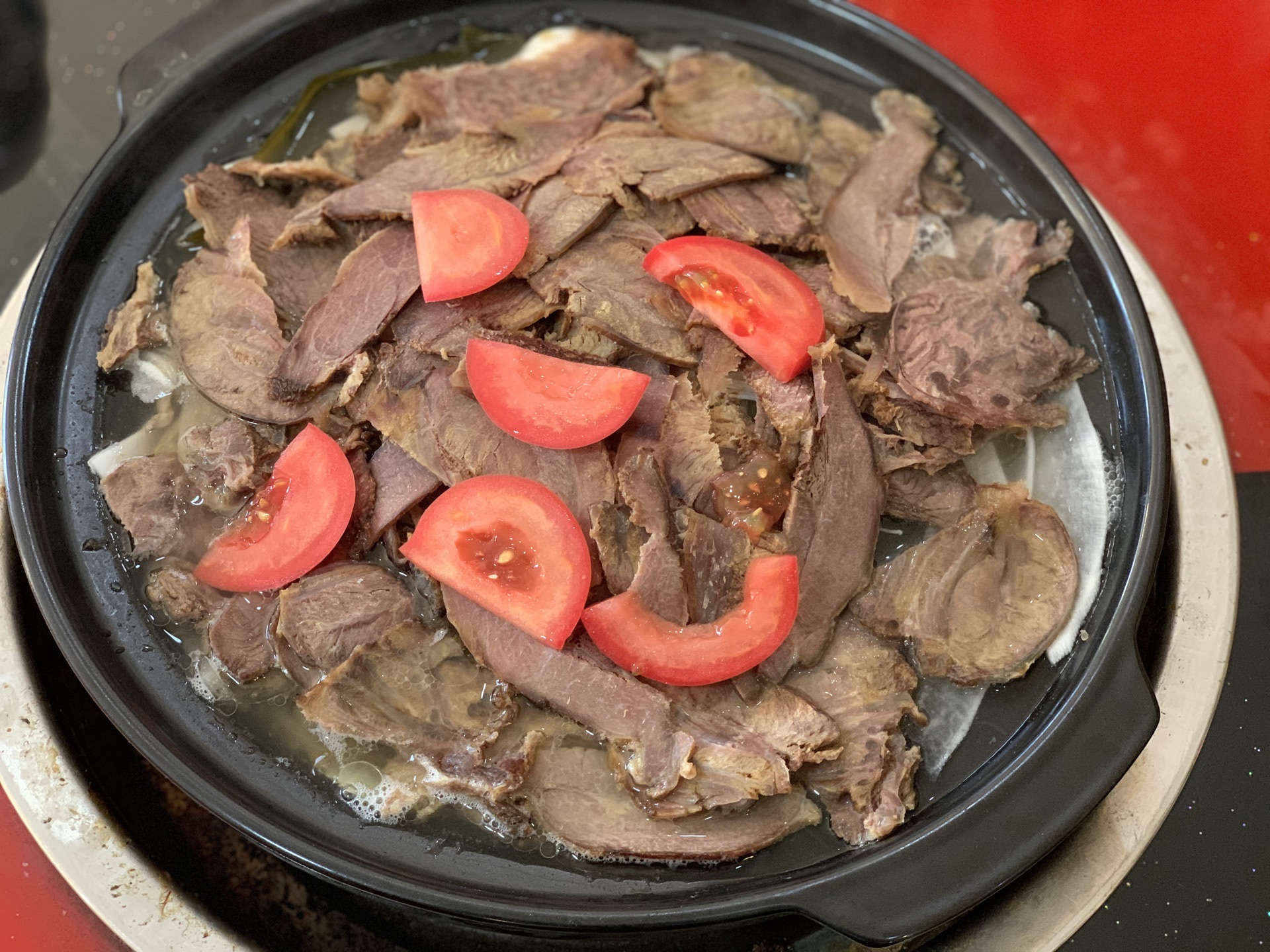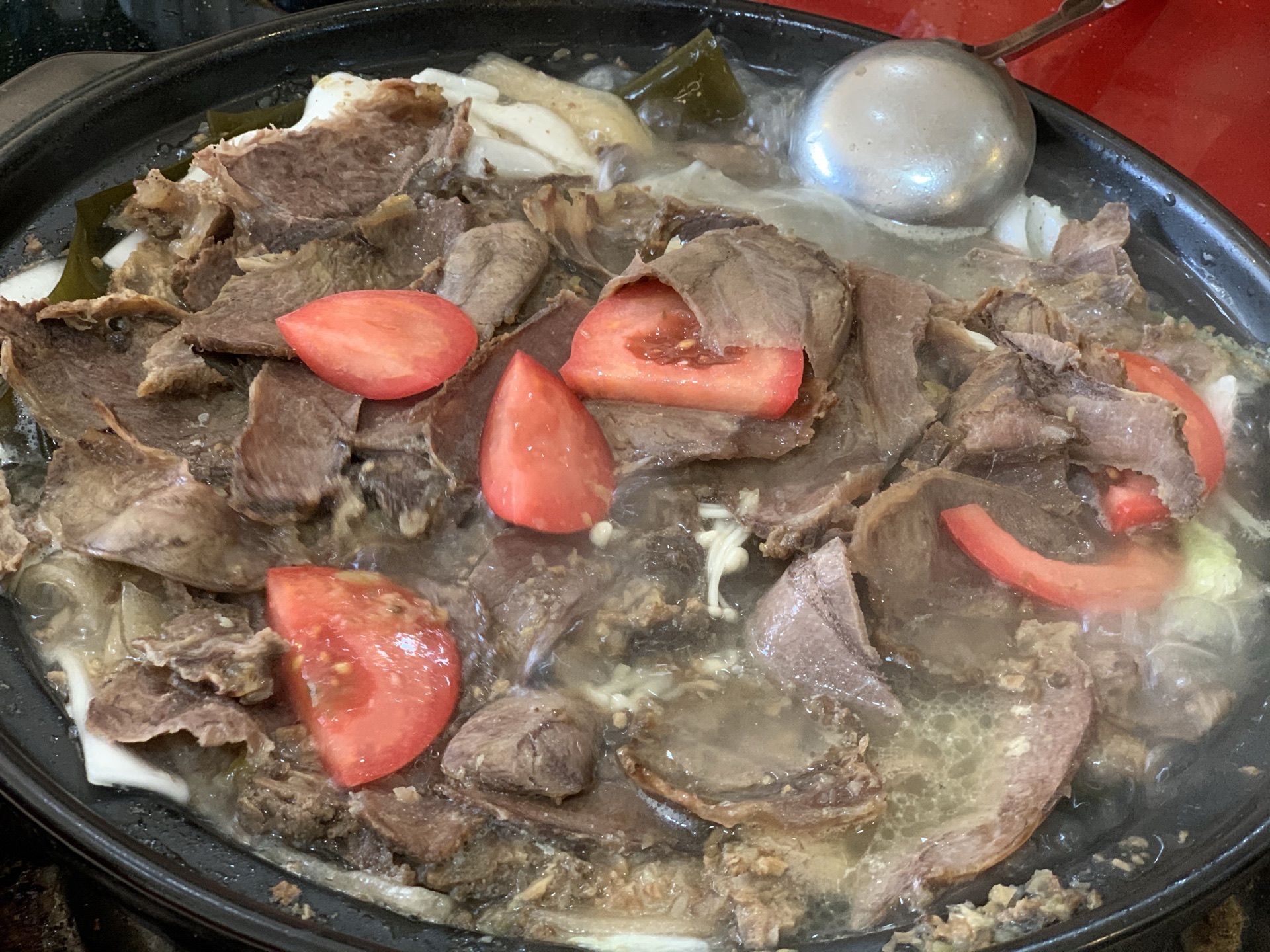 我发觉若尔盖县城真的比红原好太多太多了,建议千万不要去红原吃东西。 说是脏乱差一点儿不过分,但是若尔盖就不一样了,虽然也是小小的,但感觉还挺卫生的,汉化得比较全面了,饮食方面也感觉选择很多,比较多元化一点。 在众多餐馆里面,我们选了这家,理由有二。 第一是我们觉得好像牦牛肉汤锅是当地特色,所以需要亲自尝尝看。 第二是他们家的评价是真的还蛮好的,在众多牦牛肉汤锅里面。 买了一份三人餐138元,然后需要额外支付每人5元的调味料费用。 人均差不多50元,肉还特别多,真的是性价比极高了。 【牦牛肉汤锅】 这个三人餐的牦牛肉真的巨多,并不仅仅是表面看到的那些牛肉片哦,下面还有哦。 以及一些素菜也在下面,特别丰富。 如果不额外加素菜其实也够了,加了也没吃完。 因为套餐里包含了两个素菜,所以我们也就一起倒进锅里了。 牛肉是比较有嚼劲的口感,是先已经煮熟了的,所以只需要锅开就可以吃了。 本身味道比较淡,汤底也是,所以需要自己调一个调味碟。 老板是一个年轻小伙子,态度挺好的,也很热情积极。 他们家生意是真的很好,多是游客过来的,一大家子那种,饭点就会楼上楼下坐满。