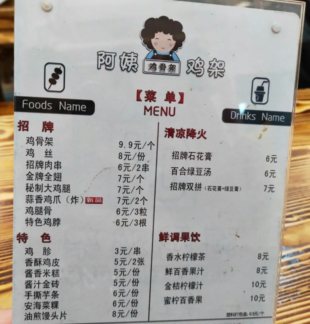 走走tingting的美食笔记 这家的炸物在西街是比较有名的,两个人点了两个鸡翅,-一个鸡骨架,两份绿豆石花膏。鸡骨架和鸡翅的味道是一样的,个人推荐鸡翅,鸡翅肉比较多而且好吃,咬下去肉汁都溅到手上,外皮香脆里面的肉嫩滑可口。鸡架就是鸡骨架,所以肉少,但吃起来更香。百合绿豆 普普通通,不过冰凉爽口,搭配这些上火的炸物倒也是不错。 就是店太小了,只有五张小桌子,所以几乎都要排队等,或是打包回去吃。
