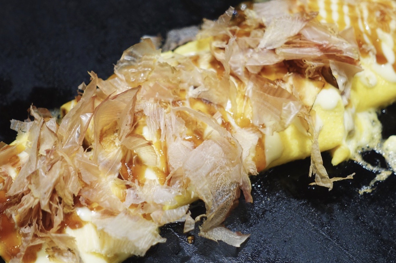 蛋包奶酪烤猪肉片也特别好吃,嫩滑的鸡蛋包裹着油滋滋的猪肉片,淋着一层奶酪,撒了许多木鱼花