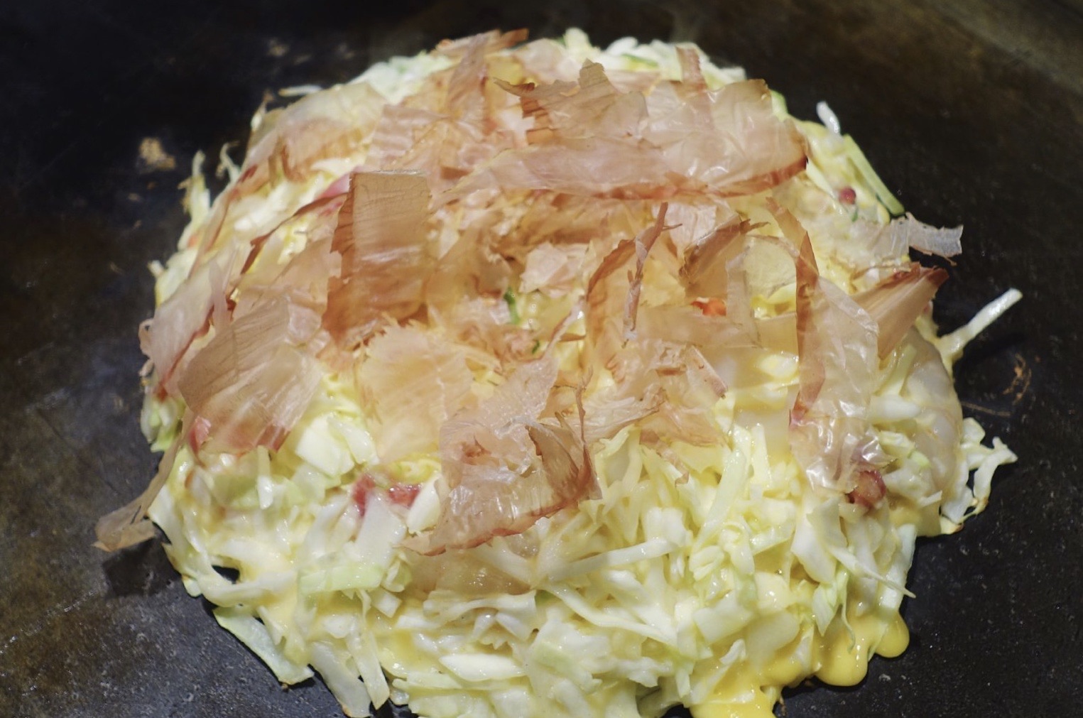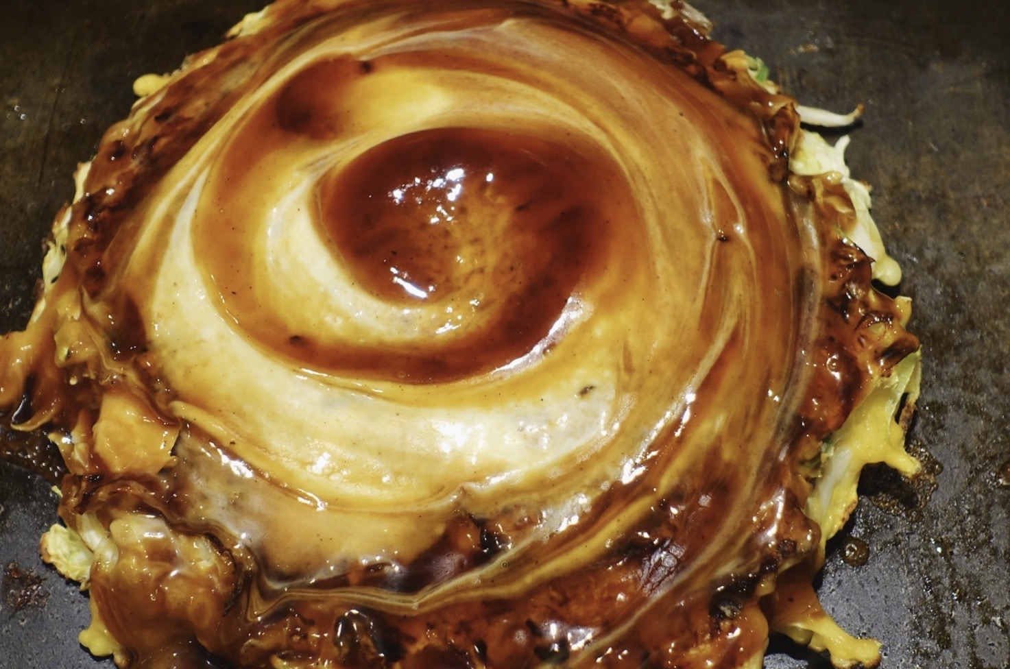 来到大阪怎能不感受一把大阪烧的魅力呢!鹤桥风月在大阪有许多分店,这家店是离我们住的酒店最近的一家。 五点的时候店里还只有寥寥几桌顾客,不一会儿便渐渐热闹起来。点了份风月煎饼,鱿鱼、虾仁、猪肉、牛肉、卷心菜和面糊混合在一起倒在铁板上,熟了之后翻个面继续烤制,直到两面都变得焦脆,最后涂上酱汁就完成了。 蛋包奶酪烤猪肉片也特别好吃,嫩滑的鸡蛋包裹着油滋滋的猪肉片,淋着一层奶酪,撒了许多木鱼花。加热后奶酪微融,浓香四溢,诱人极了。