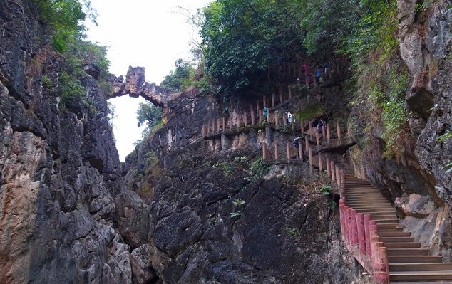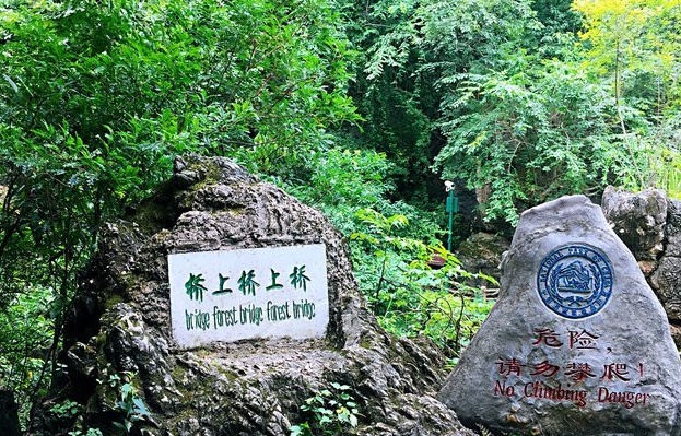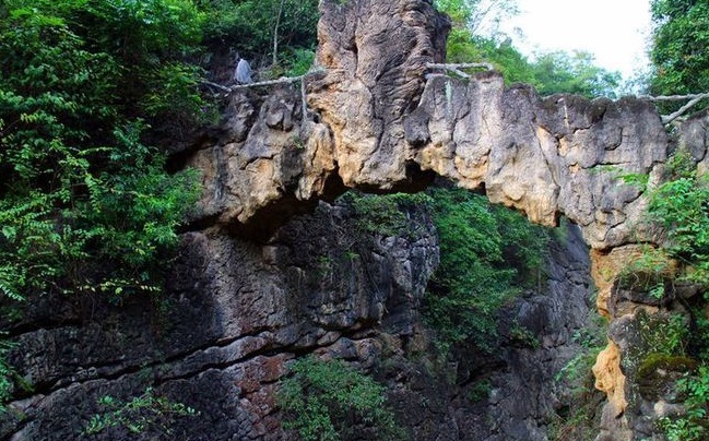左右各一截,是从悬崖伸出的石头,构成桥梁左右部分,怪就怪在中间那块巨石,它仿佛从天而降的的楔子在冒水塘上方就是桥上桥上桥,它不像其他的天生桥,是一个完整石头,此桥是由三截构成。左右各一截,是从悬崖伸出的石头,构成桥梁左右部分,怪就怪在中间那块巨石,它仿佛从天而降的的楔子。