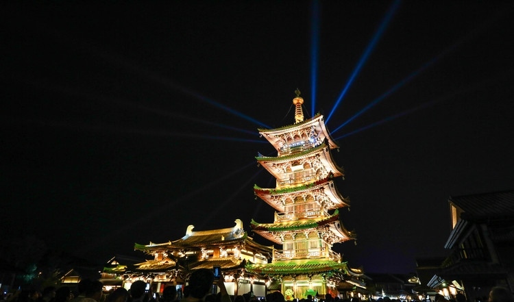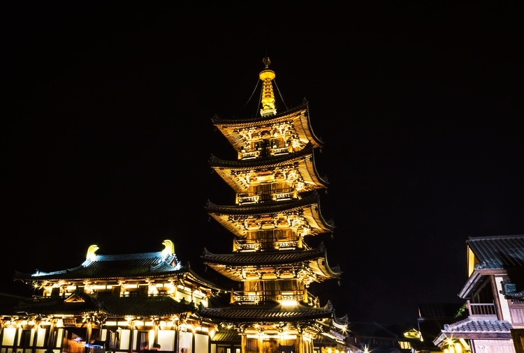 拈花塔,为唐风木结构楼阁式佛塔,四方五层,由须弥座台基、塔身、塔刹三部分组成拈花塔,为唐风木结构楼阁式佛塔,四方五层,由须弥座台基、塔身、塔刹三部分组成。 晚上,拈花塔还有亮灯仪式,会有表演,想看的清楚点话,要早点去占个好位置。