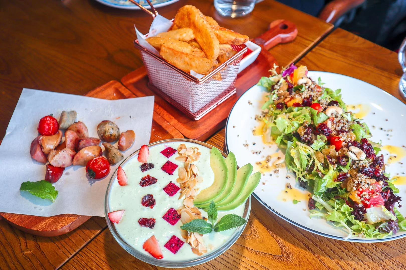 第一个上的居然是牛肉披萨,感觉上菜顺序可以调整一下。选了不要洋葱的披萨,很合口味,披萨微偏甜,牛肉很嫩滑,推荐。第二个上了奇异果汁,很浓郁,唯一就是奇异果果颈没取,有点不好嚼。建议下次能去掉就好了。然后上了低温牛肉百香果藜麦沙拉,牛肉全熟,很嫩很好吃,给的淋酱不是很喜欢。沙拉的菜不是有机蔬菜,口感不是很好,但是性价比在线。最后两样肉菜中规中矩。