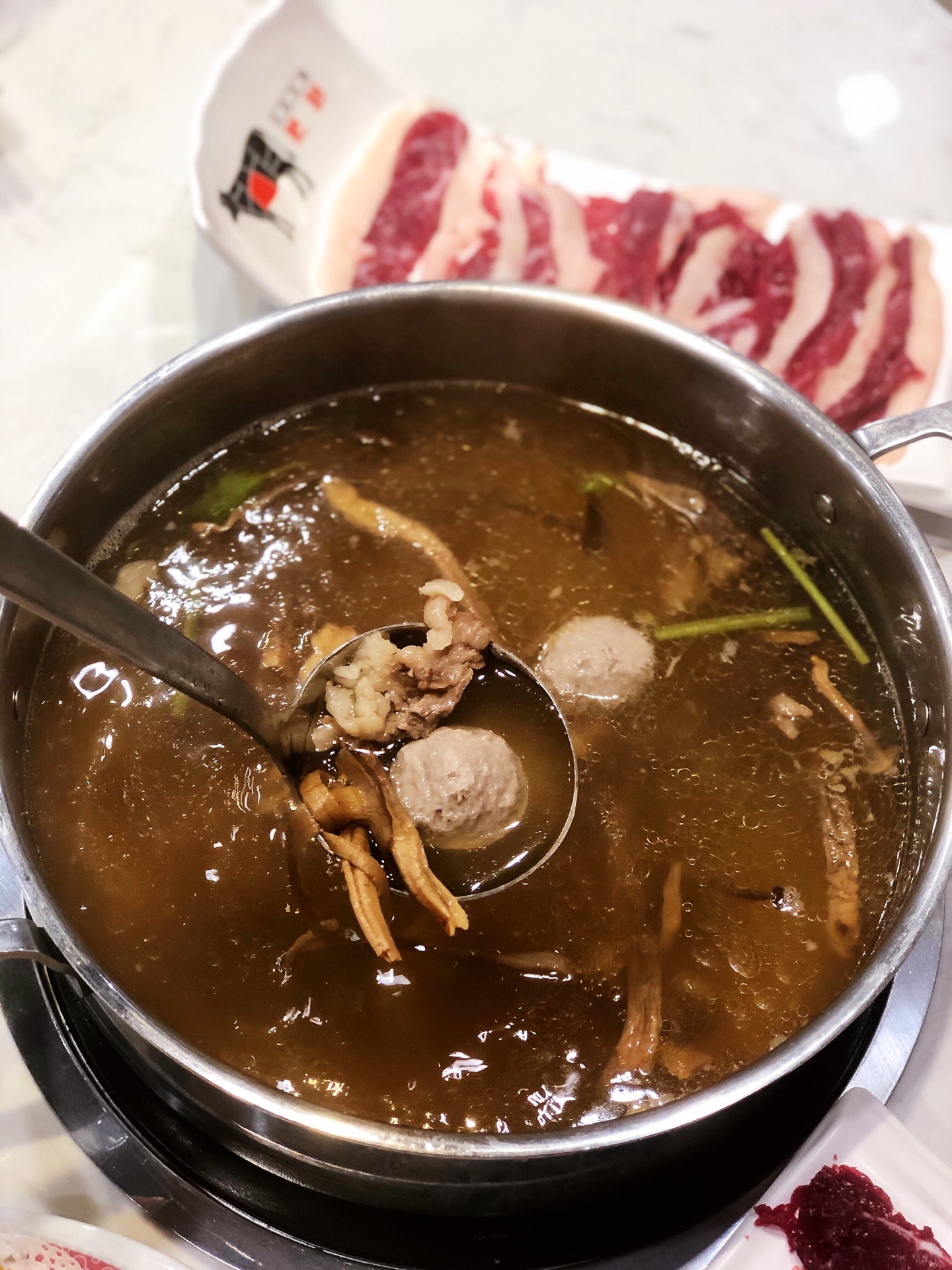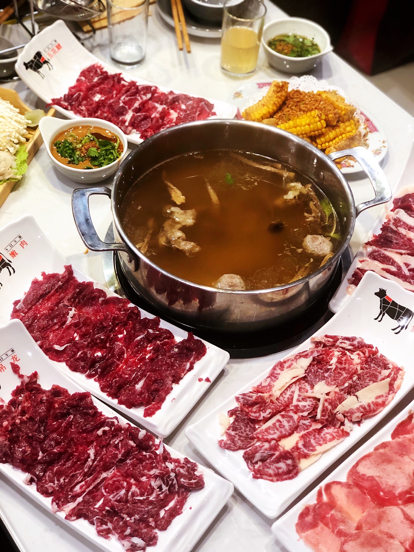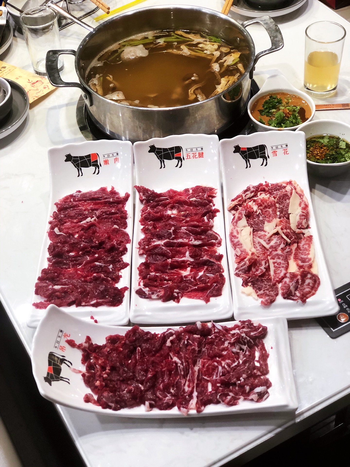 八大菜系里最爱粤系,而潮汕菜又以其发源地拔得头筹。原真本味,品出食材的真鲜,在火锅界也是非常地优秀。🍲一酱一肉一汤,没有繁杂的工序,本味至简,品出牛肉真味道,这就是蛋花今天去吃的这家潮汕牛肉火锅带给我的最大体会。 店里装修得敞亮简洁,入口开放式的厨房,看着大厨们刀起刀落,一副热火朝天的繁忙景象,服务员很耐心的介绍着牛肉每个部位的不同,一遍顾客根据自己的喜好选择食材。 吃前先喝汤,汤底是用牛大骨,牛腩和鹿茸菌熬制而成,烧开后撒上少许葱花,芹菜,汤头纯净清亮,没有多余的杂志,牛肉的鲜香味从舌根部散发出来,不是很冲,绵绵悠长 🐂牛肉是主角,最喜欢他家的五花,又称脖仁,顾名思义,就是牛脖子上的肉。红白相间的大理石条纹透漏着别样的细腻,令人心动。涮至变色即可食用。肉质绵软嫩滑,牛肉油脂特有的那种令人刻骨铭心的香味让人陶醉,在唇齿间化为甘甜,一口接一口,让人欲罢不能。 🥩五花健,小腿或肩胛的腱肌肉,油脂比例没有五花高,入口鲜嫩爽脆,带着一丝嚼劲,一丝韧度,有湿润度,好吃。 🥩吊龙,牛背部的里脊肉,肉质鲜滑精道,肉质十分细腻,入口鲜嫩弹牙,香滑可口,咀嚼起来几乎不用力气 总体很不错的潮汕牛肉店,肉的品质非常高,价格也很公道,以后有机会会再去。