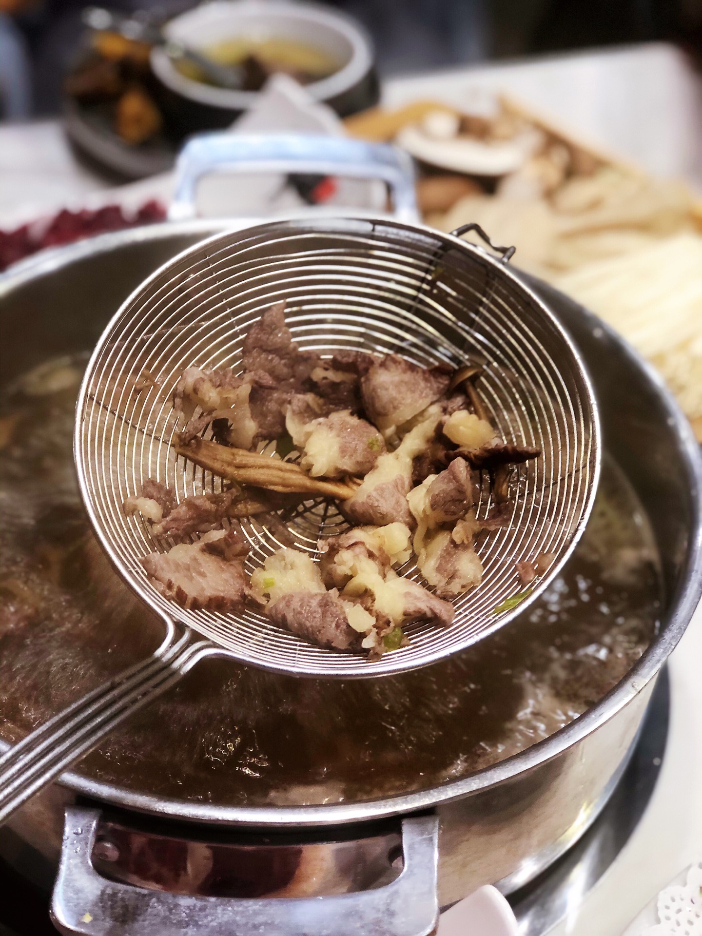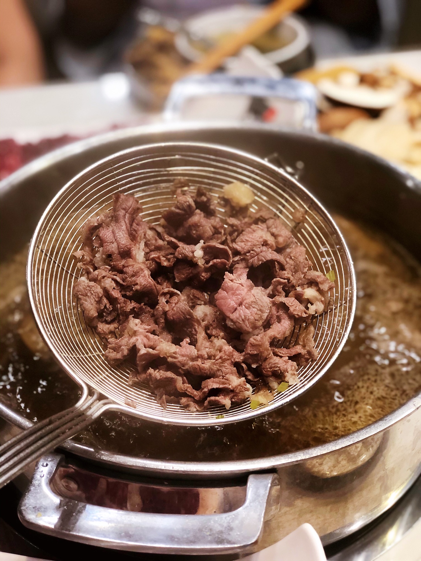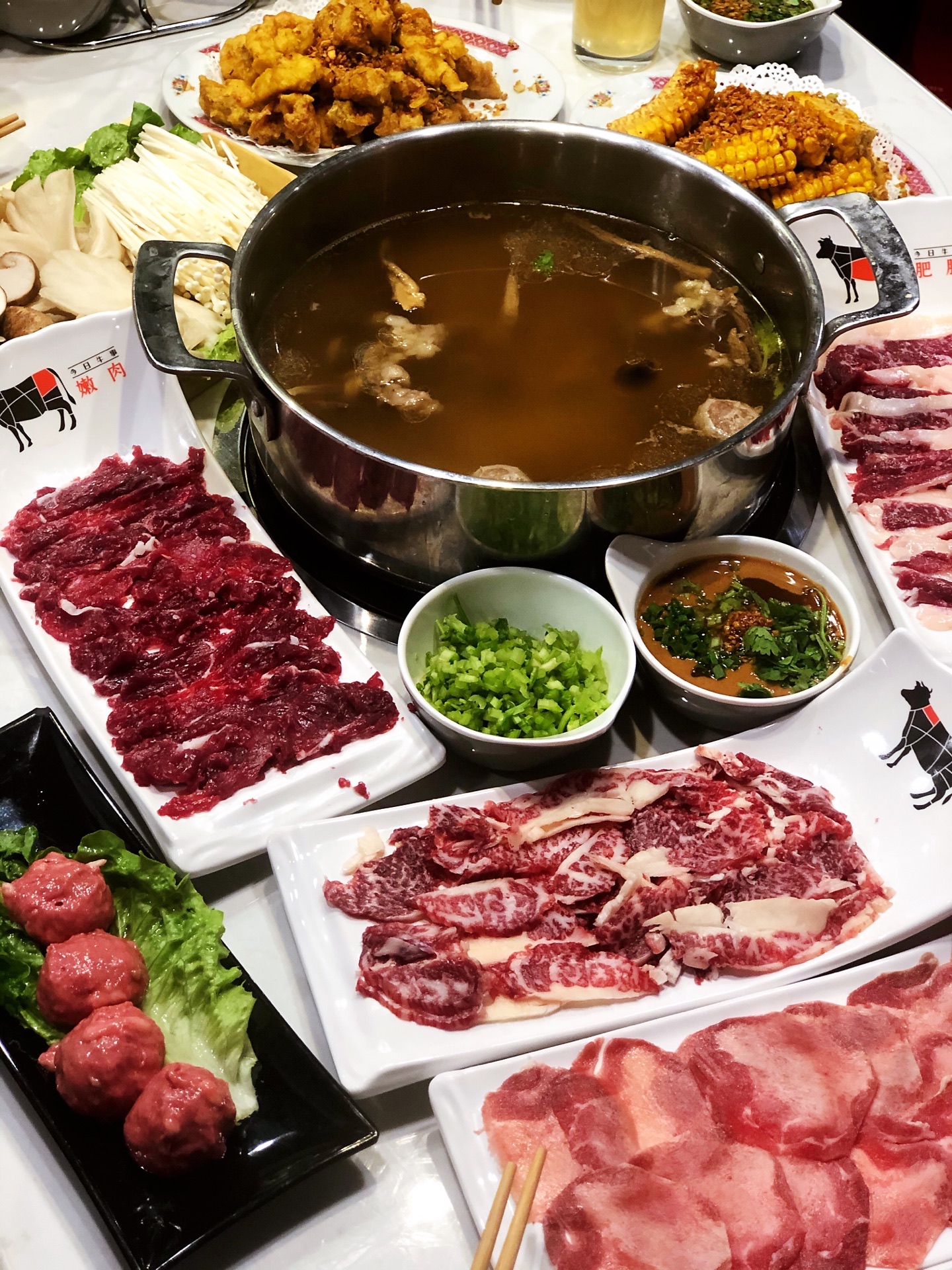 八大菜系里最爱粤系,而潮汕菜又以其发源地拔得头筹。原真本味,品出食材的真鲜,在火锅界也是非常地优秀。🍲一酱一肉一汤,没有繁杂的工序,本味至简,品出牛肉真味道,这就是蛋花今天去吃的这家潮汕牛肉火锅带给我的最大体会。 店里装修得敞亮简洁,入口开放式的厨房,看着大厨们刀起刀落,一副热火朝天的繁忙景象,服务员很耐心的介绍着牛肉每个部位的不同,一遍顾客根据自己的喜好选择食材。 吃前先喝汤,汤底是用牛大骨,牛腩和鹿茸菌熬制而成,烧开后撒上少许葱花,芹菜,汤头纯净清亮,没有多余的杂志,牛肉的鲜香味从舌根部散发出来,不是很冲,绵绵悠长 🐂牛肉是主角,最喜欢他家的五花,又称脖仁,顾名思义,就是牛脖子上的肉。红白相间的大理石条纹透漏着别样的细腻,令人心动。涮至变色即可食用。肉质绵软嫩滑,牛肉油脂特有的那种令人刻骨铭心的香味让人陶醉,在唇齿间化为甘甜,一口接一口,让人欲罢不能。 🥩五花健,小腿或肩胛的腱肌肉,油脂比例没有五花高,入口鲜嫩爽脆,带着一丝嚼劲,一丝韧度,有湿润度,好吃。 🥩吊龙,牛背部的里脊肉,肉质鲜滑精道,肉质十分细腻,入口鲜嫩弹牙,香滑可口,咀嚼起来几乎不用力气 总体很不错的潮汕牛肉店,肉的品质非常高,价格也很公道,以后有机会会再去。
