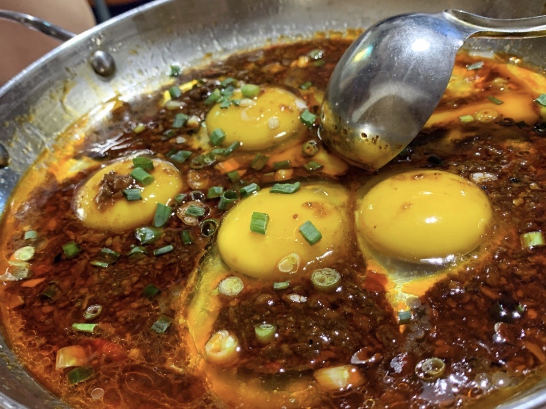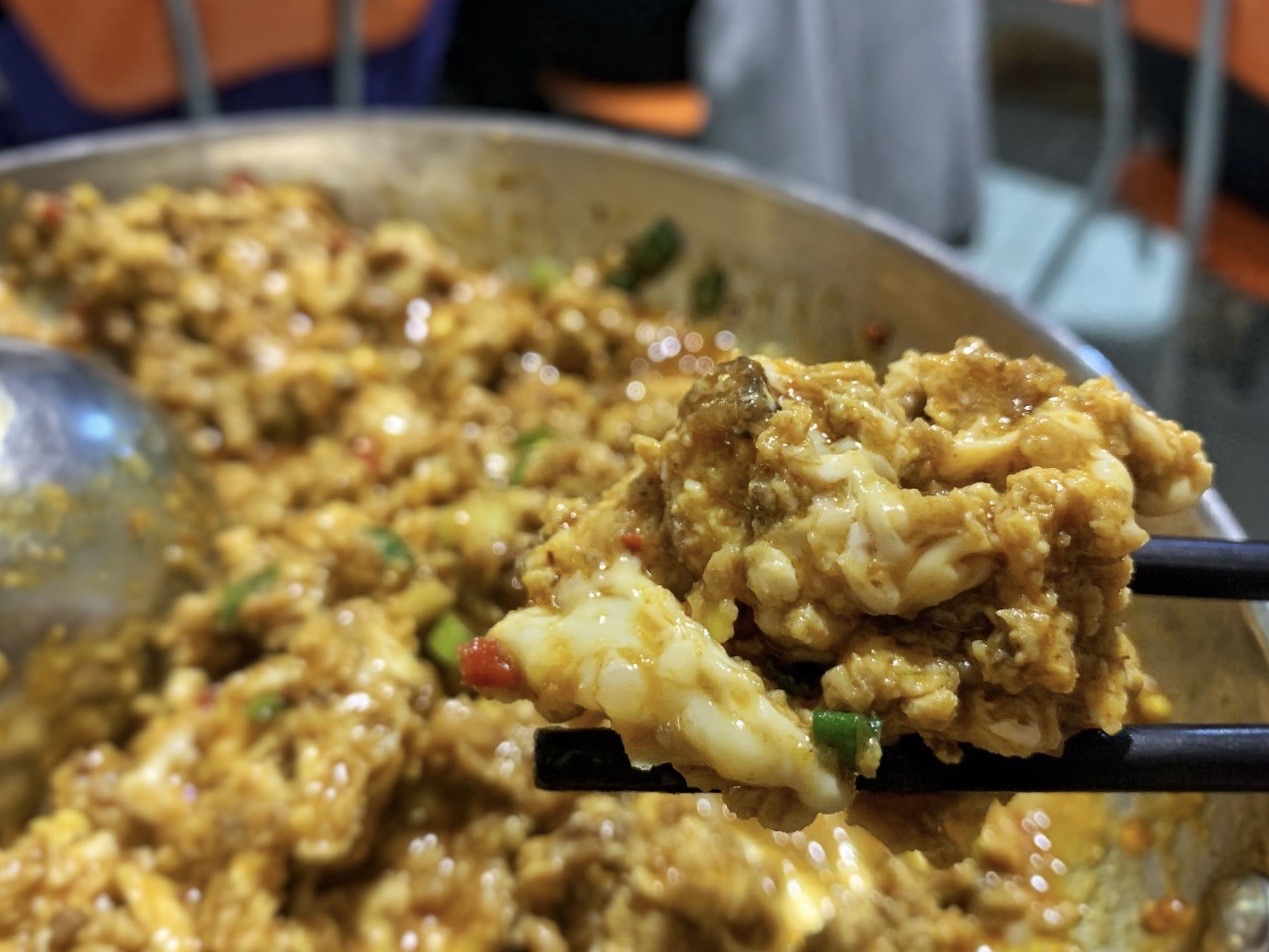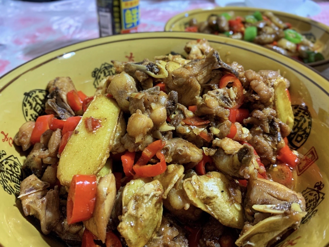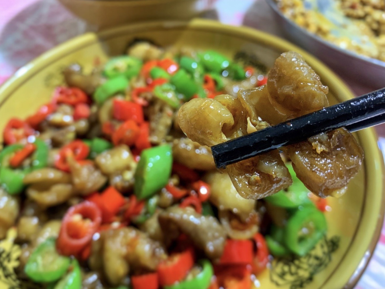 餐馆真的很有那种土菜馆的氛围 老板娘真是特别麻利的一个人 坐到就会来帮点餐 菜单很简单而且价格很美丽 牛肉沫生煎蛋 这个真是桌桌一个小炉子 这道上菜倒也快 加了火就记得得不停翻拌 不然容易结底 老板娘也会过来帮着翻 然后就提醒我们抓紧吃现在口感最好 本想等菜齐的我就先尝了一下 呜呜一口气吃了半碗饭 太香了 一份里面四五个鸡蛋拌着香辣牛肉沫 还有点点香菇丁 咸香滑嫩的口感 真的很棒 爆炒肥肠 毫不夸张说这家的这个肥肠是我这二十多年吃到过数一数二的了 处理的很干净无异味不用多赘述 主要是口感我很喜欢 切的都很小 外皮略焦像是被煎了一下 内里偏软糯 即使放了很多辣椒但一口下去不会很辣 真实的Q弹有嚼劲 我真情实感的推荐 老姜炒鸡 虽然配的是老姜但感觉炒的是小仔鸡 鸡块都剁的很碎 倒也是方便了入味 姜的味道很香 整体口感鲜且咸 微辣吧 也是下饭好帮手 湘菜基本是没有什么招牌汤的 我们也就配了椰汁 平时是不爱喝椰奶的 但饭菜咸辣 一搭倒也舒服了 最后想一提的是 他家的环境真的很一般 就是老式圆桌 桌桌很近 整体环境也是嘈杂且热闹 正好赶上我们后面一桌中年人在喝酒吃饭聊天 有种婚宴的感觉…啊哈哈
