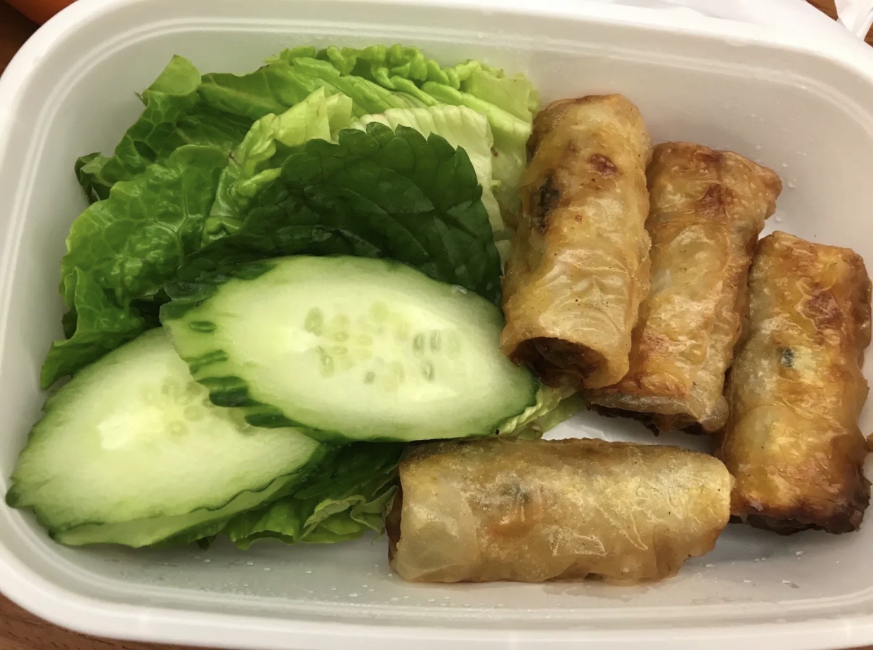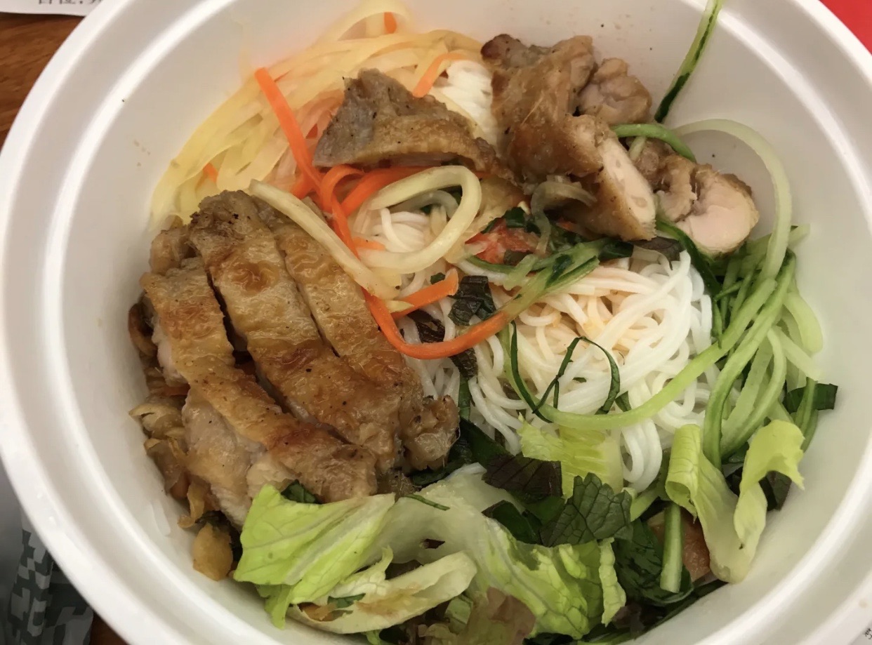订了这一家餐厅的外卖,鸡扒捞檬粉特别好吃,我自己本来就很喜欢吃越南菜的,也尝过不少的越南粉,这里的出品不错。一个大碗装满的檬粉,配了一小份酸甜汁(喜欢多些汁的要备注一下),因为我是倒了两份酸甜汁下去才够味道,我觉得太干了不太好吃嘛。由于檬粉是冷的,所以也不怕食物凉了,鸡扒有很多块,都是大大块的,香茅烤鸡扒,很香,配上香叶、生菜丝等一起吃,味道太棒了。春卷的话,来到已经都软皮了,不脆了。