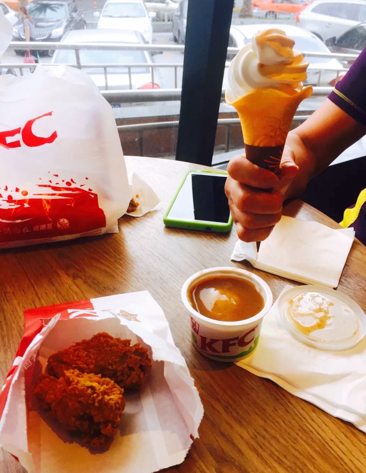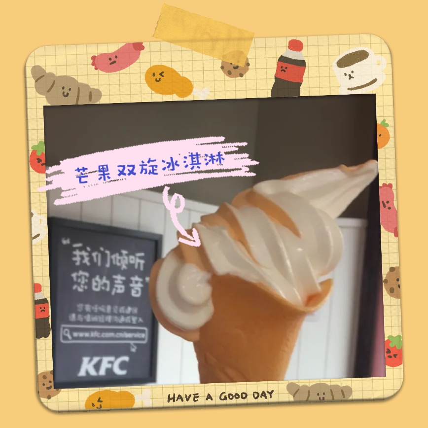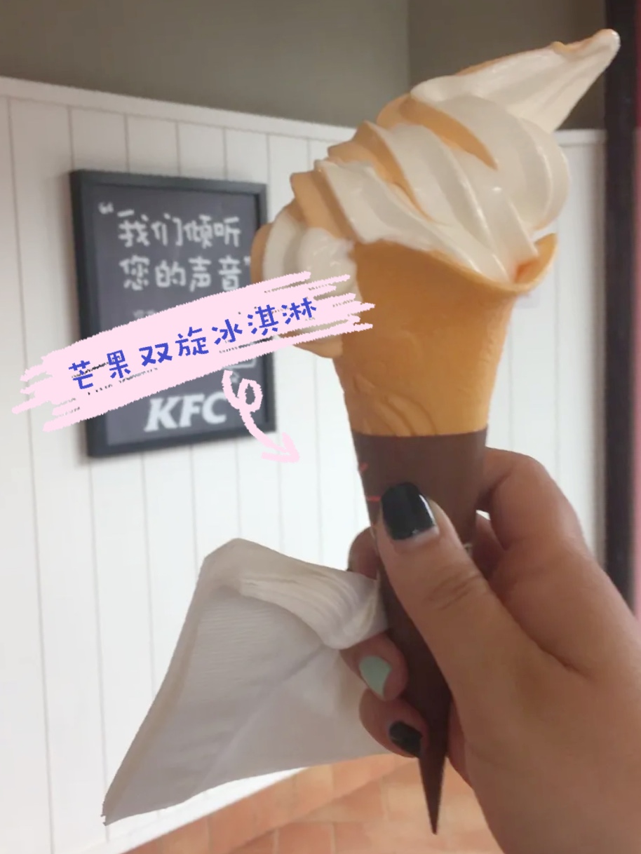 🌈芒果双旋冰淇淋 [爱心]外观: 这款芒果双旋冰激凌也是肯德基限时推出的甜品。芒果的黄色和香草的白色拼接在一起相当有食欲。 🧡口味: 淋芒果酱不同,这种直接拌入芒果粉的冰激凌更入味,和原味香草搭配在一起,不甜不腻,奶味香醇,还是非常清爽好吃的。 💛性价比: 肯德基在快餐领域的性价比还是很高的,每次推新都会伴随促销活动,还是值得尝试的。