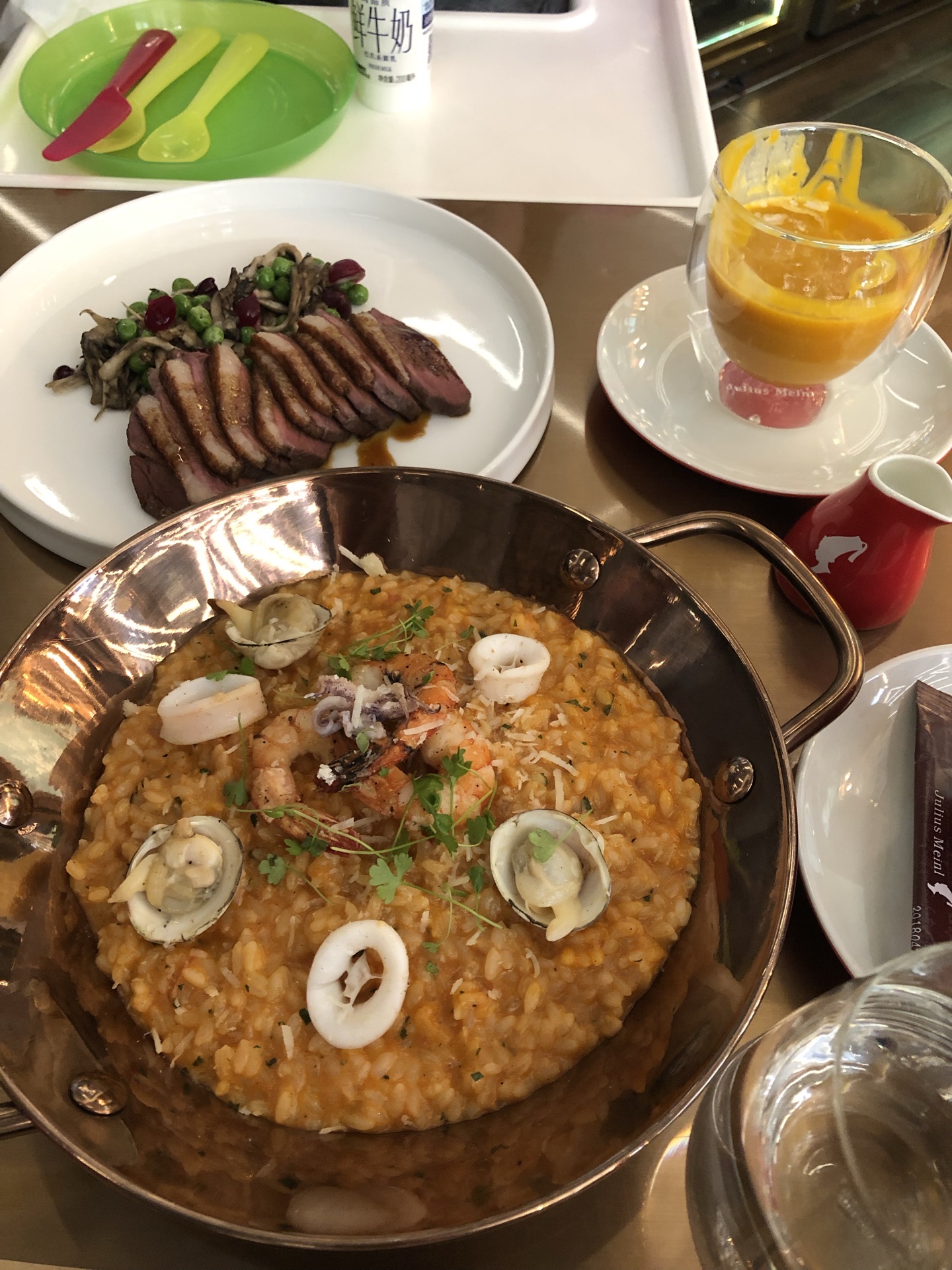...瓜汤🎃味道都不错,个人觉得主菜海鲜烩饭比鸭肉好吃😋,甜品提拉米苏味道很赞,咖啡☕️也很香~