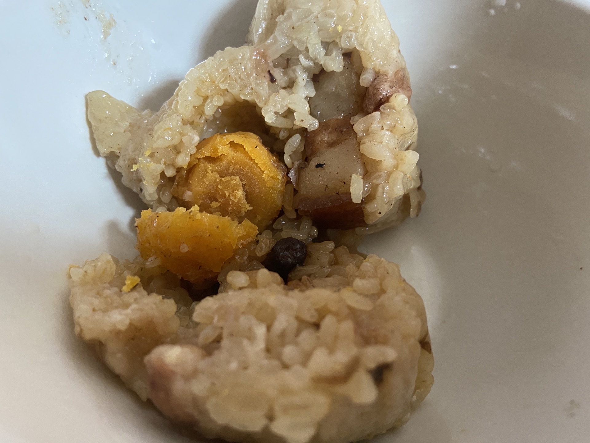 程班长台湾美食的粽子需要提前预定,30块钱一颗,里面有整颗的咸蛋黄、香菇、一块五花肉,典型的台湾粽子