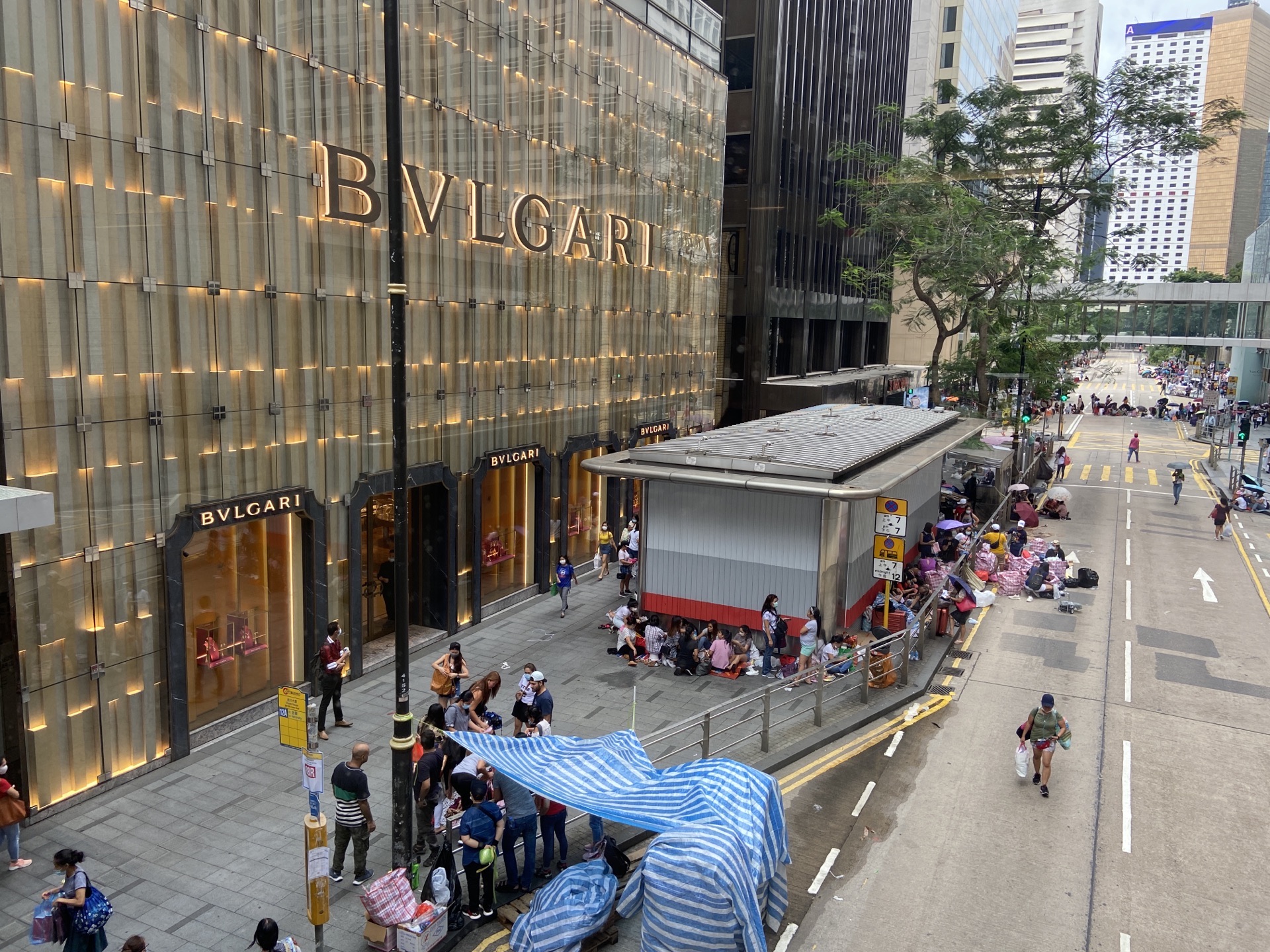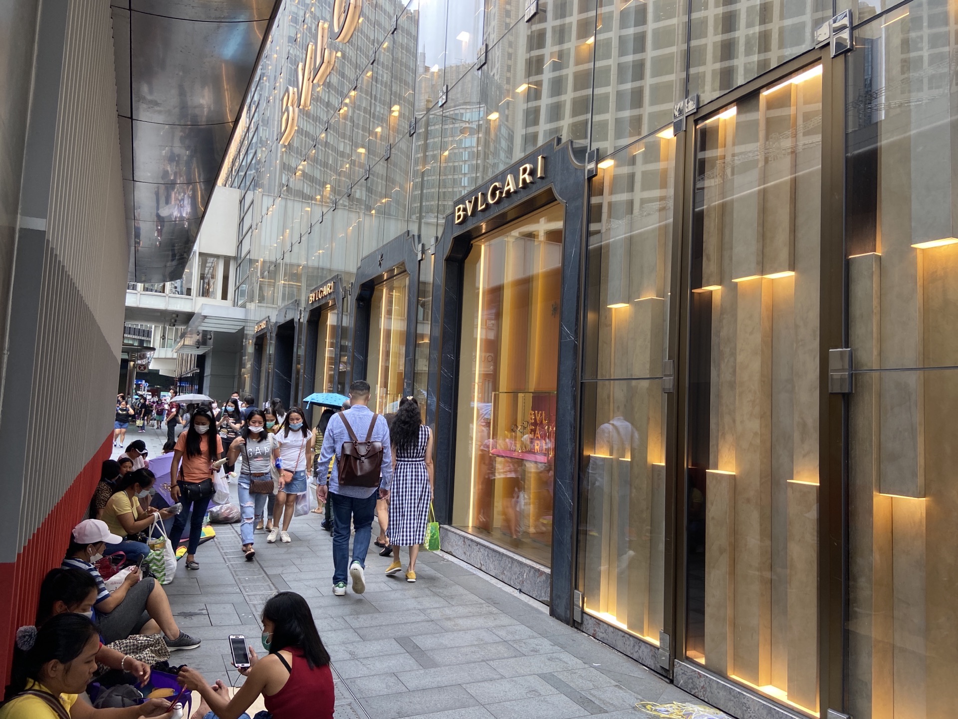 从置地广场走天桥到历山大厦,继续走天桥就能来到遮打大厦,站在天桥上就能看到遮打宝格丽那华丽丽金灿灿的外墙。但是再定睛看一下,如此华丽的店铺外,怎么东倒西歪又是躺又是坐的一堆人呢,甚至还躺到了马路上。其实这样的场景每周日都在中环上演,为了让香港数量众多的外籍帮佣们在周日休息的时候可以与老乡聚聚、又不用花钱,所以到了周日在香港各地都能看到相当多的外籍帮佣三五一群的聚着。中环是聚会的大本营 ,宝格丽前面的遮打道在周日还会特别禁止机动车通行,就是为了这些人有足够的空间呆着。这也形成了强烈的对比:橱窗里随便一件饰物动不动就是几十万甚至上百万,而店门前的那些人,连去咖啡馆买杯咖啡吹吹空调都舍不得。